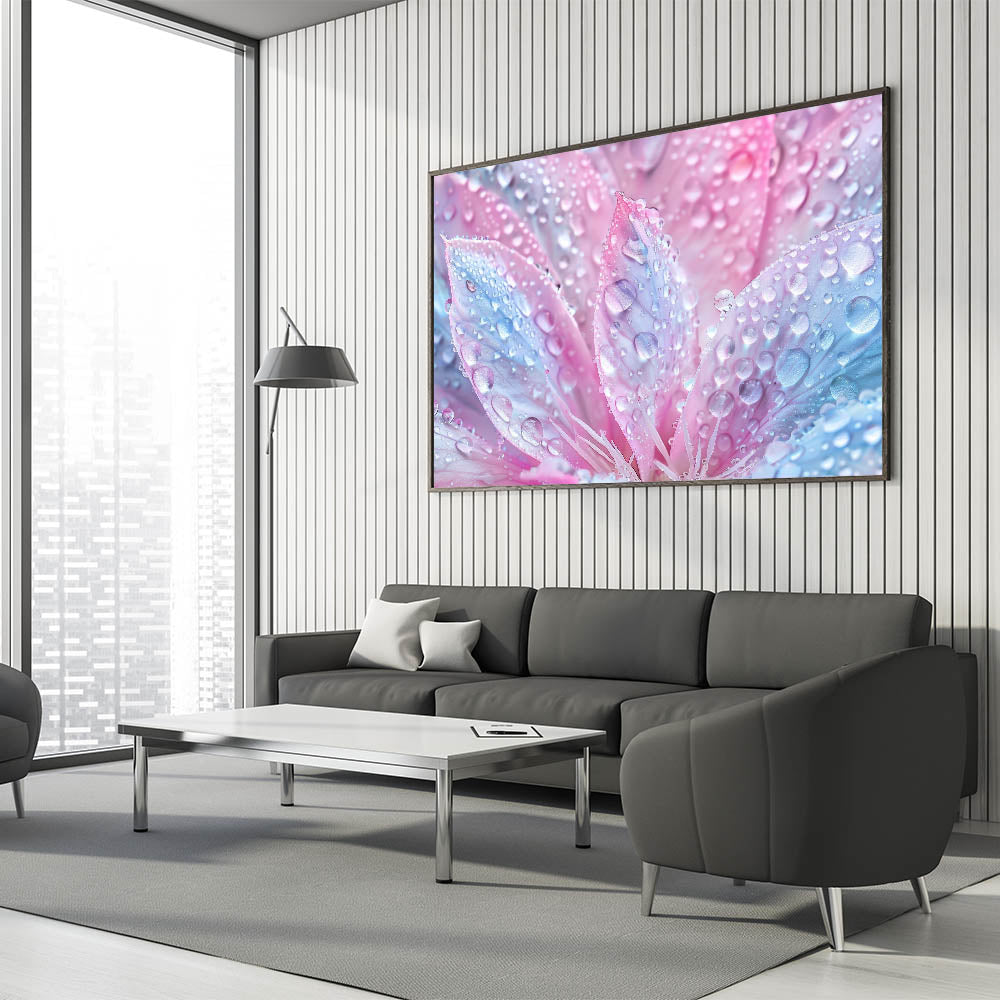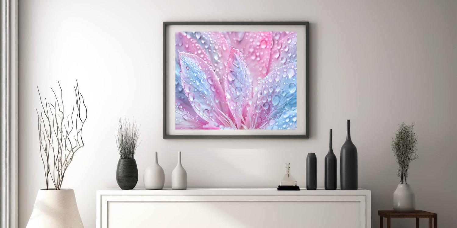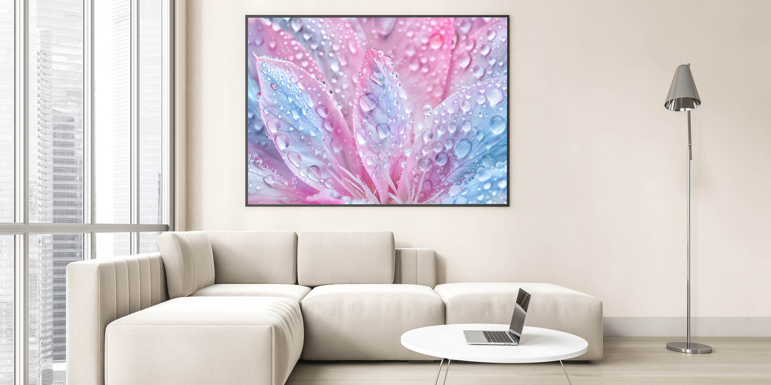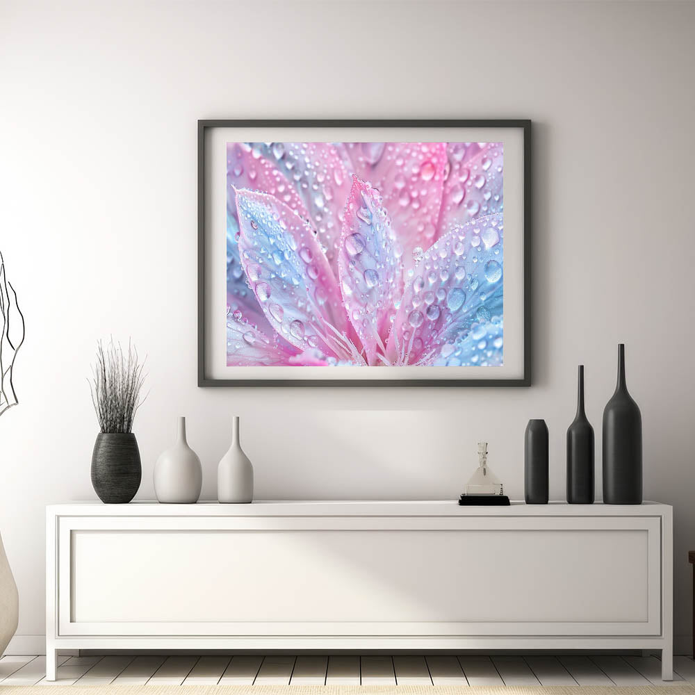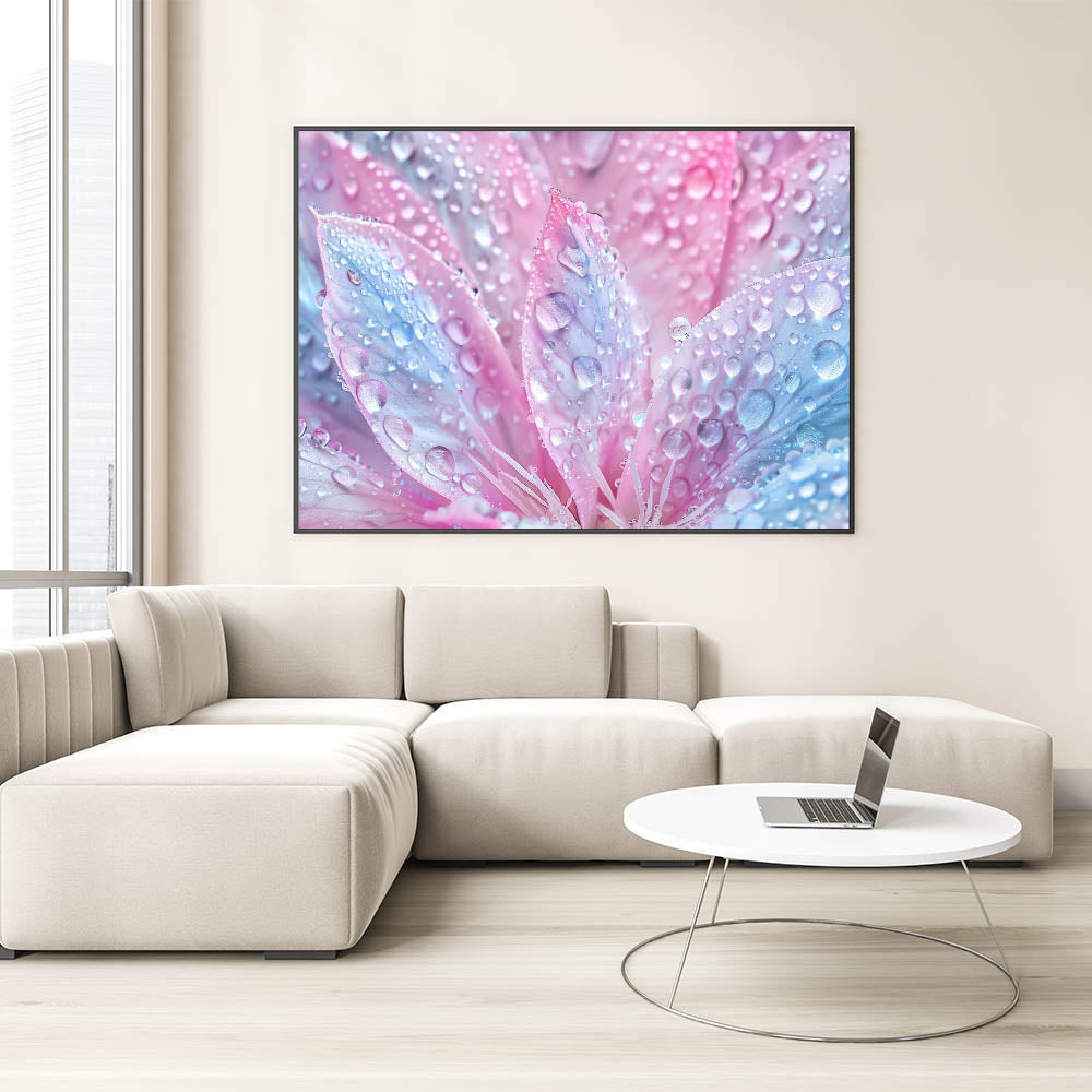 Brighten your living space with the elegance of this floral water-inspired wall art. This mesmerizing nature close-up features delicate water droplets on pastel-colored petals, blending soft pink and blue hues for a calming and soothing aesthetic. The intricate details and refreshing colors make this piece the perfect addition to any room, infusing your space with beauty and tranquility.