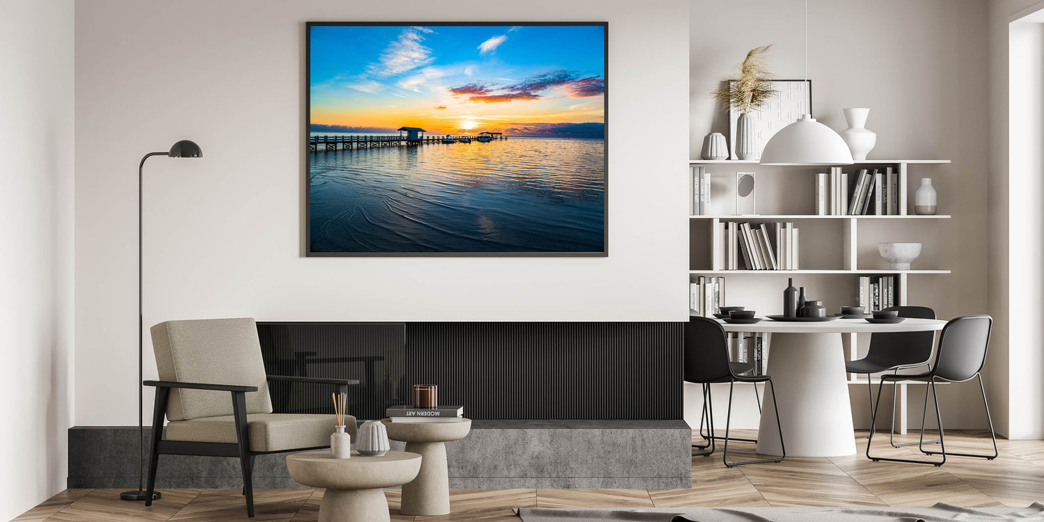 This Florida Keys dock sunset wall art is perfect for adding a serene tropical vibe to your decor. Elevate your space with this beautiful representation of a quiet dock and a glowing sunset.