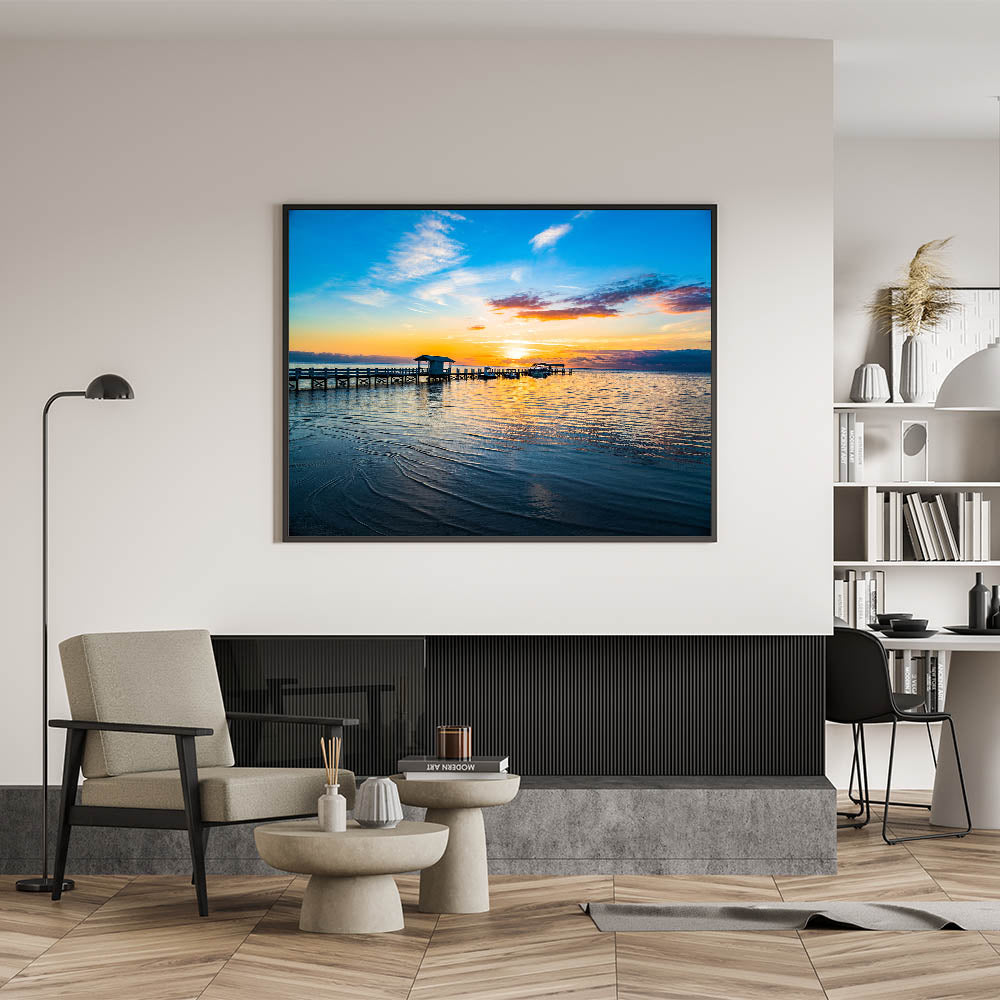 Bring the beauty of the Florida Keys into your home with this stunning dock sunset wall art. Featuring a tranquil dock extending into the calm waters under a vibrant sunset, this piece perfectly captures the serenity and peace of coastal life. The warm glow of the setting sun combined with the rich colors of the sky and water creates an inviting, tropical atmosphere.