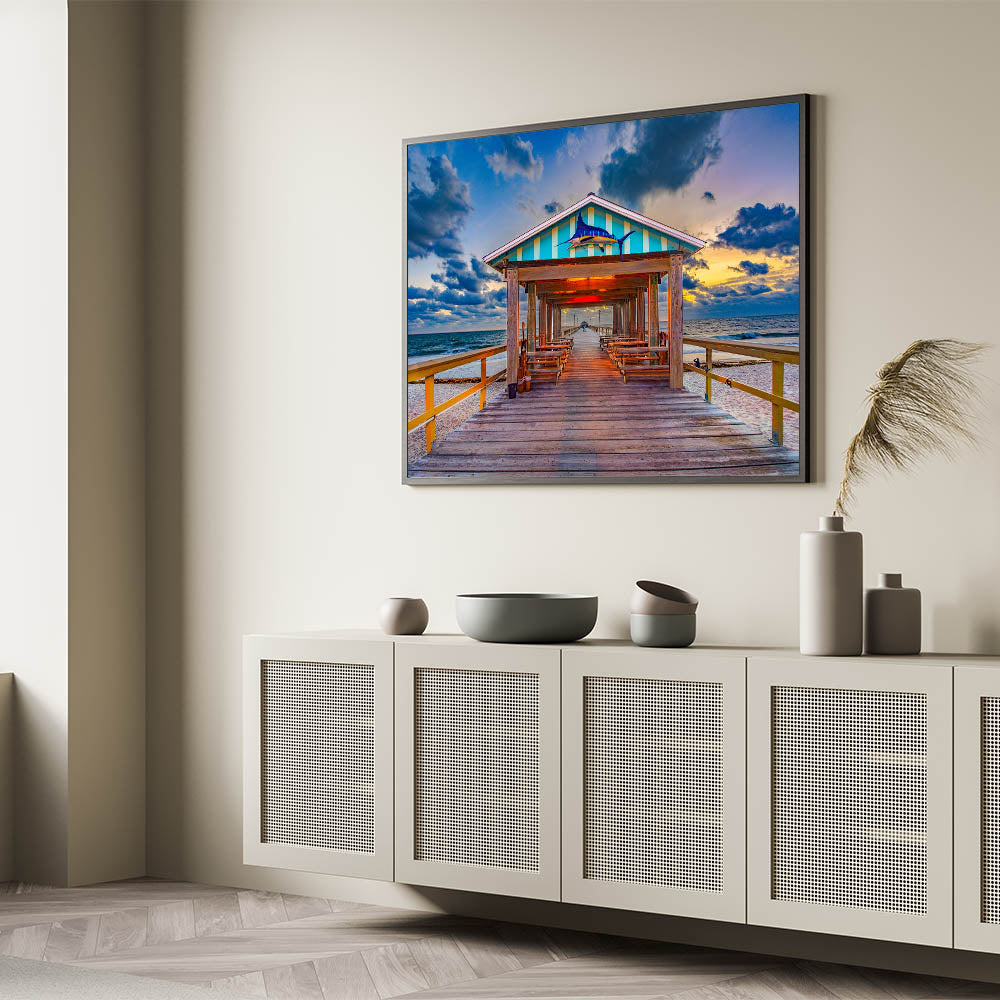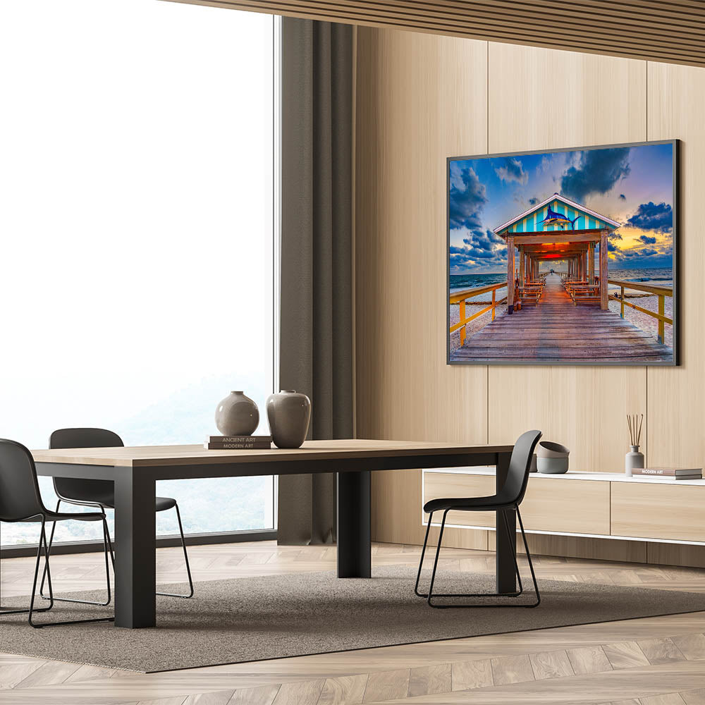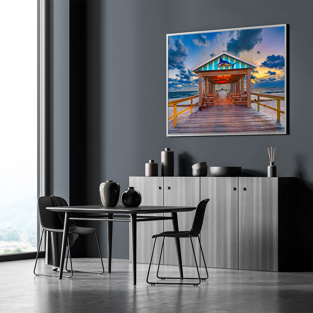 This Fort Lauderdale Pier Wall Decor is the perfect way to bring a sense of serenity and coastal charm to your home or office. Available in various sizes and materials, this artwork adds a touch of the ocean's beauty to any space.