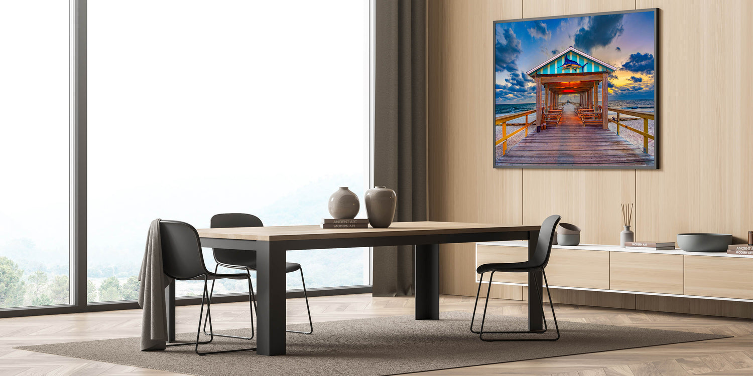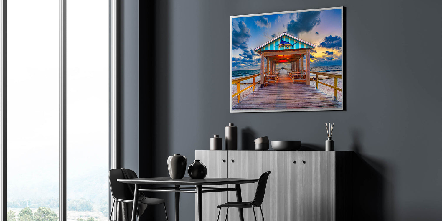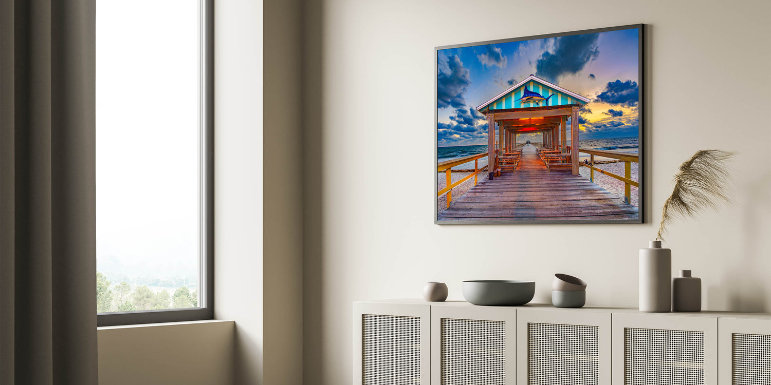 This Fort Lauderdale Pier Wall Decor is the perfect way to bring a sense of serenity and coastal charm to your home or office. Available in various sizes and materials, this artwork adds a touch of the ocean's beauty to any space.