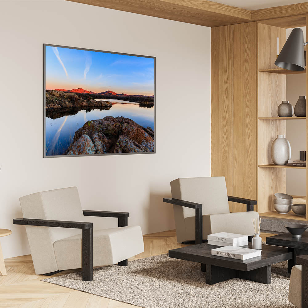 Discover the breathtaking beauty of Oklahoma's mountainous landscapes with this stunning piece of wall art. Featuring a tranquil lake reflecting the warm glow of the setting sun on rugged mountains, this artwork brings a sense of peace and natural beauty into any space. The vibrant colors and serene composition make this framed Oklahoma art perfect for enhancing living rooms, bedrooms, or offices. Available in various formats, including stretched canvas, acrylic glass, and framed prints, this unique Oklahoma landscape art offers flexible options to suit any home decor style.