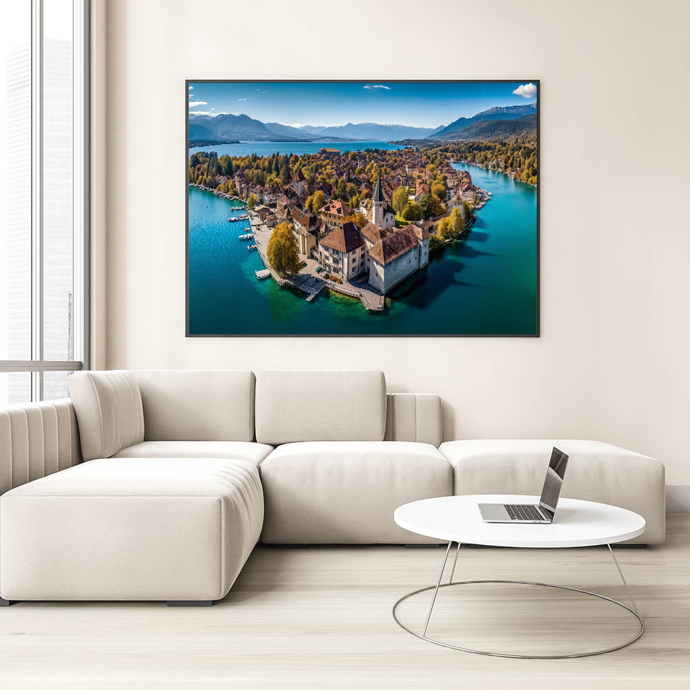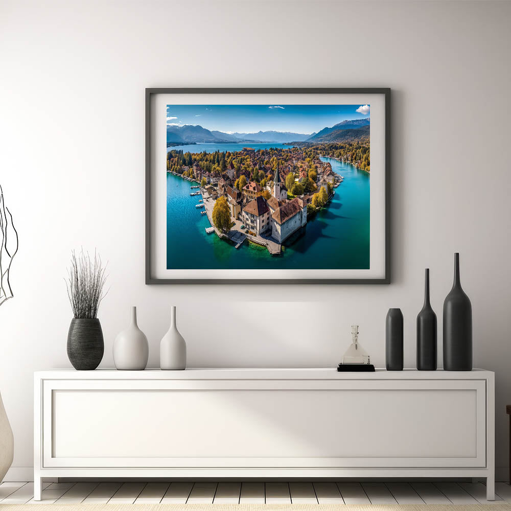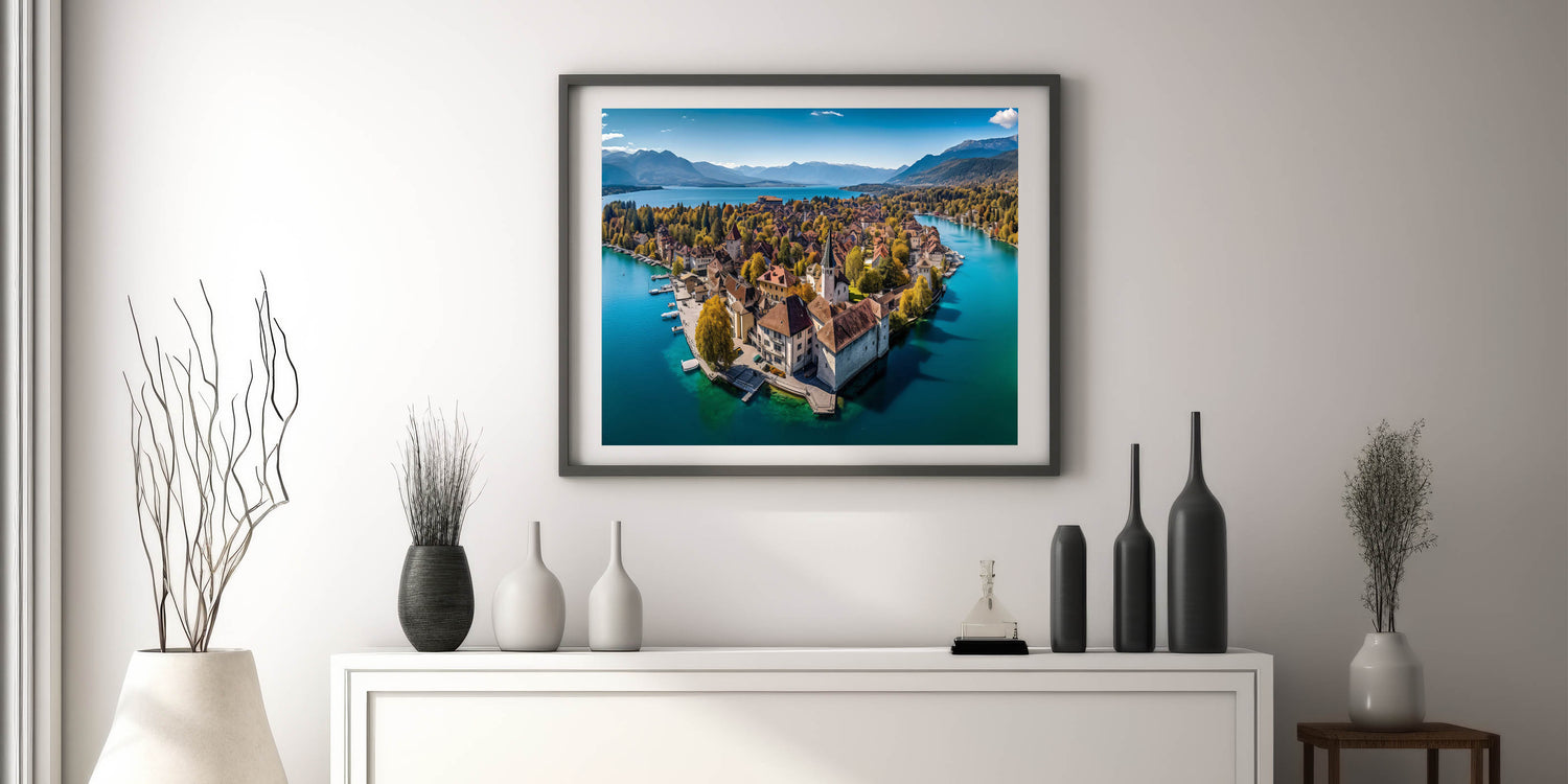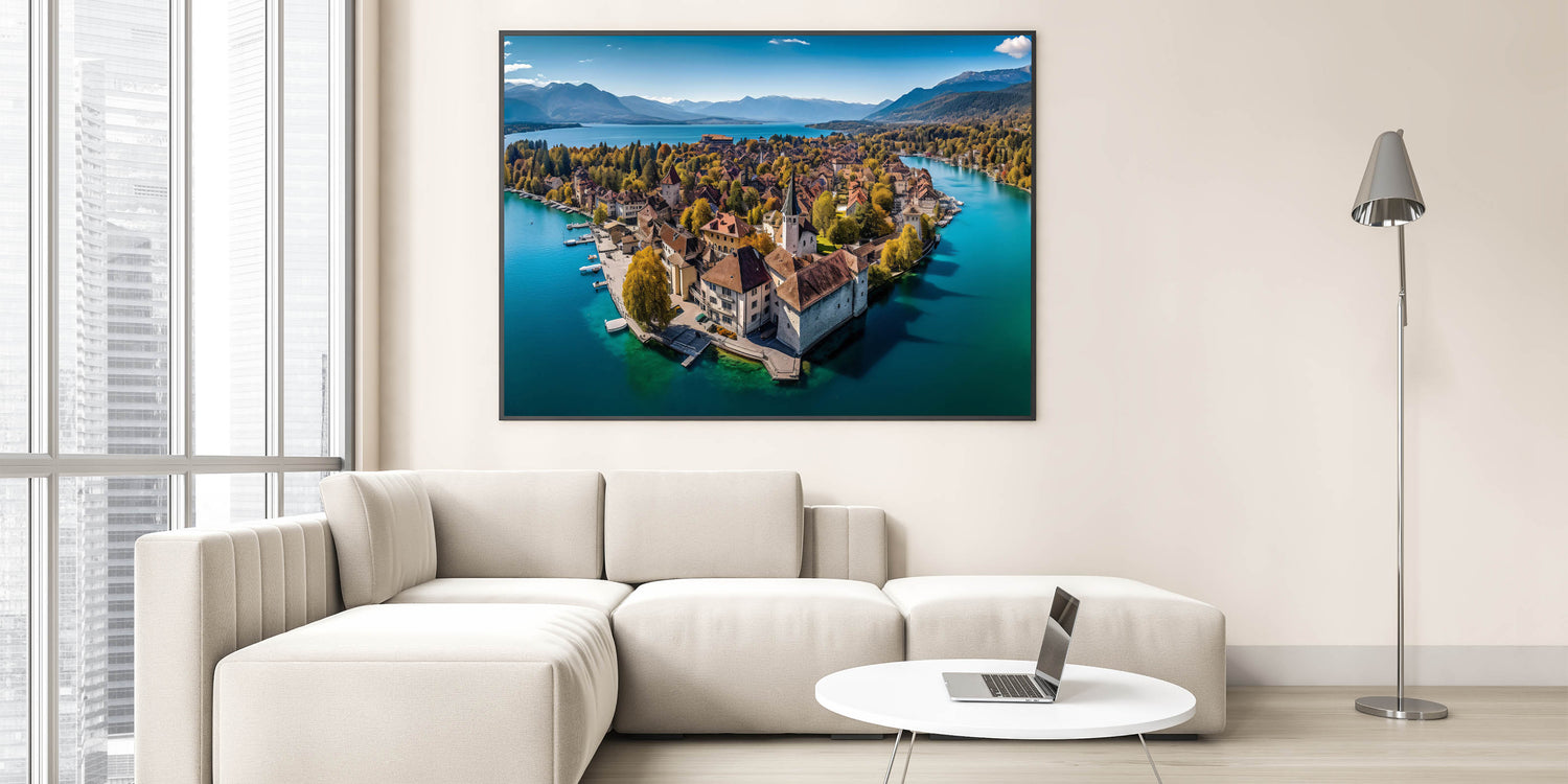 Capture the breathtaking beauty of the French Alps with this serene wall art, featuring a picturesque village nestled on the shores of a tranquil lake. Surrounded by golden autumn foliage, this scenic landscape blends the charm of French alpine life with the peacefulness of nature. The crystal-clear water reflects the vibrant colors of the trees and rooftops, creating a harmonious and calming view that will elevate any space in your home.