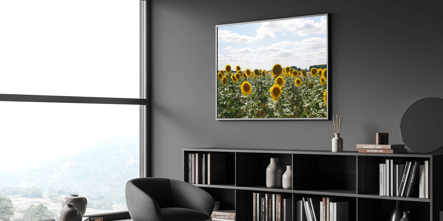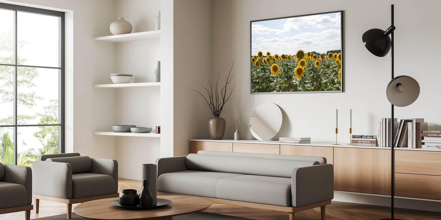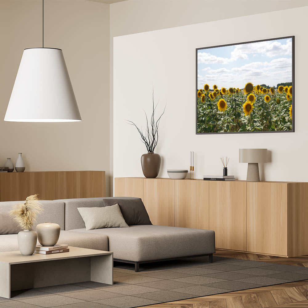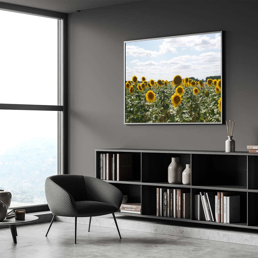 Brighten up your space with the vibrant beauty of this French countryside wall decor. Featuring a stunning sunflower field under a bright sky, this artwork captures the essence of Provence’s natural charm. The sunflowers' golden hues and the soft blue sky evoke a feeling of warmth and tranquility, making it the perfect piece to bring the joy of nature into your home. Whether placed in a living room, dining area, or office, this art piece brings a slice of Provence to any space.
