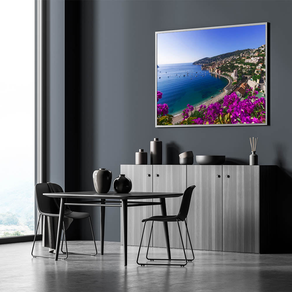 Immerse yourself in the captivating beauty of the French Riviera with this exquisite piece of wall art. This stunning view of the Cote d'Azur captures the azure waters of the Mediterranean, dotted with sailboats and lined by a charming coastal town. Vibrant purple flowers in the foreground add a pop of color against the deep blues of the sea and sky, creating a striking contrast that brings the magic of the South of France to life. This Mediterranean landscape art is perfect for those looking to bring a serene coastal atmosphere into their home.