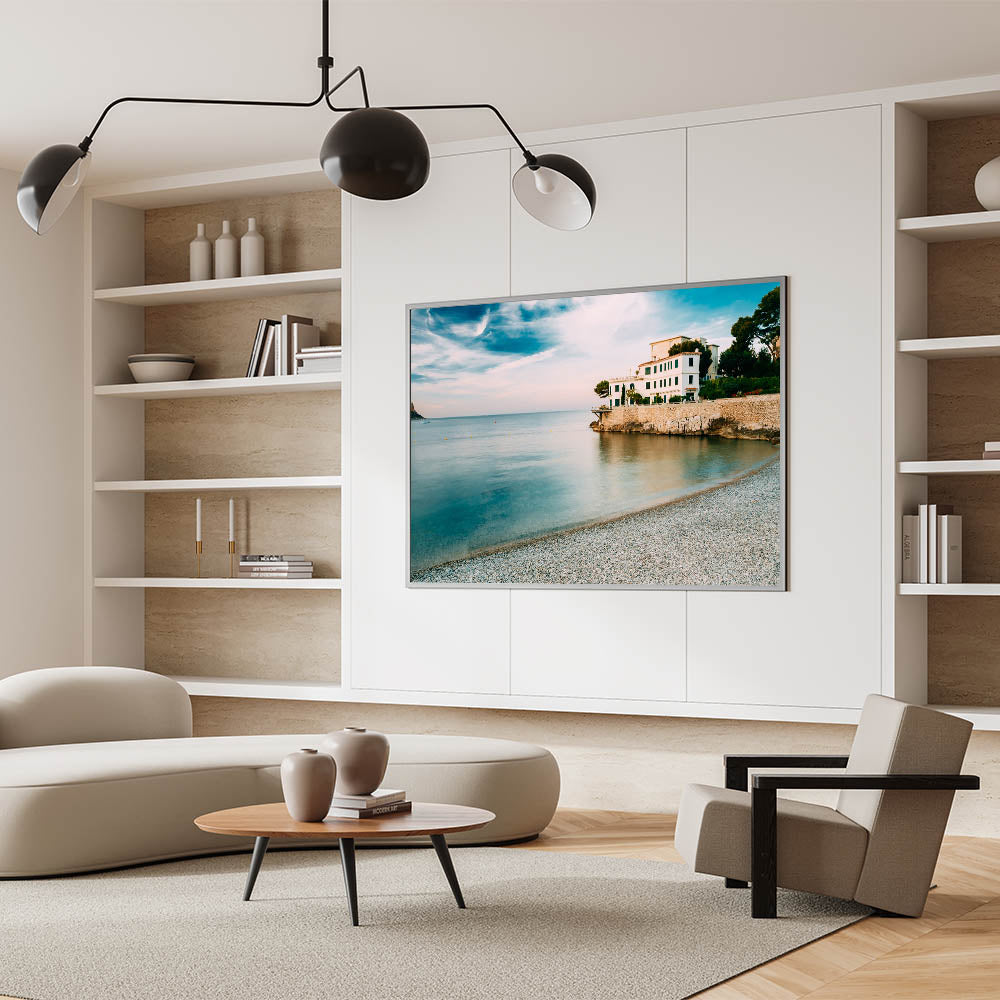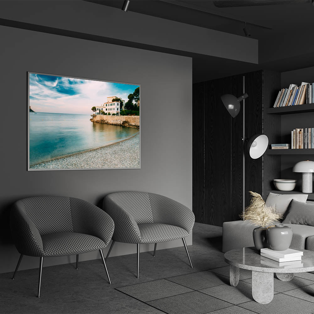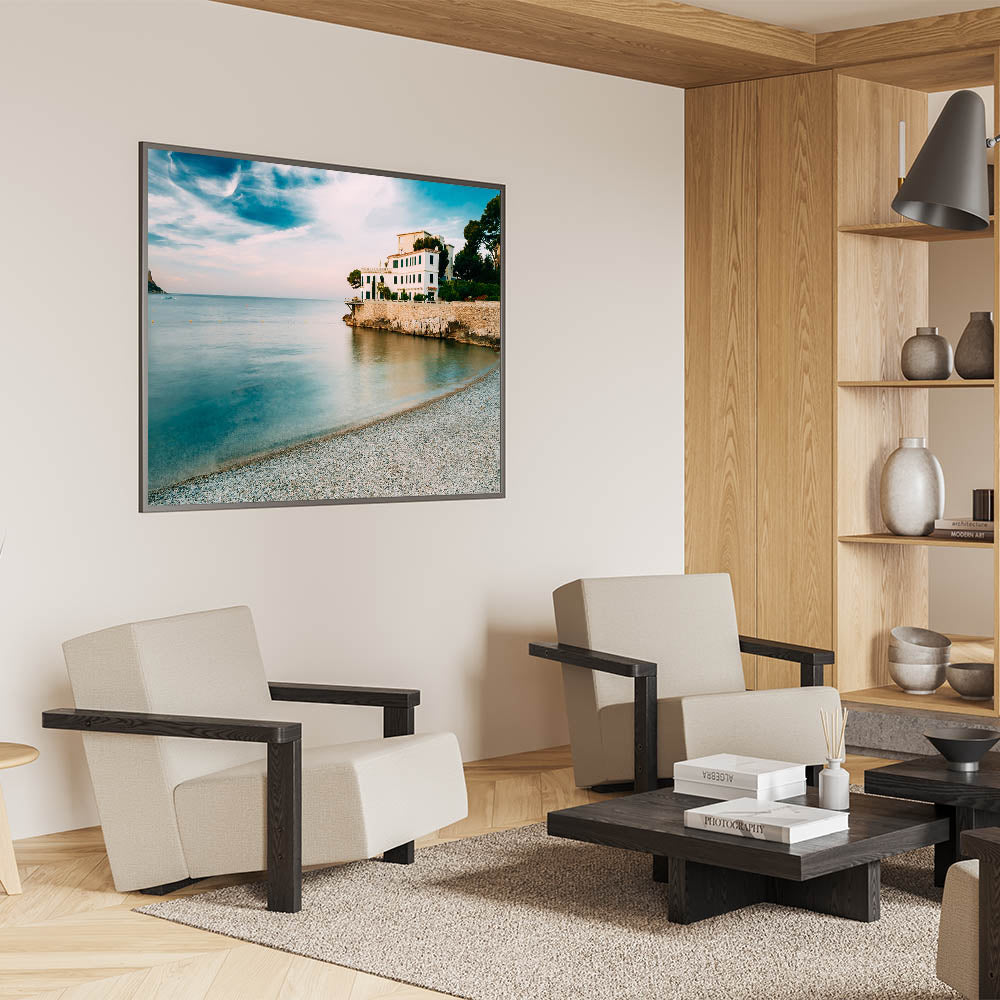 Transport yourself to the tranquil shores of the French coast with this beautiful French scenery canvas. This stunning artwork features a peaceful villa perched on the edge of the sea, with calm waters and a serene sky stretching across the horizon. The soft hues of the ocean blend with the gentle colors of the sky, creating a soothing and elegant ambiance. Perfect for adding a coastal touch to your decor, this piece captures the timeless beauty of the French Riviera.