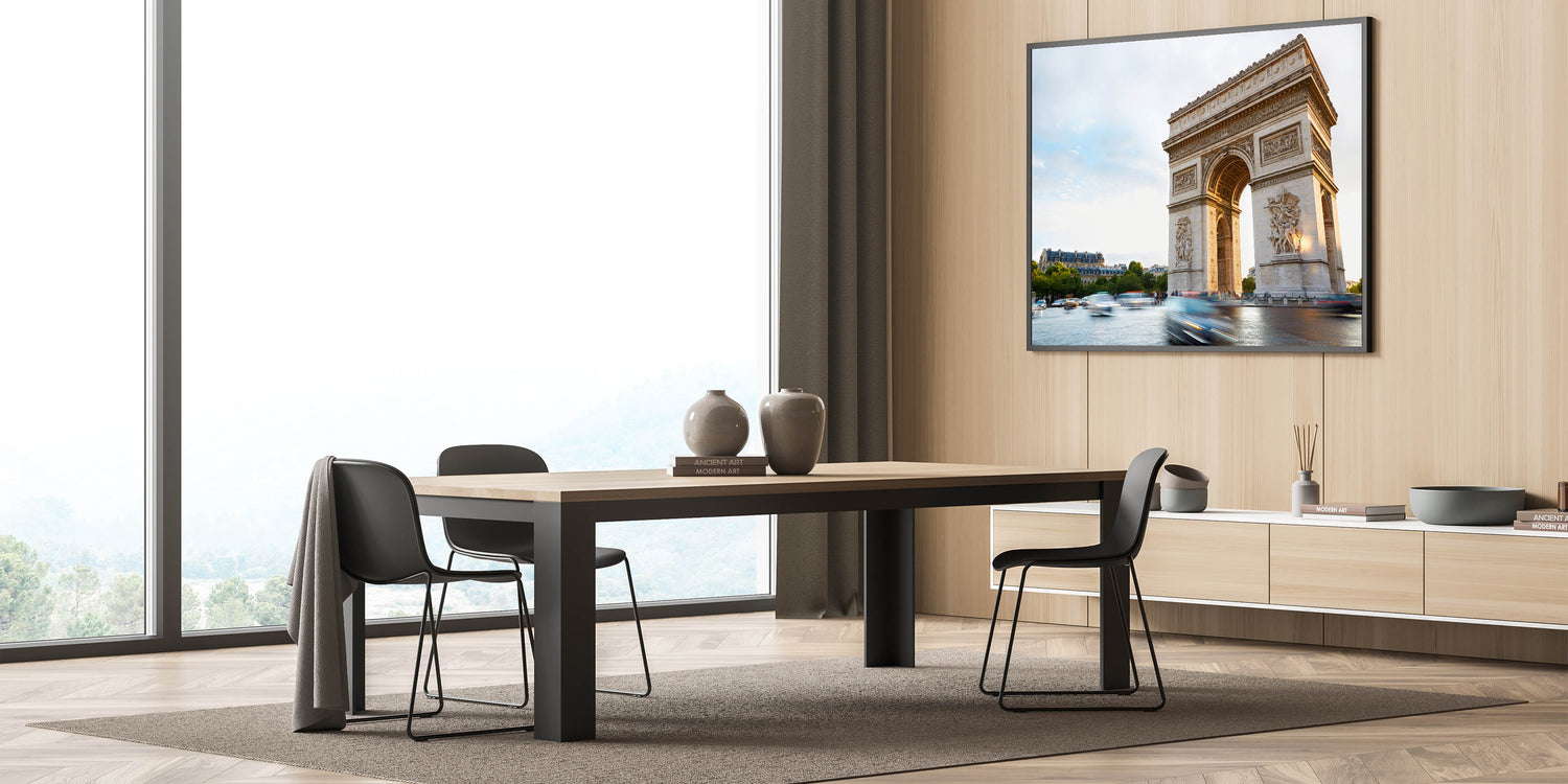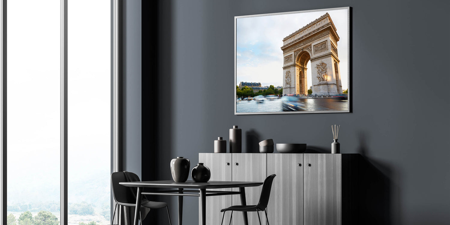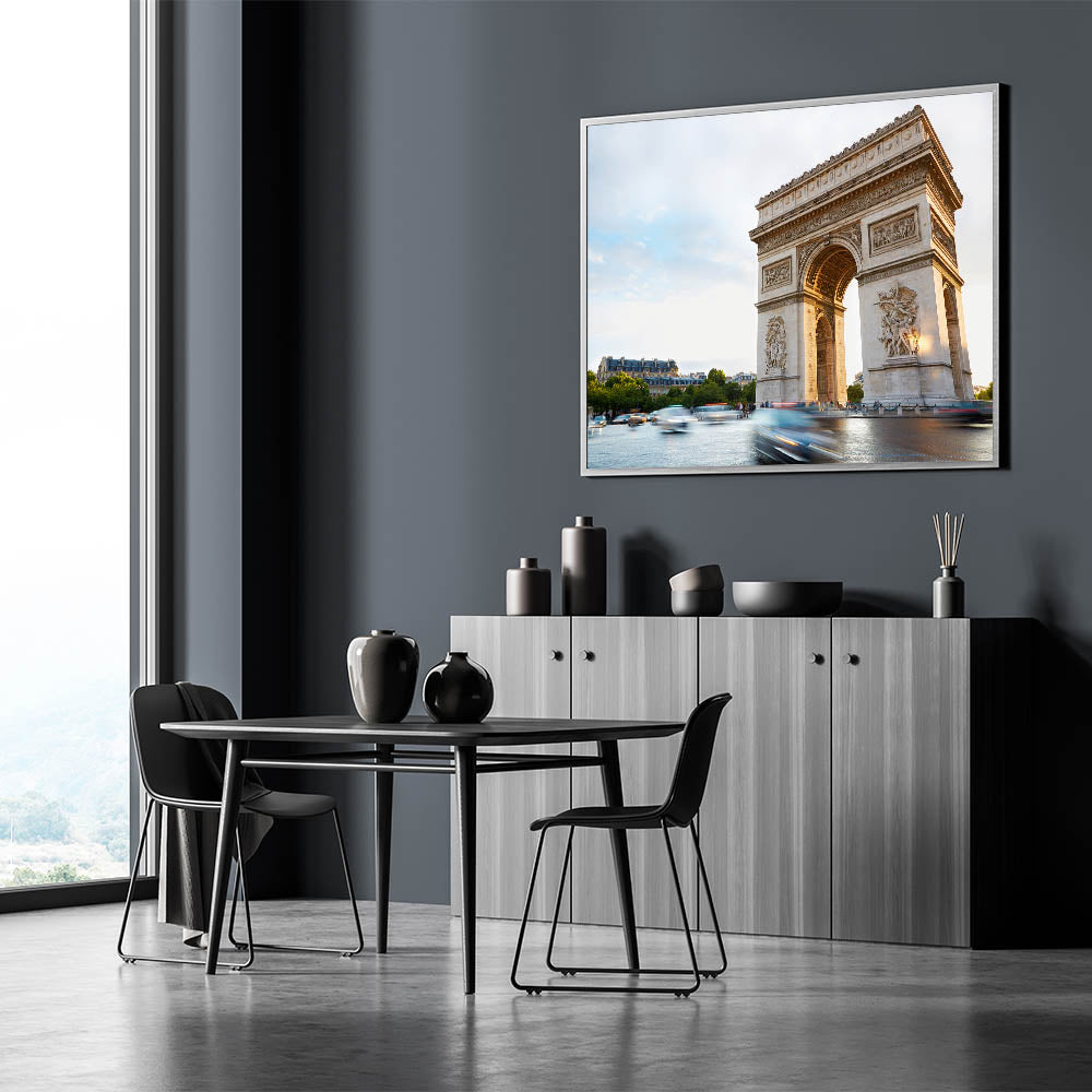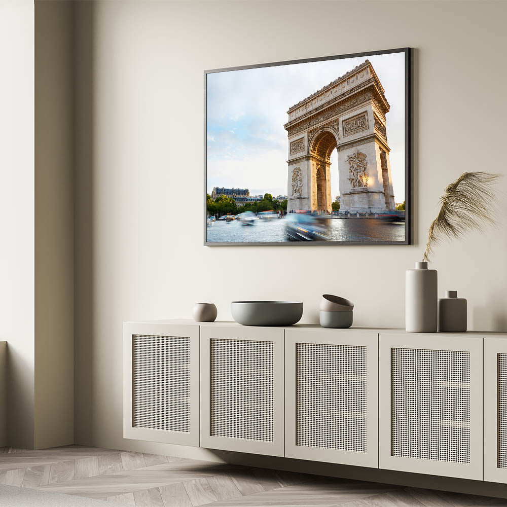 Add a touch of timeless Parisian elegance to your home with this stunning Paris wall art, featuring the majestic Arc de Triomphe captured in its full glory. The beautiful daylight contrasts with the soft motion blur of the bustling traffic, creating a captivating sense of movement and life in this iconic Paris landmark. Whether you're looking to enhance your collection of Paris canvas prints or add a statement piece to your room, this artwork offers both style and sophistication.
