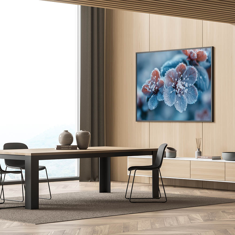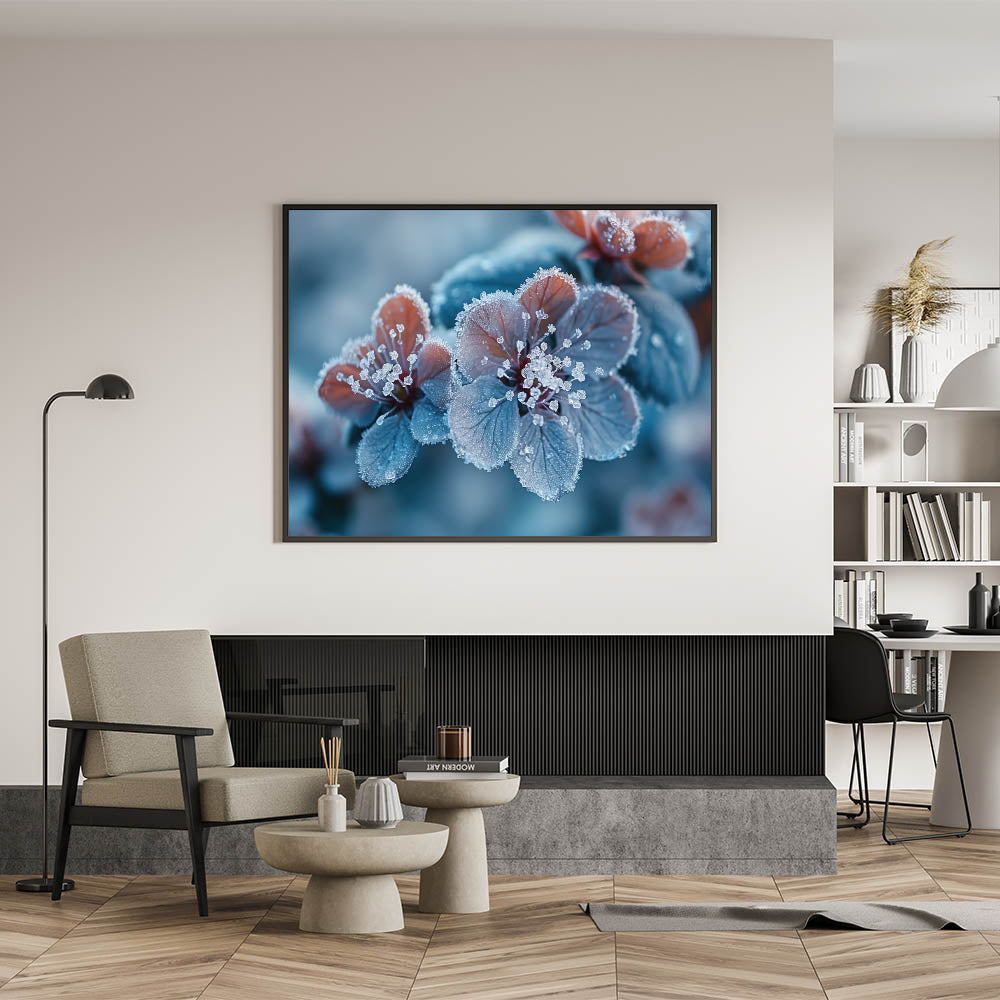 - Unique Feature: Captures the delicate frost patterns over vibrant blue and red petals, adding a serene yet dynamic feel.