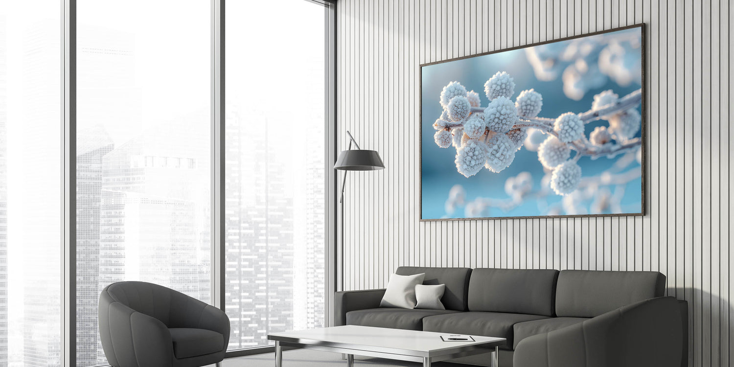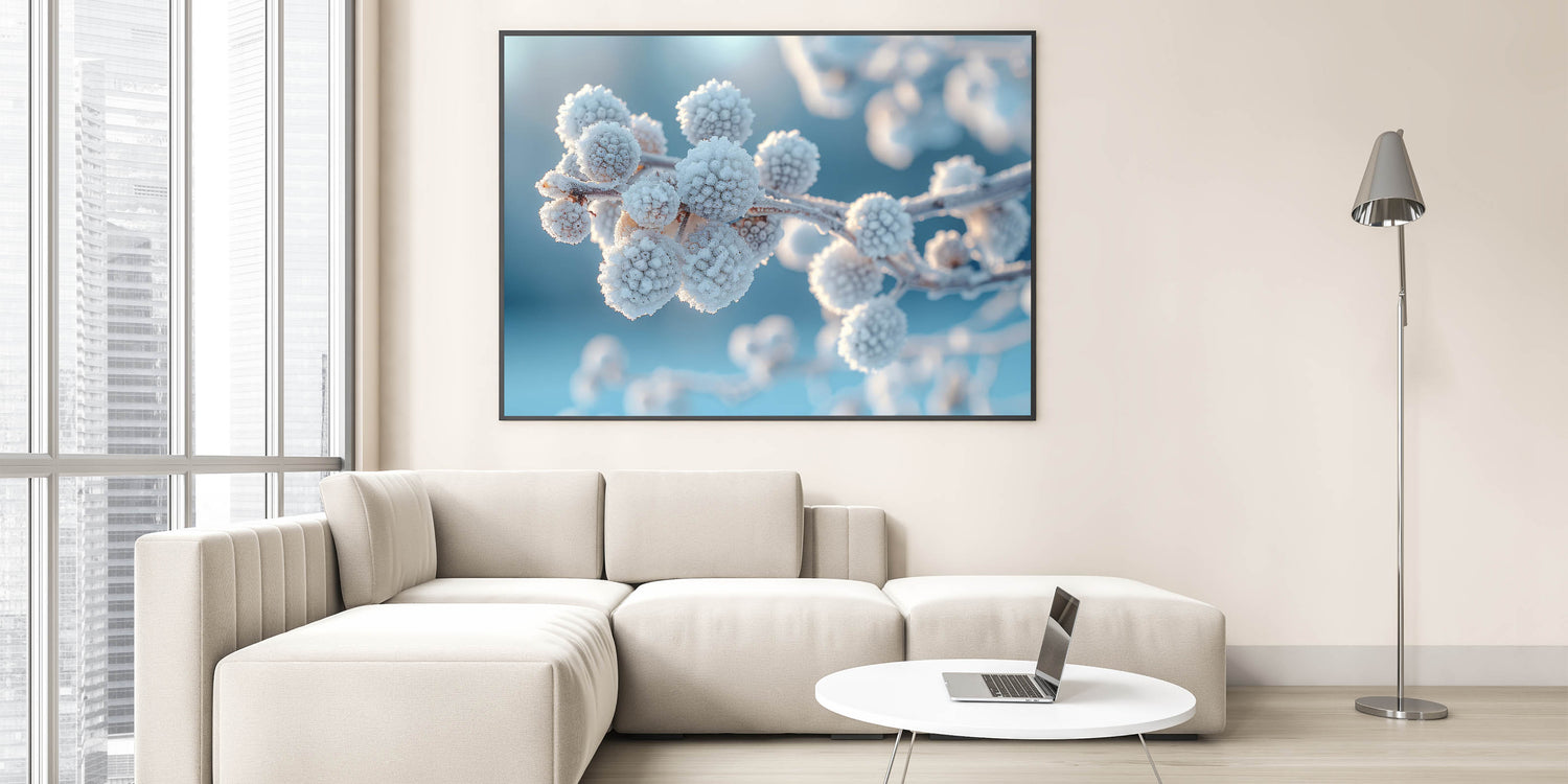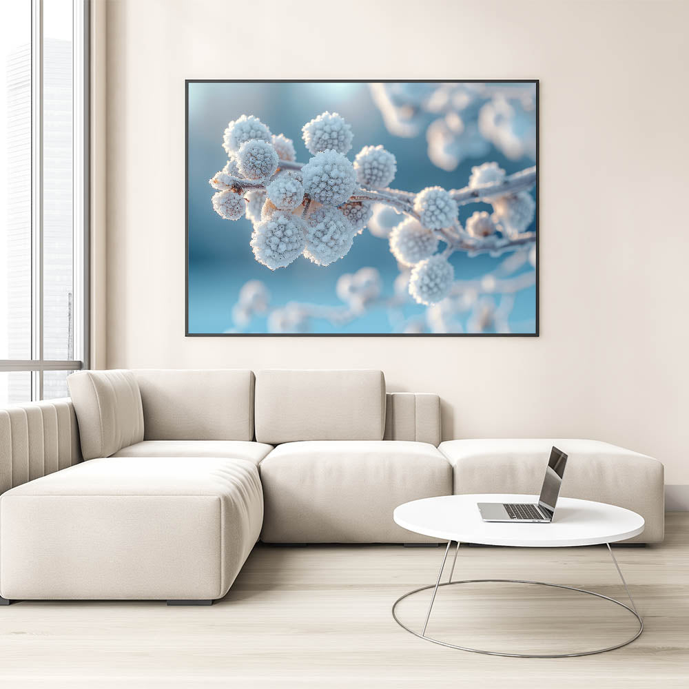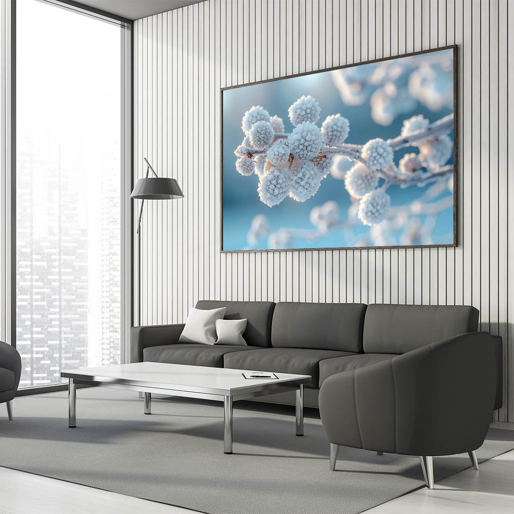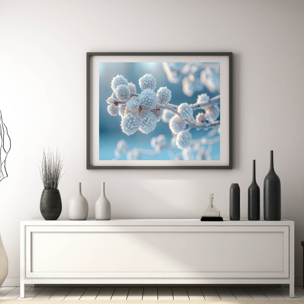 Embrace the frosty charm of winter with this stunning "Frosted Winter Berries" artwork. This close-up captures the intricate beauty of frozen berries, covered in a delicate layer of frost. The cool blue tones combined with the soft white frost make this piece perfect for creating a serene and elegant atmosphere in any space. The artwork beautifully blends the purity of winter with the natural simplicity of berries, offering a soothing yet striking visual experience.