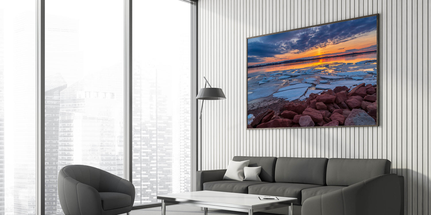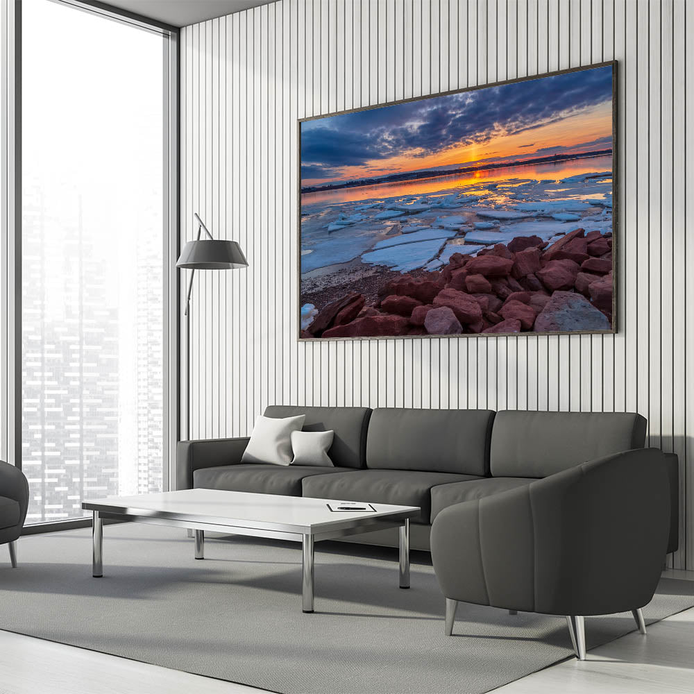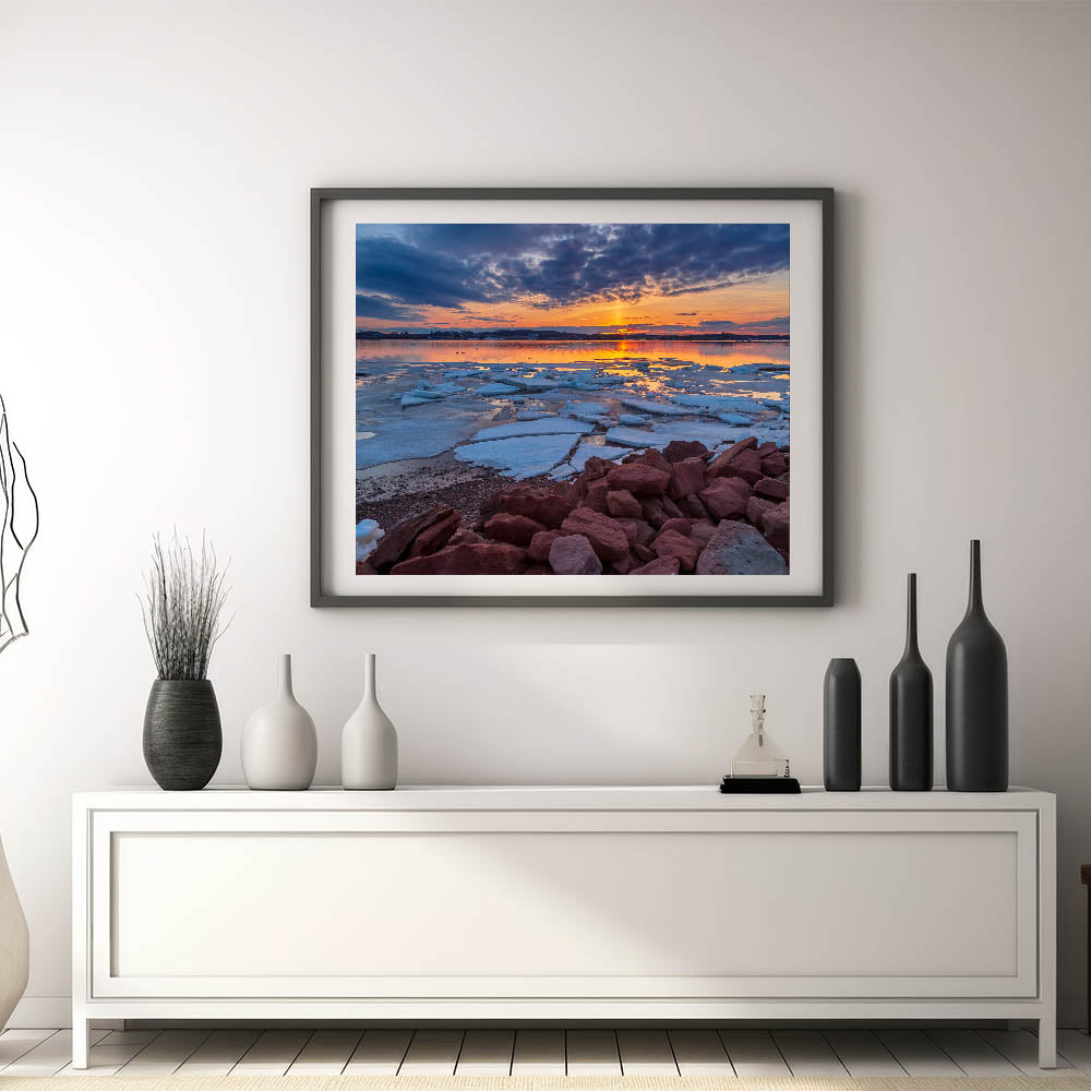- Maritime wall decor that highlights the striking beauty of PEI’s winter scenery, with ice, rocks, and glowing skies.