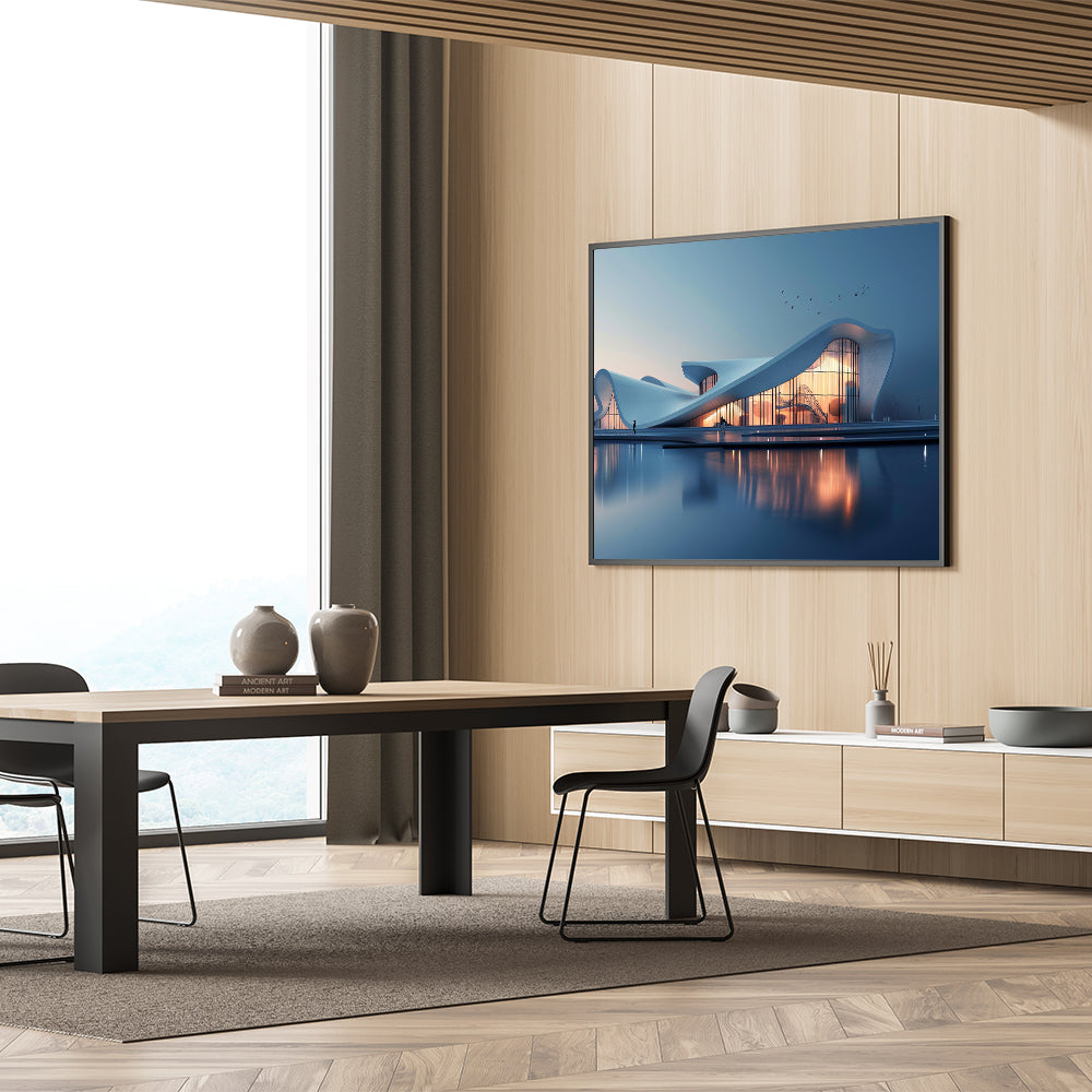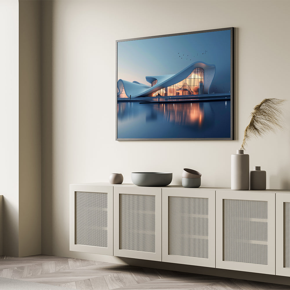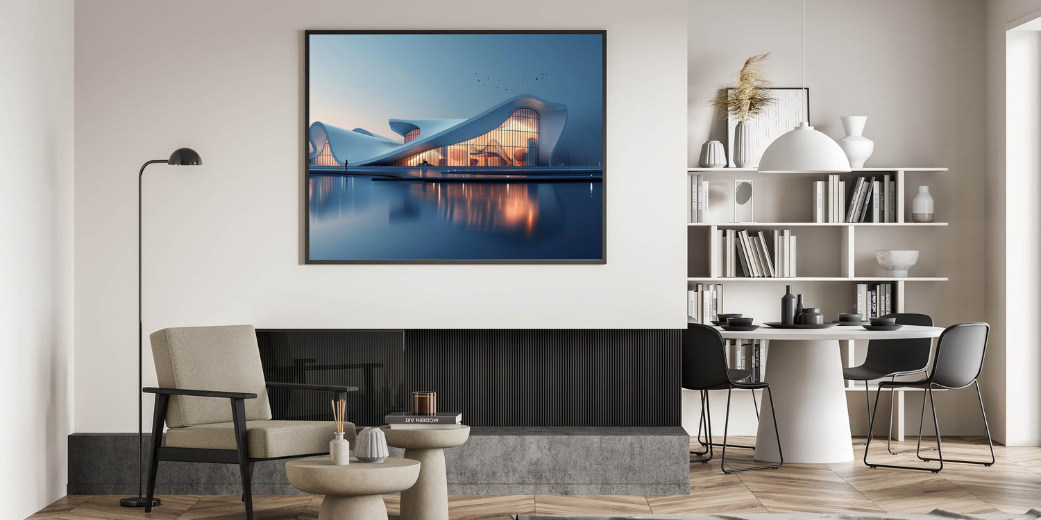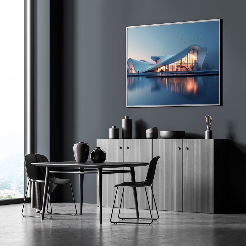 Step into the future of architectural design with this captivating wall art, featuring a stunning modern building with wave-like curves bathed in the soft glow of evening light. The sleek, fluid lines of the structure reflect off the calm water, creating a serene and harmonious scene that embodies modern elegance and innovation. This piece is perfect for those who appreciate cutting-edge architecture and contemporary design, making it an ideal addition to any sophisticated space.
