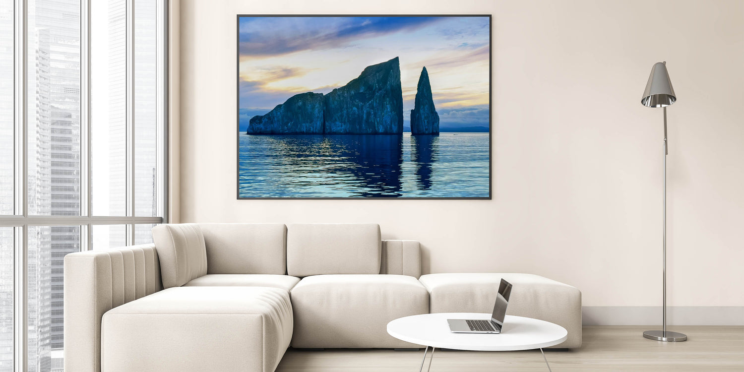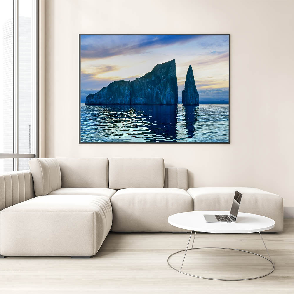 Bring the awe-inspiring beauty of the Galapagos Islands into your home with this stunning wall art featuring iconic rock formations rising from calm, reflective waters. The soft pastel tones of the sky and the tranquil blue hues of the ocean create a sense of serenity and wonder, making this artwork perfect for those who love peaceful landscapes. This Galapagos wall art captures the essence of Ecuador's natural beauty, making it ideal for coastal and nature-themed decor.