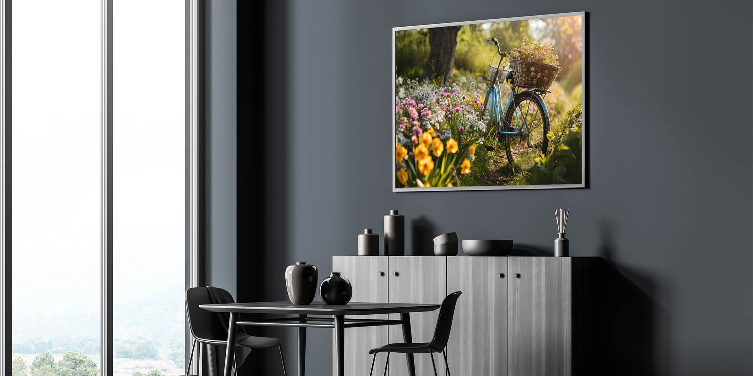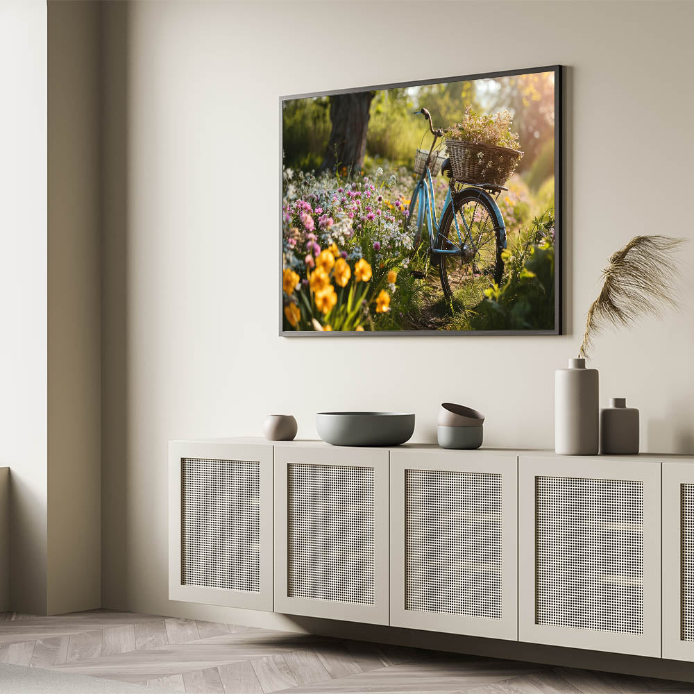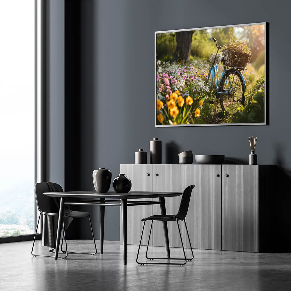 Bring the beauty of nature into your home with this vibrant garden bicycle and wildflowers wall art. Featuring a charming blue bicycle nestled among a colorful array of wildflowers, this artwork captures the essence of a peaceful morning in the garden. The soft sunlight filtering through the trees and the rich, natural colors make this piece perfect for any space that embraces the joy of nature and the outdoors.