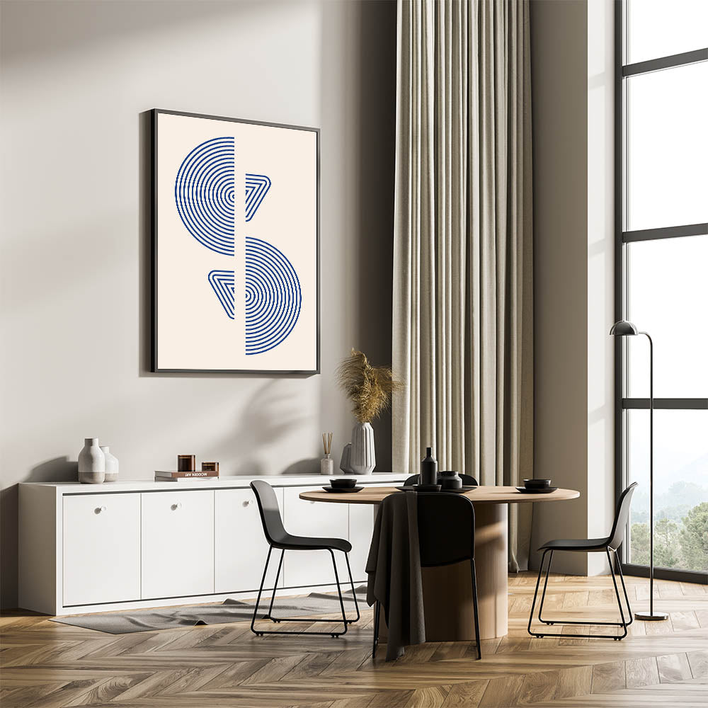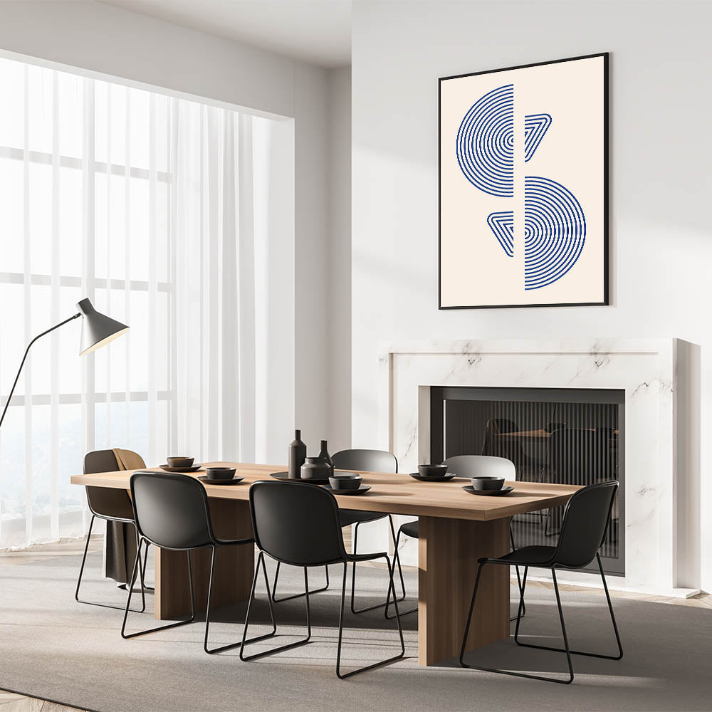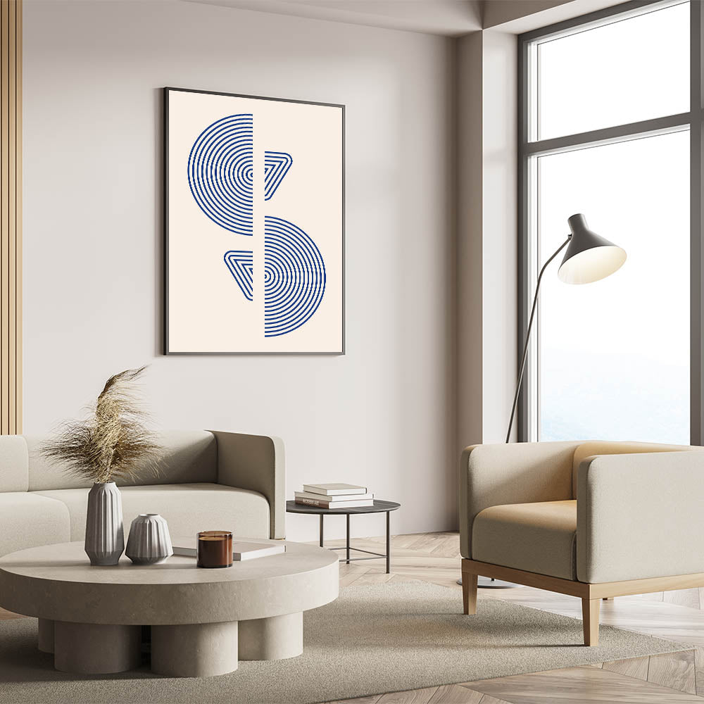 Introduce a touch of modern elegance with this striking geometric wall art, featuring concentric circles and triangular shapes in bold blue tones. The minimalist yet impactful design is perfect for spaces with a bohemian, contemporary, or Scandinavian decor style. This artwork creates a sense of movement and balance, making it an ideal choice for living rooms, offices, or creative spaces.