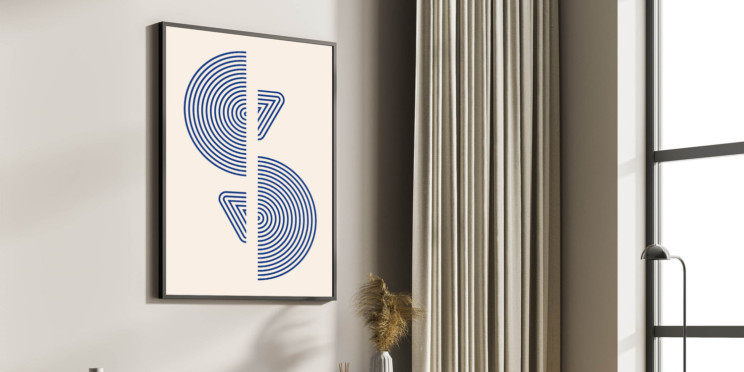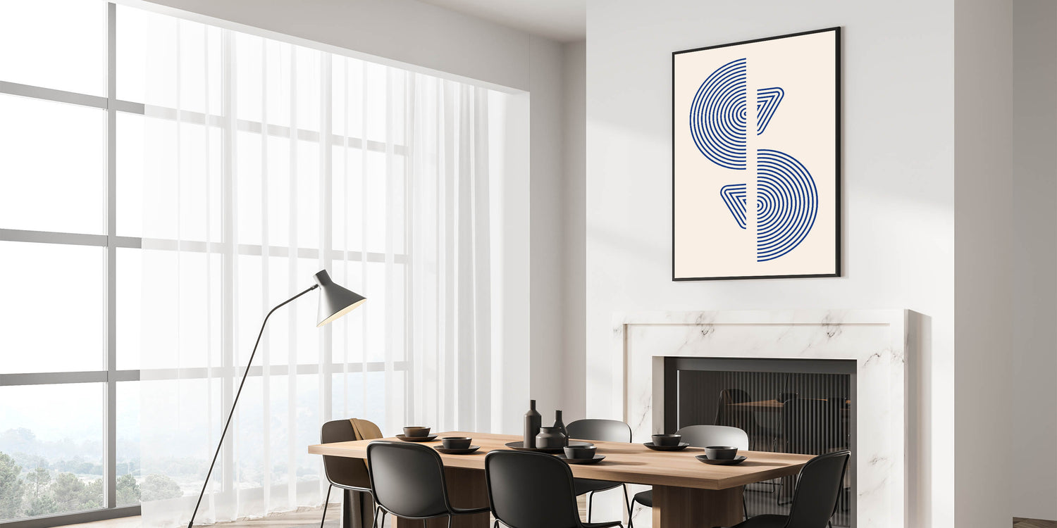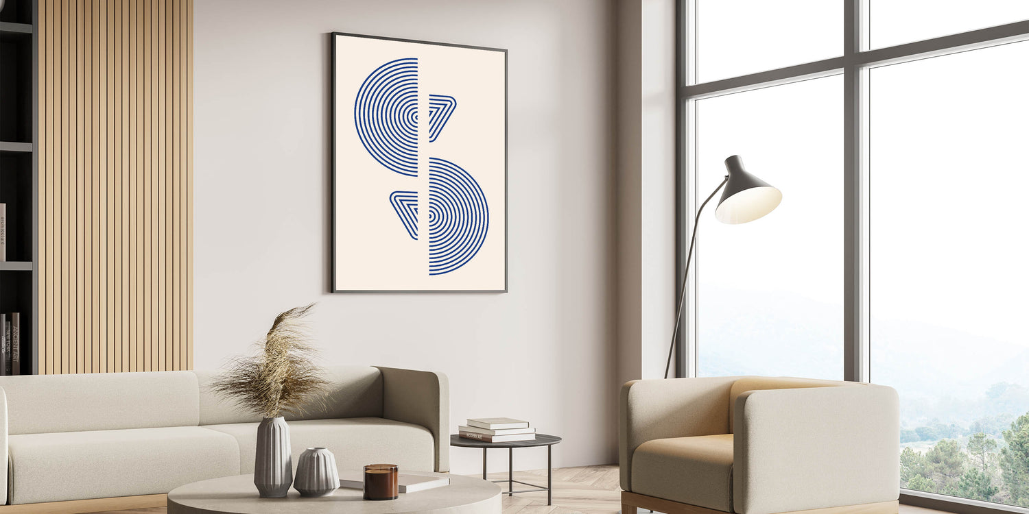 Introduce a touch of modern elegance with this striking geometric wall art, featuring concentric circles and triangular shapes in bold blue tones. The minimalist yet impactful design is perfect for spaces with a bohemian, contemporary, or Scandinavian decor style. This artwork creates a sense of movement and balance, making it an ideal choice for living rooms, offices, or creative spaces.