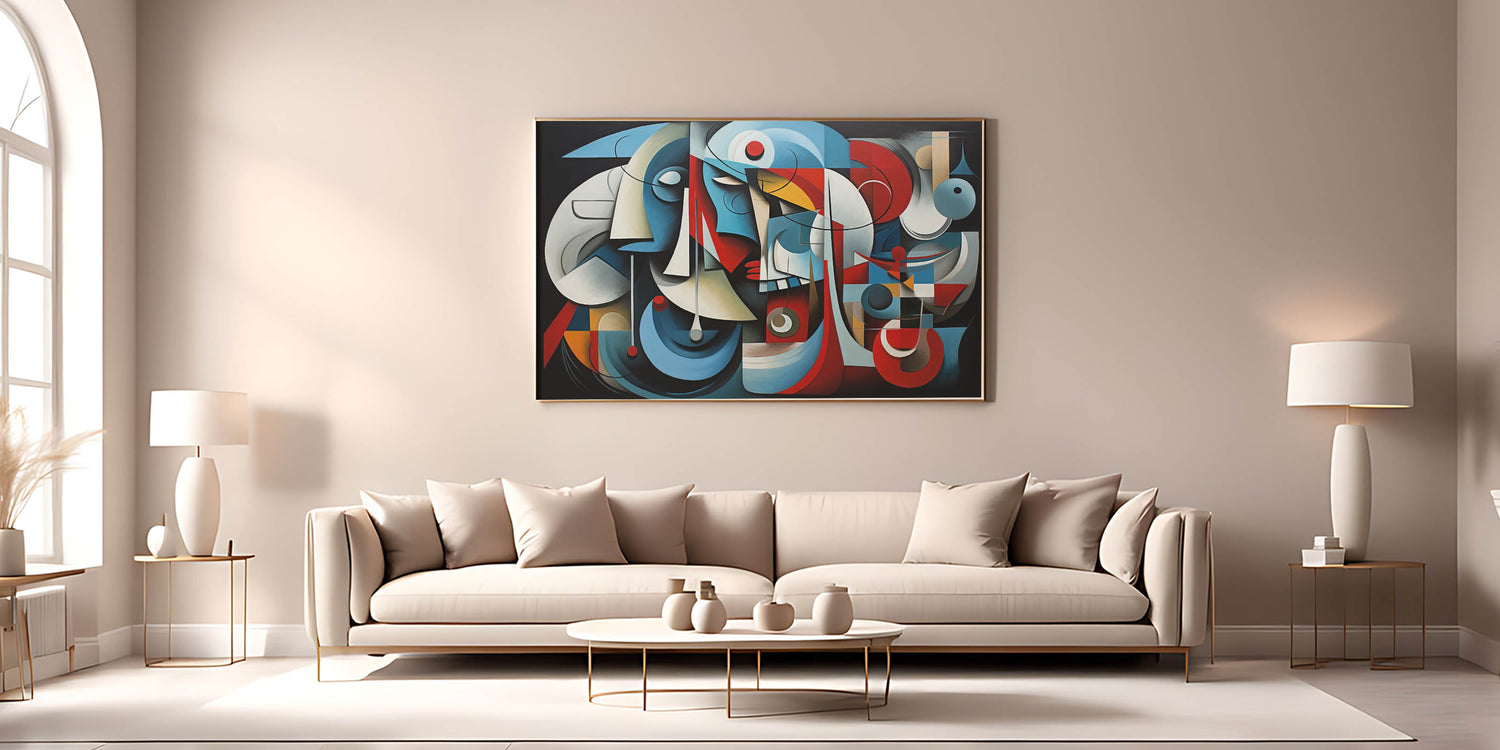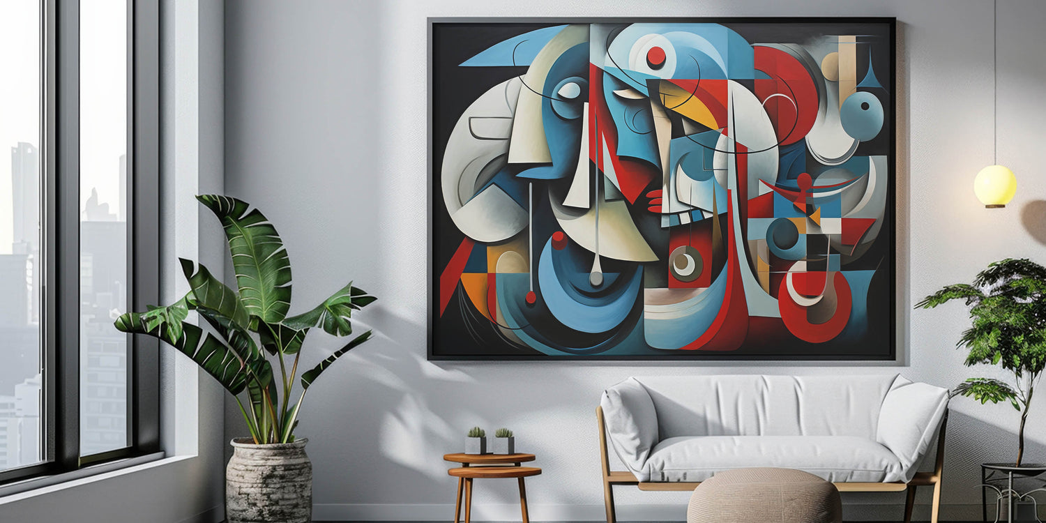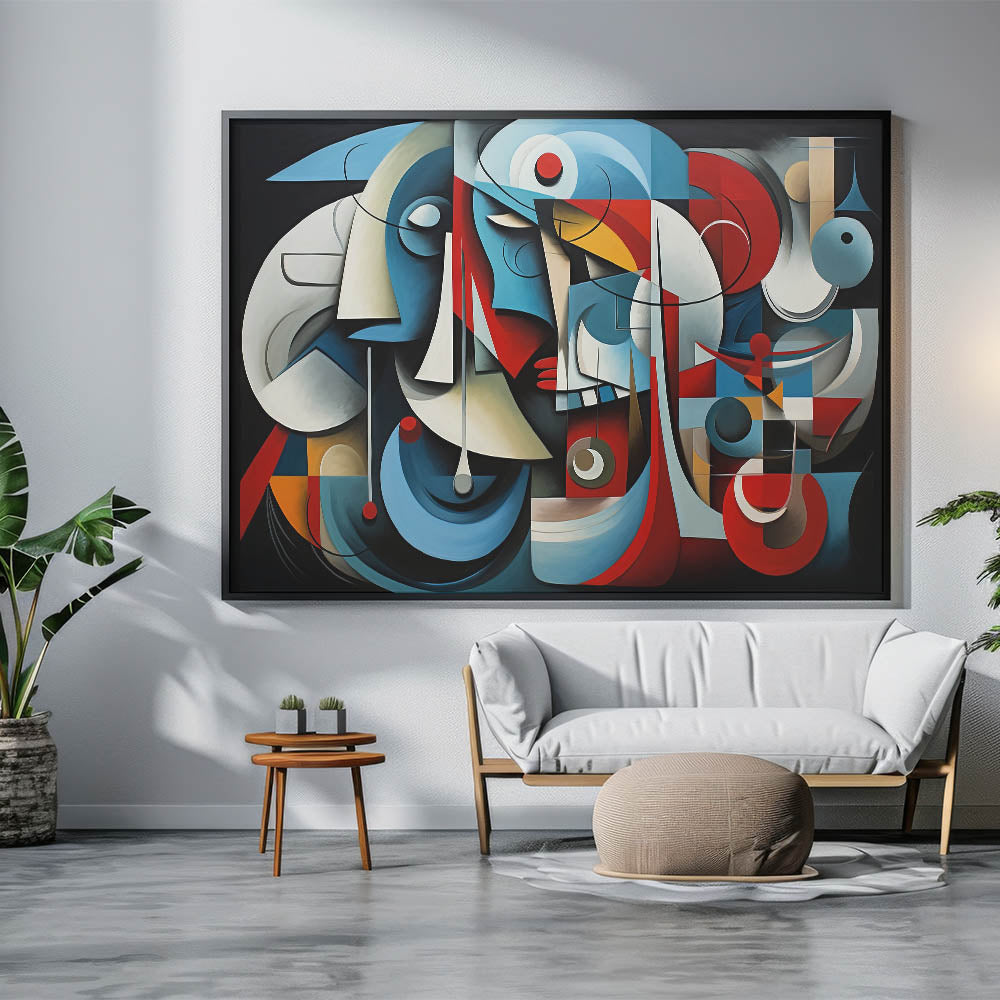 Immerse your space in the bold and structured elegance of this geometric harmony abstract expressionist wall art. This piece features an intricate composition of interlocking shapes and lines, highlighted by a striking color palette of deep blues, vibrant reds, and soft neutrals. The abstract forms and rhythmic patterns create a visually compelling piece that evokes both balance and movement.