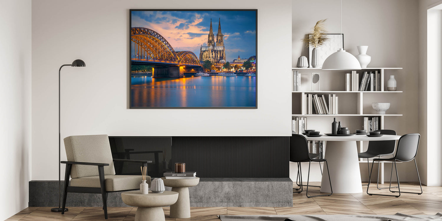 Transform your space with this stunning Germany Wall Art featuring the majestic Cologne Cathedral and Hohenzollern Bridge, beautifully captured at sunset. This scene brings together the historic charm of German architecture and modern design. Whether you're decorating a living room or office, this piece offers a breathtaking view of Scenic Germany that adds sophistication and warmth to any space.