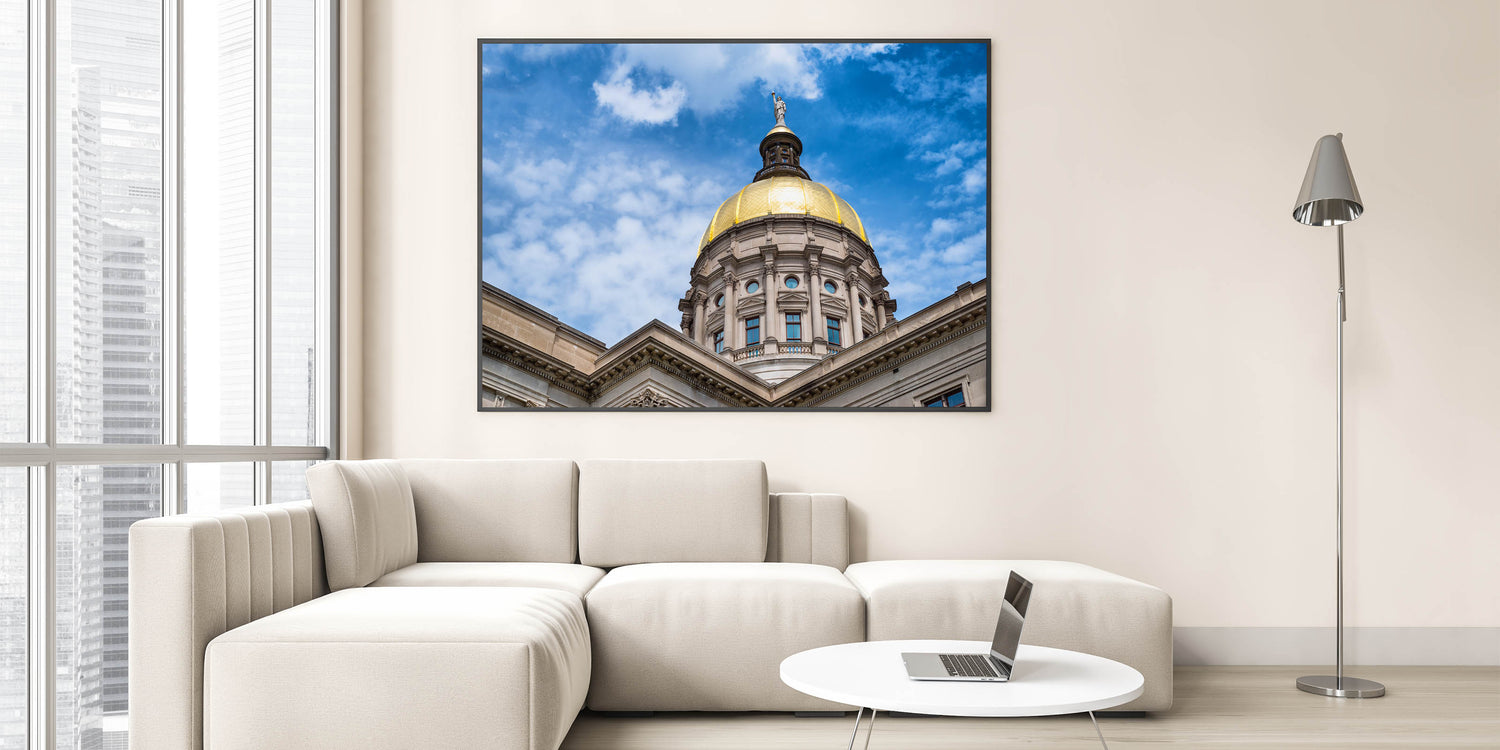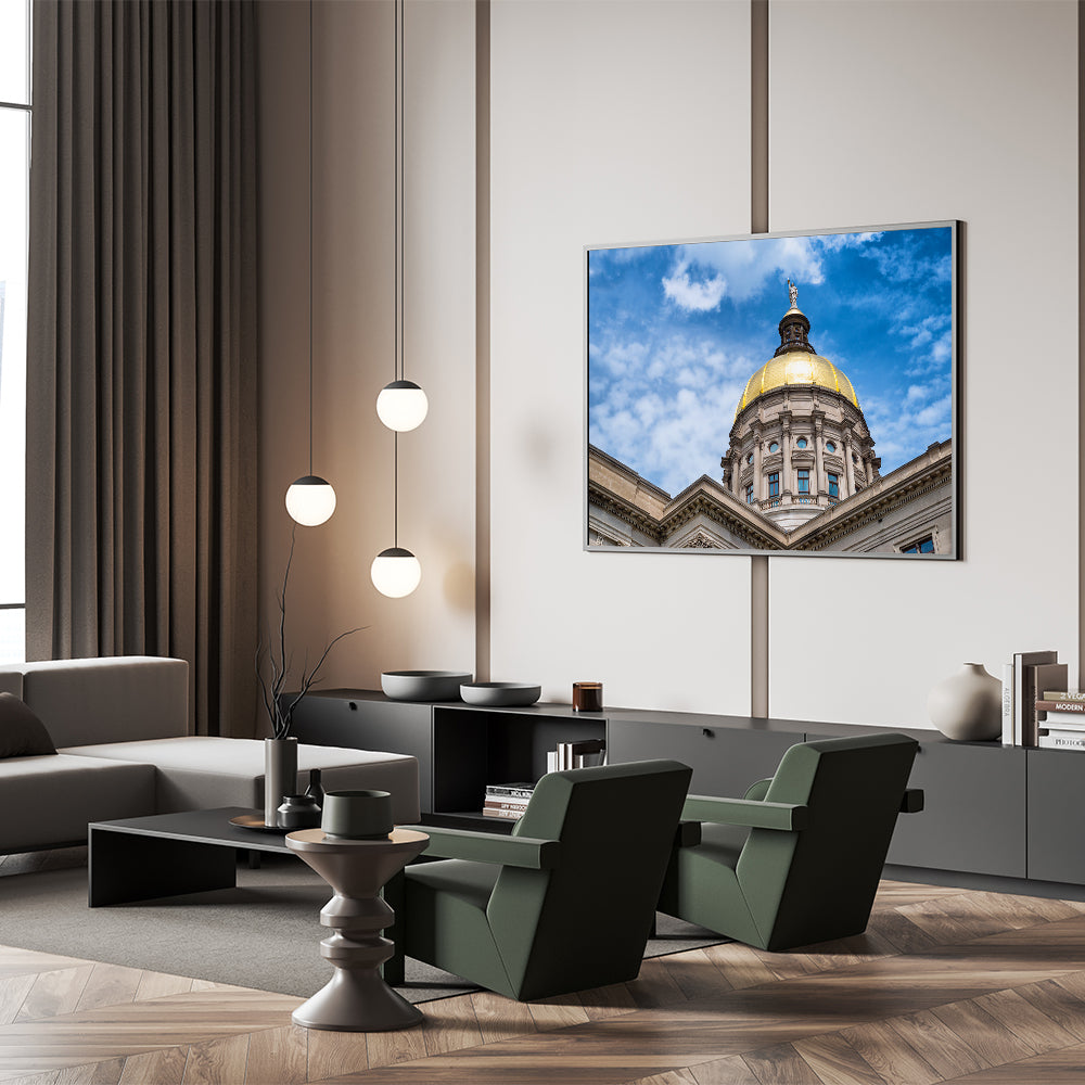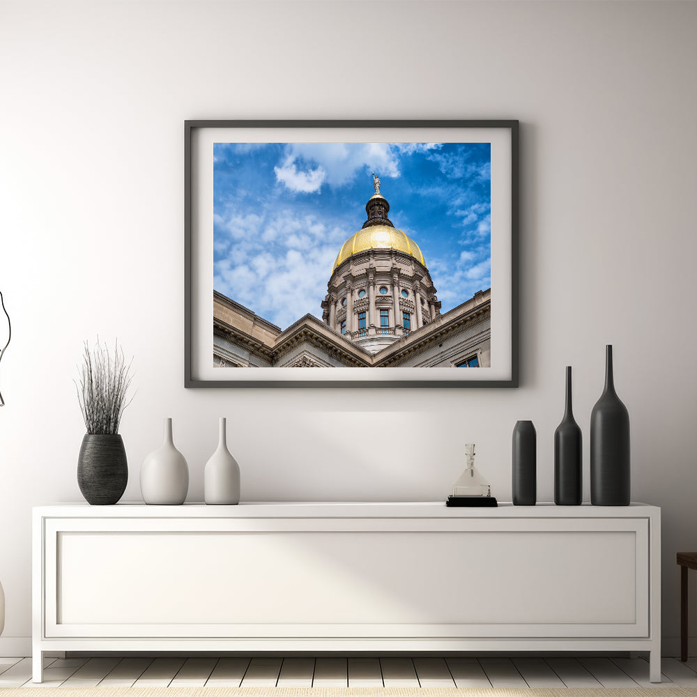 Bring a touch of opulence and history to your space with this striking wall art featuring a grand golden dome. Set against a vibrant blue sky, the golden dome gleams with architectural splendor, highlighting the intricate design and craftsmanship of this historic building. The contrast between the bright gold and the cool blue creates a captivating visual effect, making this piece a perfect focal point for any room. Ideal for those who appreciate the beauty of classic architecture and the elegance of historical landmarks, this print adds a luxurious touch to your decor.