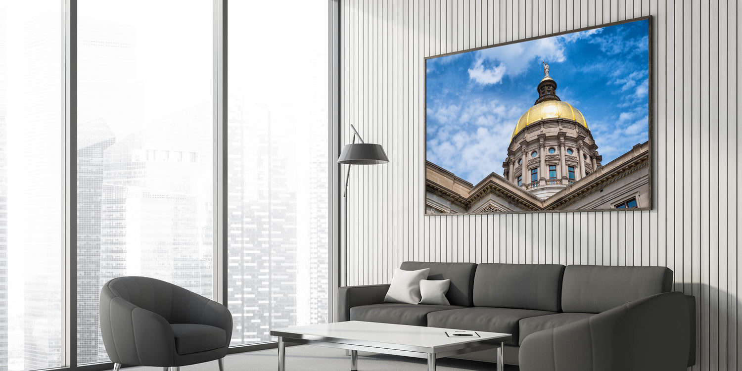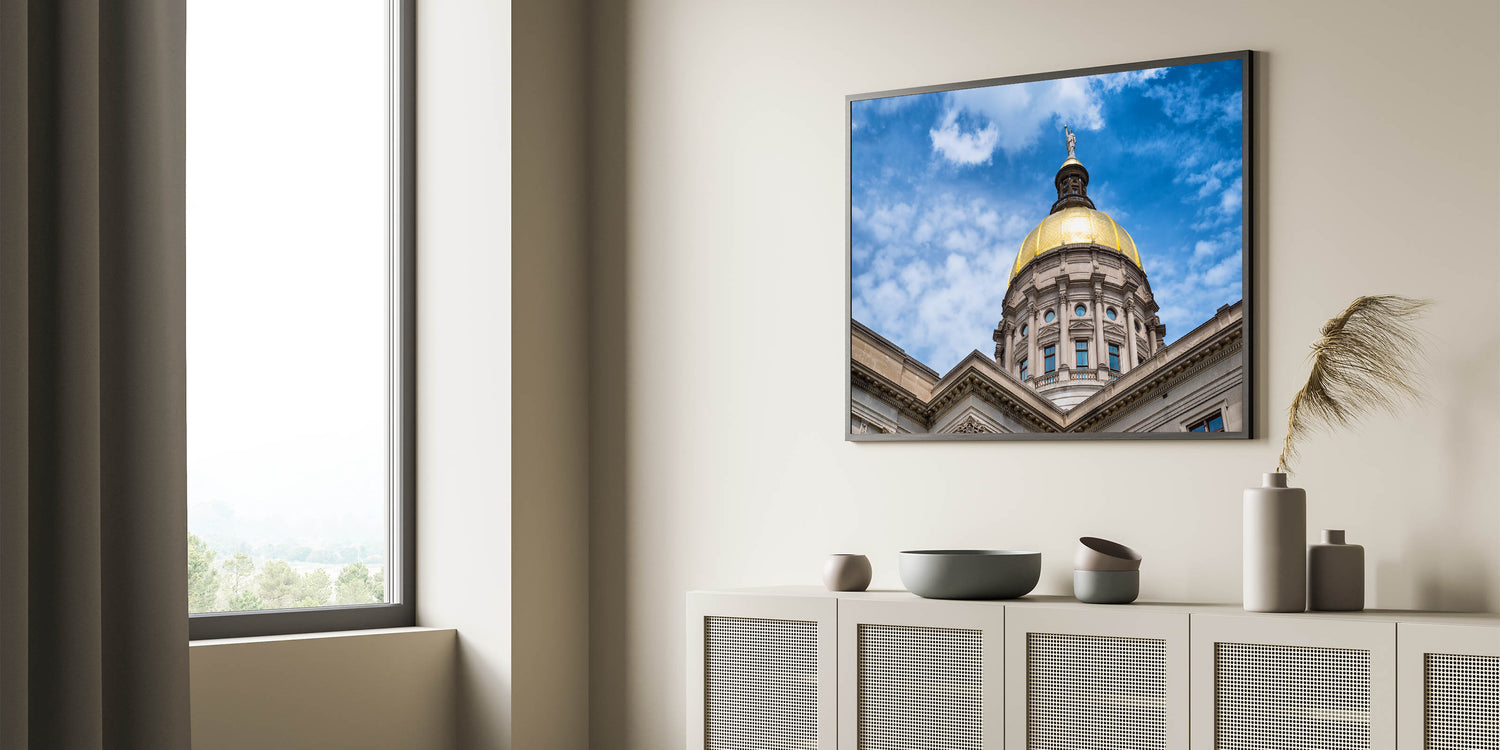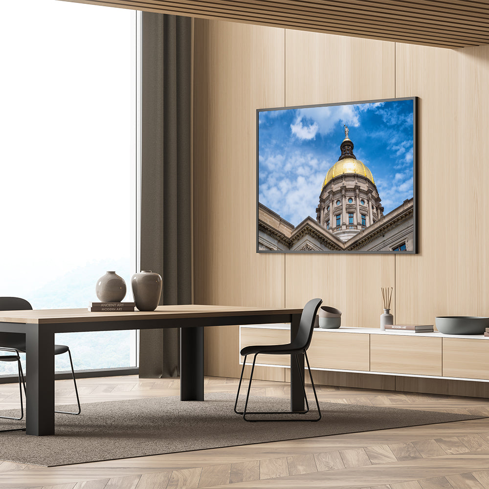 Bring a touch of opulence and history to your space with this striking wall art featuring a grand golden dome. Set against a vibrant blue sky, the golden dome gleams with architectural splendor, highlighting the intricate design and craftsmanship of this historic building. The contrast between the bright gold and the cool blue creates a captivating visual effect, making this piece a perfect focal point for any room. Ideal for those who appreciate the beauty of classic architecture and the elegance of historical landmarks, this print adds a luxurious touch to your decor.