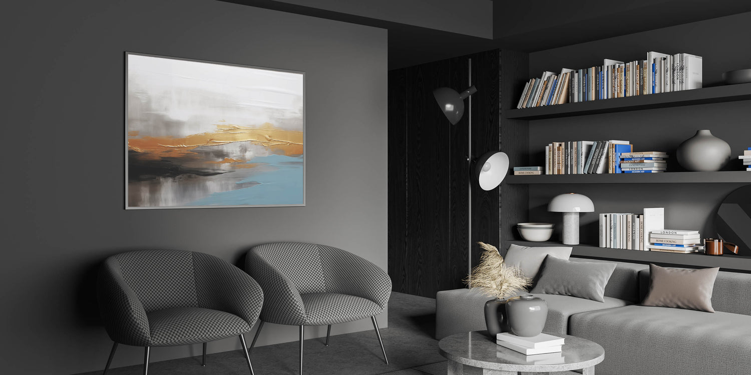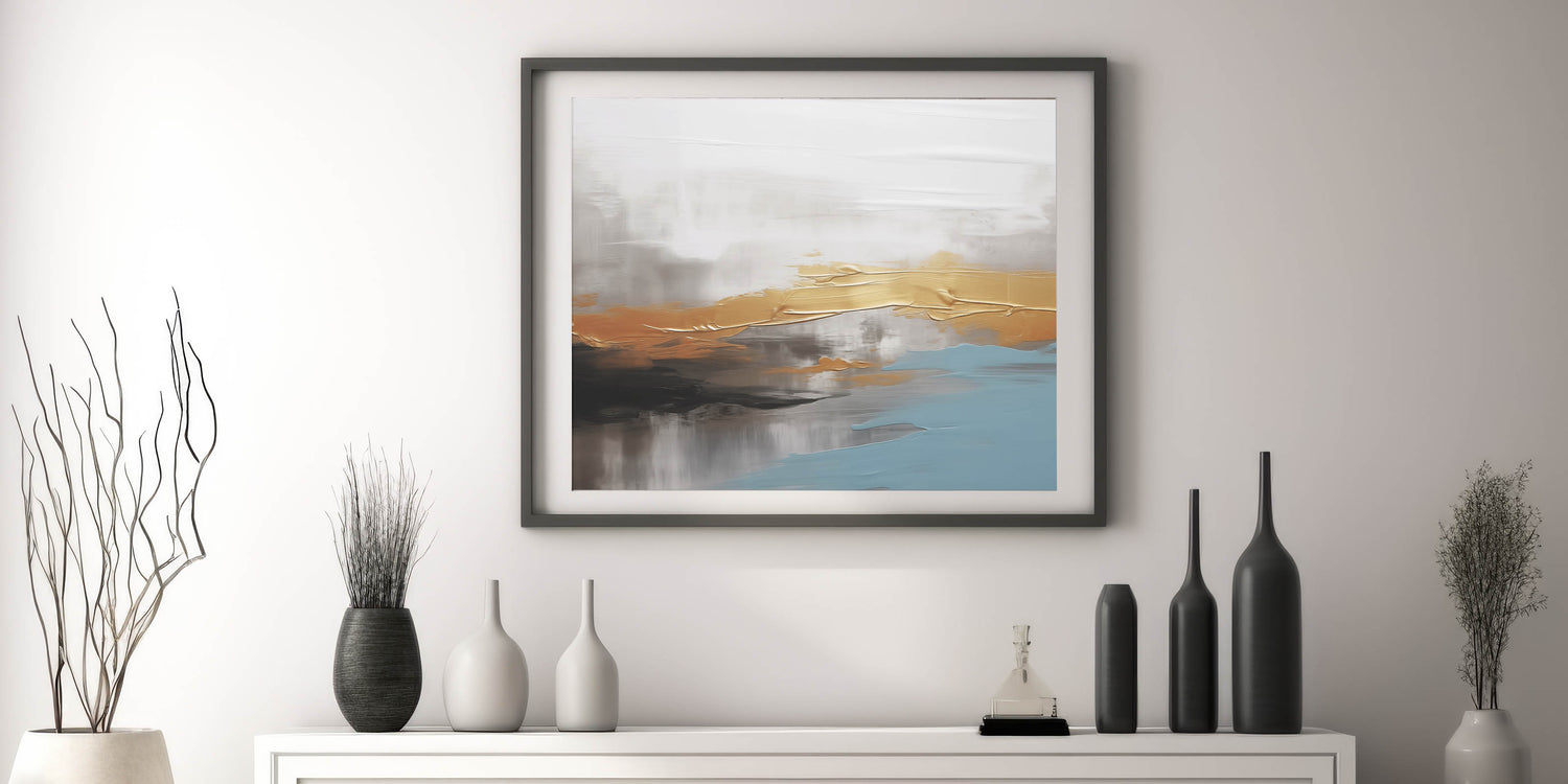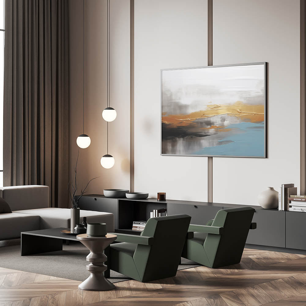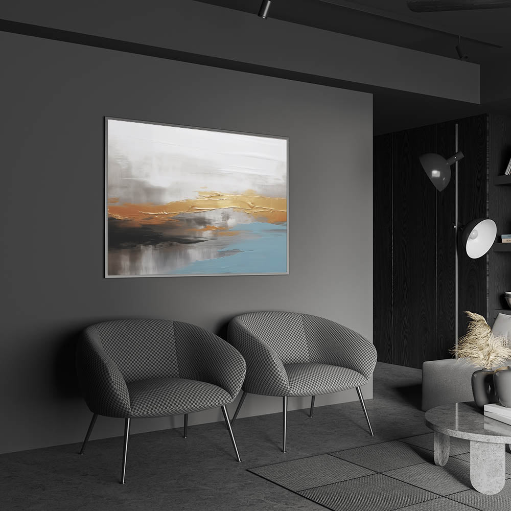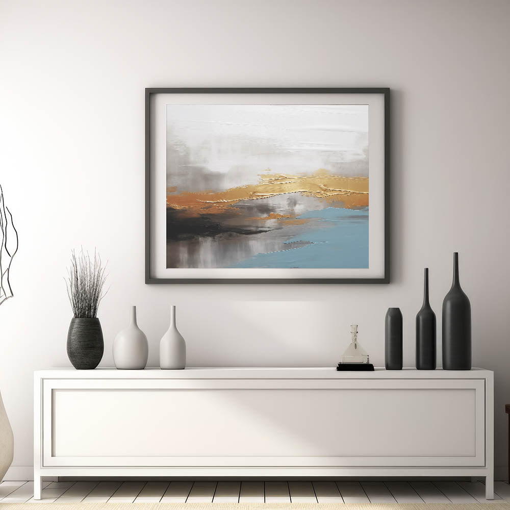 Enhance your living space with the "Golden Horizon Abstract Art." Its unique blend of colors and abstract design elements make it a versatile choice for any room, bringing a sense of elegance and artistic flair to your decor.