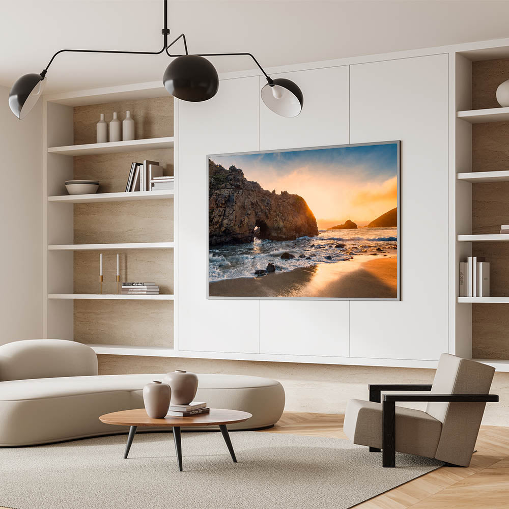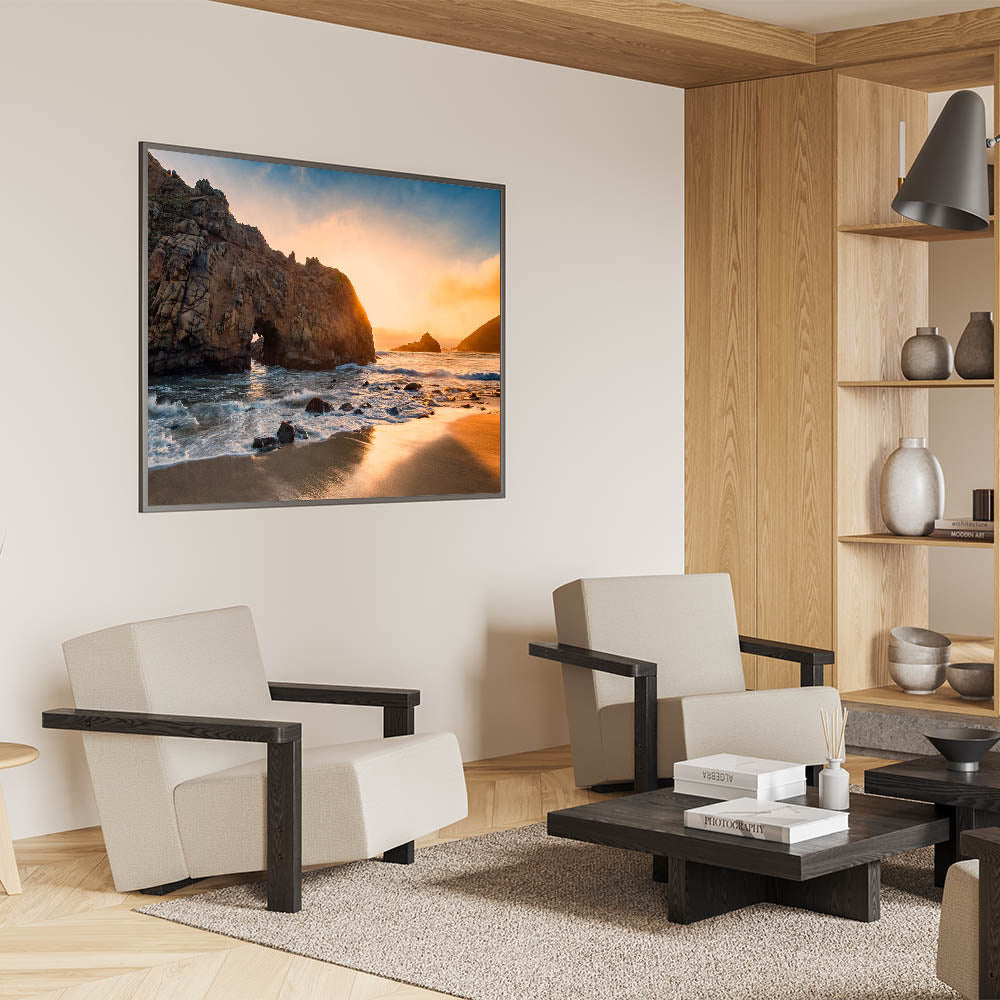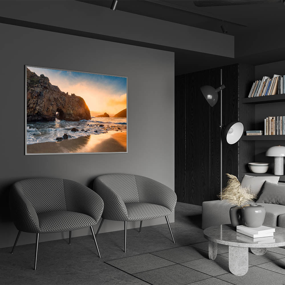 Capture the serene beauty of a golden sunset over Big Sur with this stunning coastal landscape wall art. This breathtaking artwork showcases the sun dipping below the horizon, casting a warm glow over the rugged rock formations and tranquil Pacific waters. Perfect for those who love the coast, this scenic Big Sur print will bring the magic of California’s natural beauty into any space, whether it's your living room, office, or bedroom.