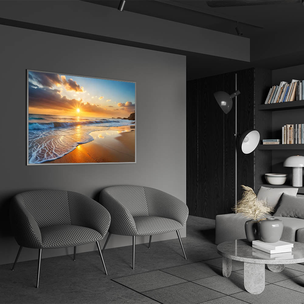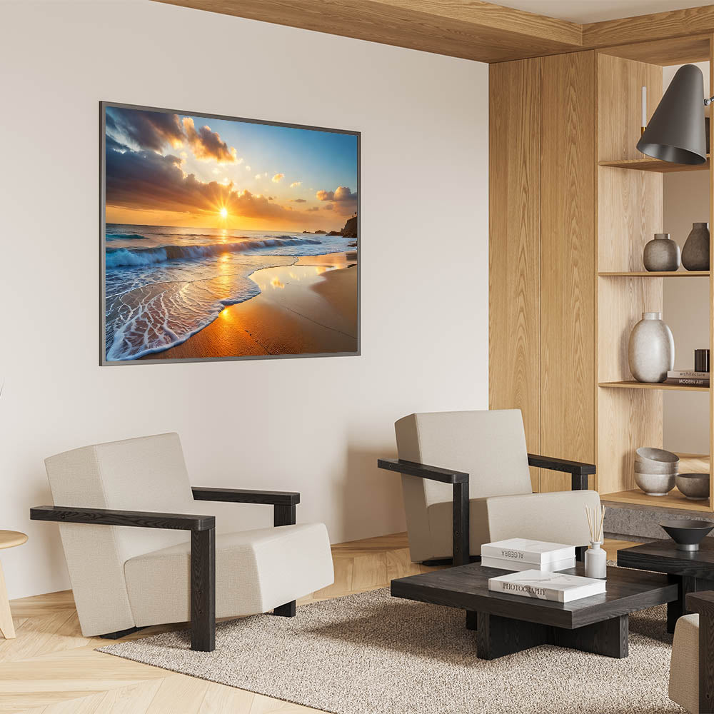 Capture the warmth and beauty of a serene beach sunset with this stunning canvas art. The golden hues of the setting sun reflect off the gentle waves, creating a peaceful and inviting scene that brings the tranquility of the coast into your home. This artwork is perfect for adding a touch of warmth and elegance to any space, whether it’s your living room, bedroom, or office.
