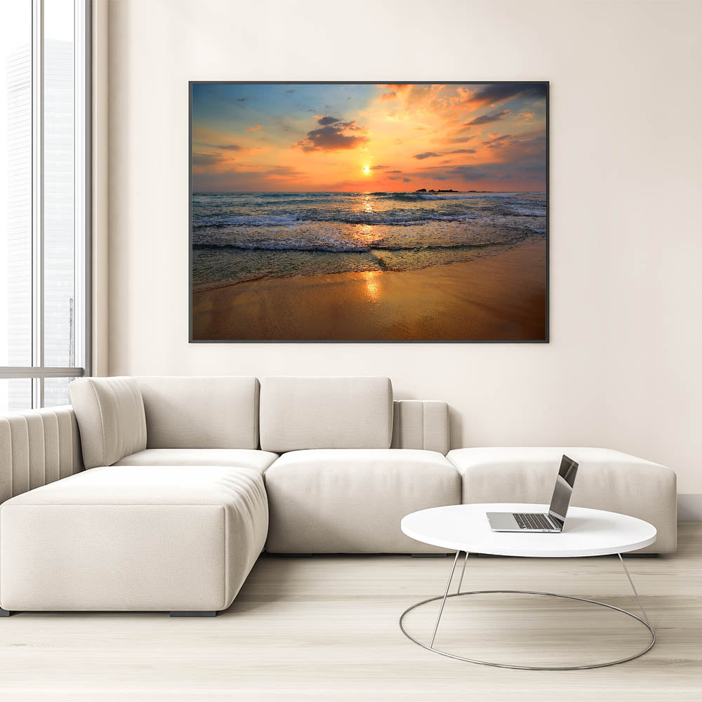 Transform your space with the warm, inviting glow of this stunning sunset beach landscape wall art, capturing the serene beauty of the ocean as the sun dips below the horizon. The golden hues of the setting sun reflecting off the gentle waves create a calming and peaceful scene, perfect for bringing a touch of nature’s beauty into your home. Ideal for enhancing the ambiance of your living room, bedroom, or office, this artwork embodies the tranquil and rejuvenating essence of the seaside.