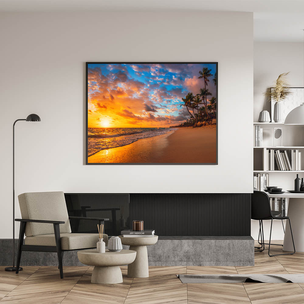 Bring the essence of a tropical sunset into your home with this captivating beach canvas art. Whether you're decorating a beach house or simply want to add a splash of color and warmth to your space, this piece is sure to inspire relaxation and joy.