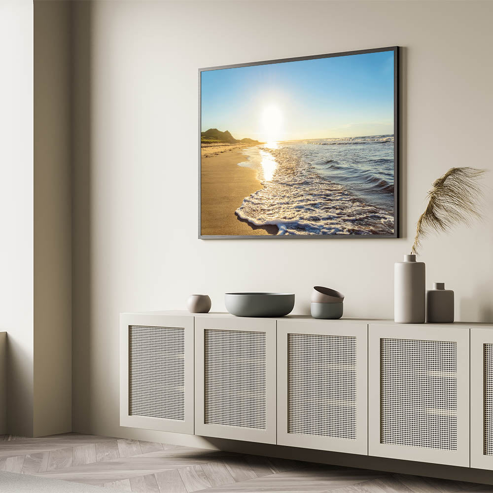 Feel the warmth of the setting sun on Prince Edward Island’s sandy shores with this stunning coastal wall art. The golden light reflects off the gently rolling waves, creating a peaceful and tranquil atmosphere. This beautiful beach scene perfectly captures the natural beauty of PEI’s coastline, where the serene waters meet the soft, expansive sand under the glow of the setting sun.