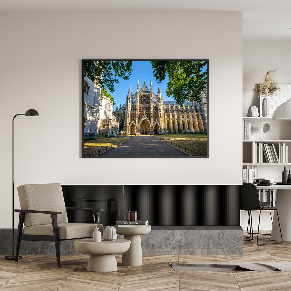 Celebrate the grandeur of Gothic Revival architecture with this captivating wall art, featuring the intricate facade of a historic palace bathed in sunlight. The stunning details of the pointed arches, intricate stonework, and soaring spires are beautifully captured, offering a glimpse into the majestic past of this architectural masterpiece. This piece is perfect for those who admire the beauty and history of Gothic design, making it an exquisite addition to any home or office decor.