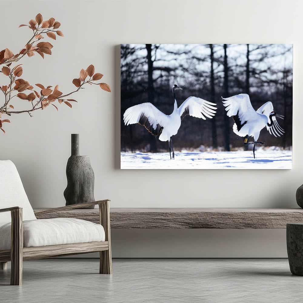 Graceful Crane Wall Art – Dancing Cranes in Snow on Canvas & Acrylic
