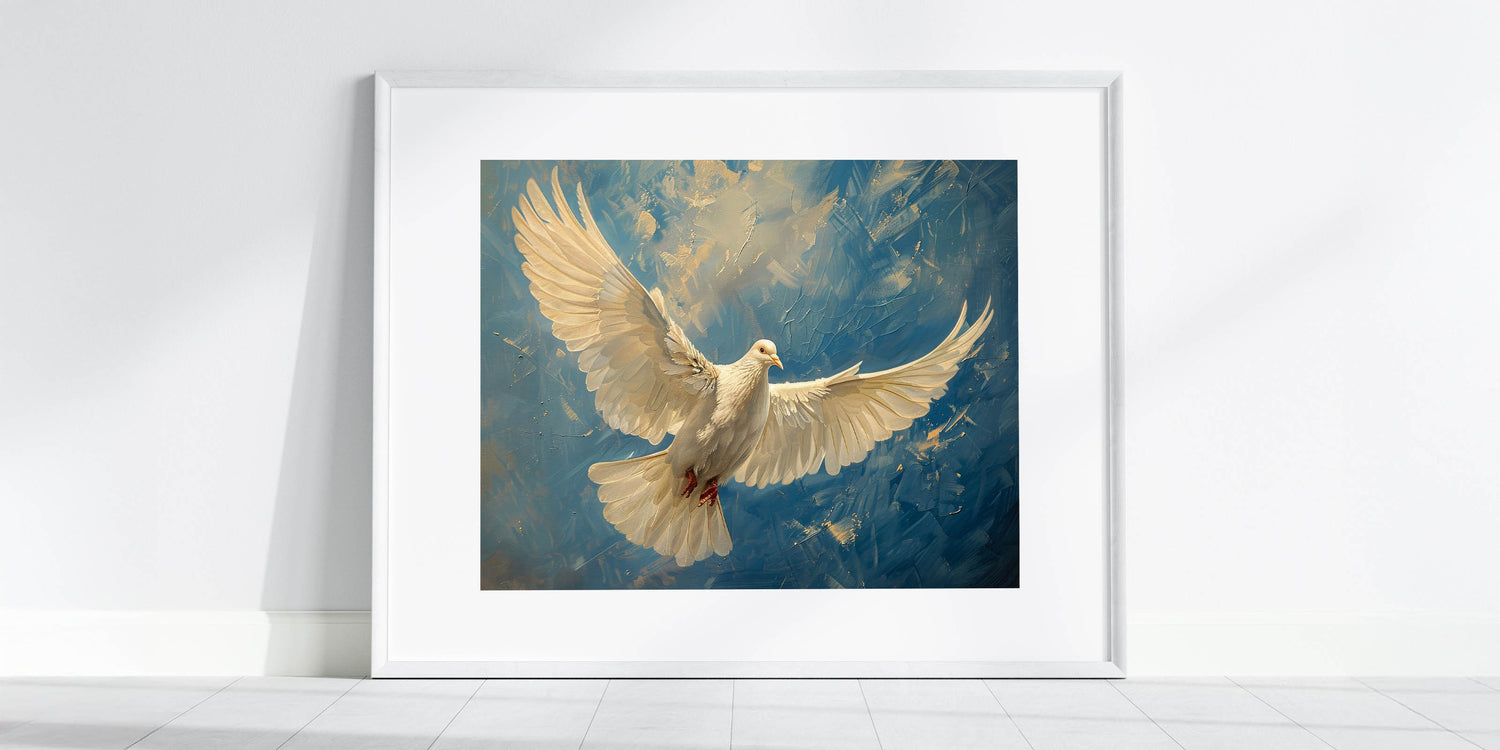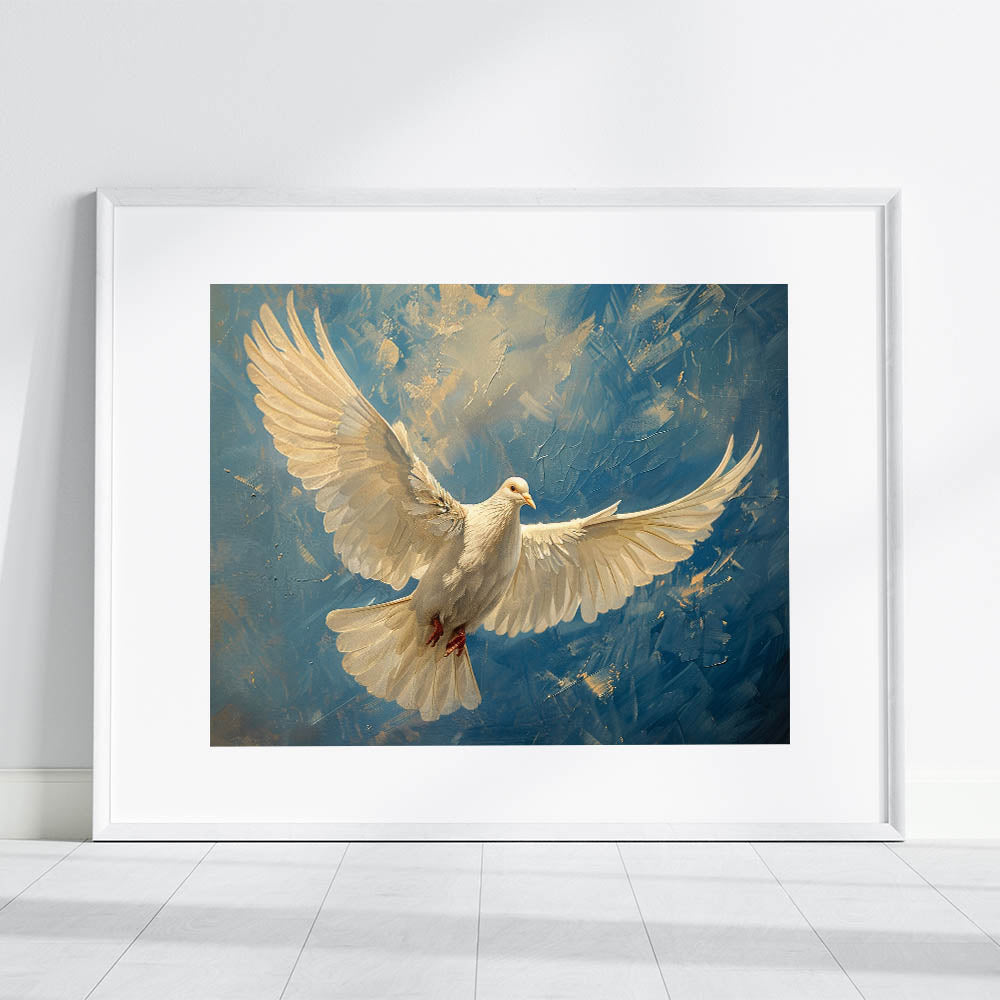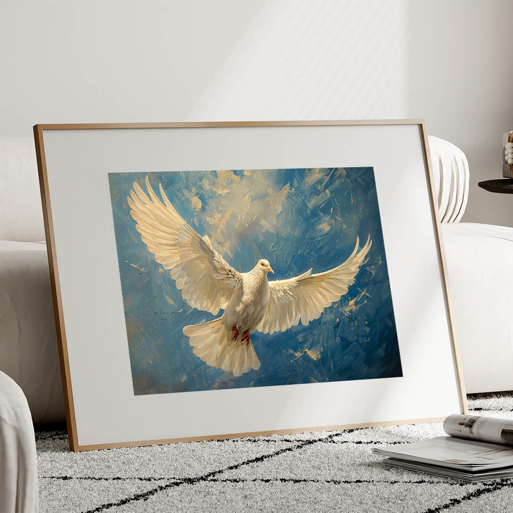 Embrace the beauty of serenity with this Graceful Dove Wall Art, capturing a stunning white dove in mid-flight against a soothing, textured blue background. The soft, harmonious colors combined with the delicate brushstrokes make this artwork a perfect addition to any room aiming to evoke calmness and elegance.
