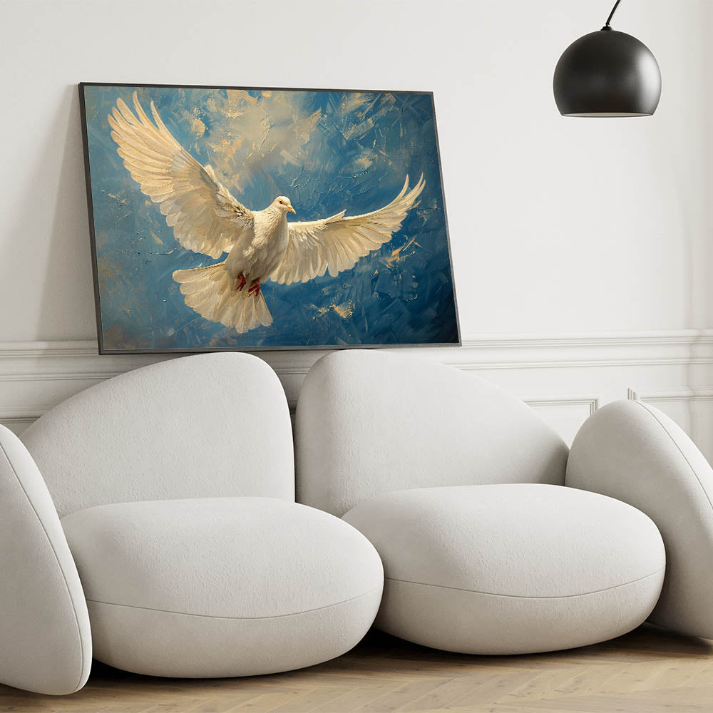 - Serene and Elegant Design: The gentle interplay of blue and cream tones, along with the dove’s graceful posture, creates a peaceful and inviting atmosphere.