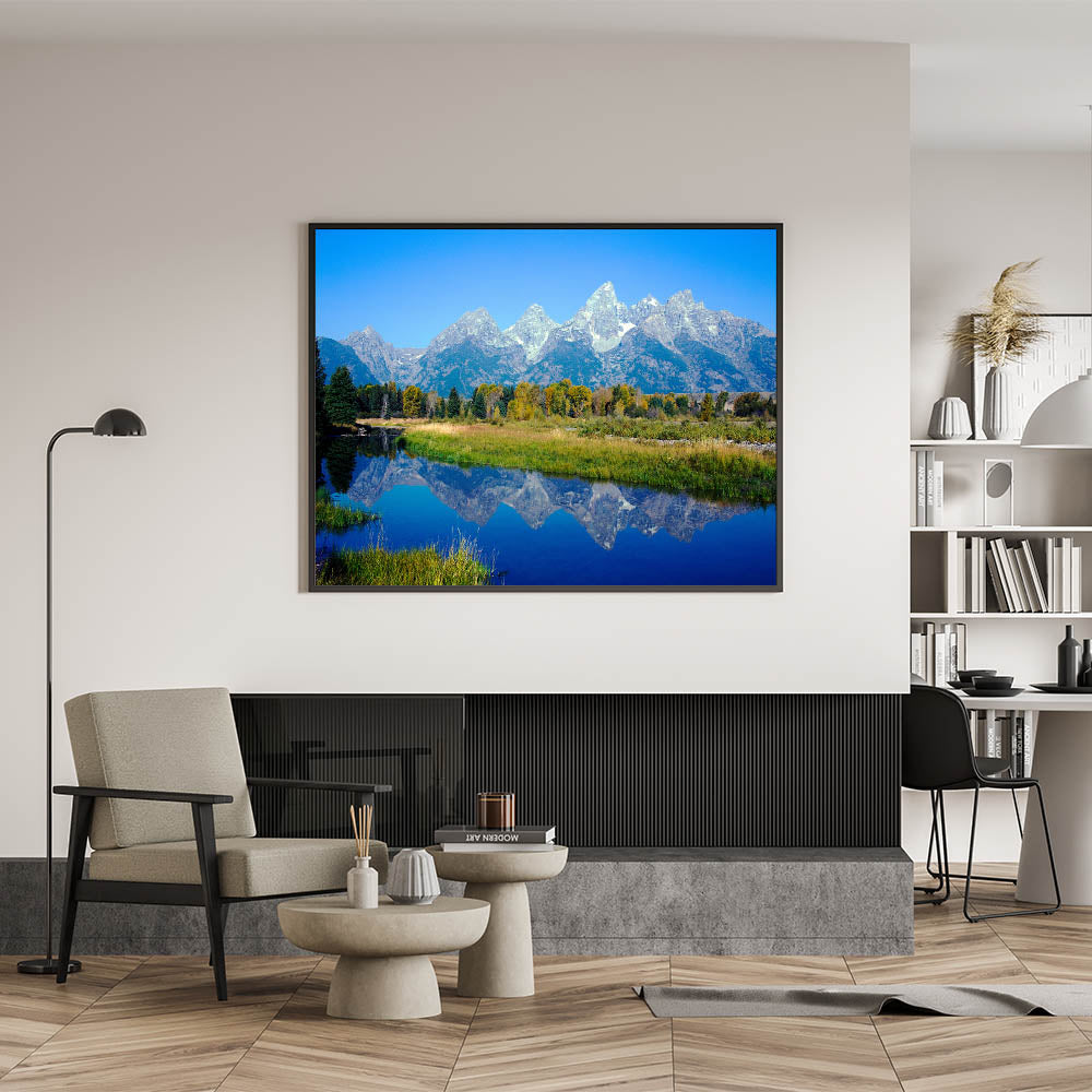 Immerse yourself in the tranquil beauty of Wyoming's Grand Teton National Park with this stunning canvas print. The majestic peaks of the Teton Range are beautifully reflected in the calm blue waters, surrounded by vibrant greenery and trees. This scene perfectly captures the natural serenity and splendor of the landscape, making it an ideal addition for any nature lover’s home or office.