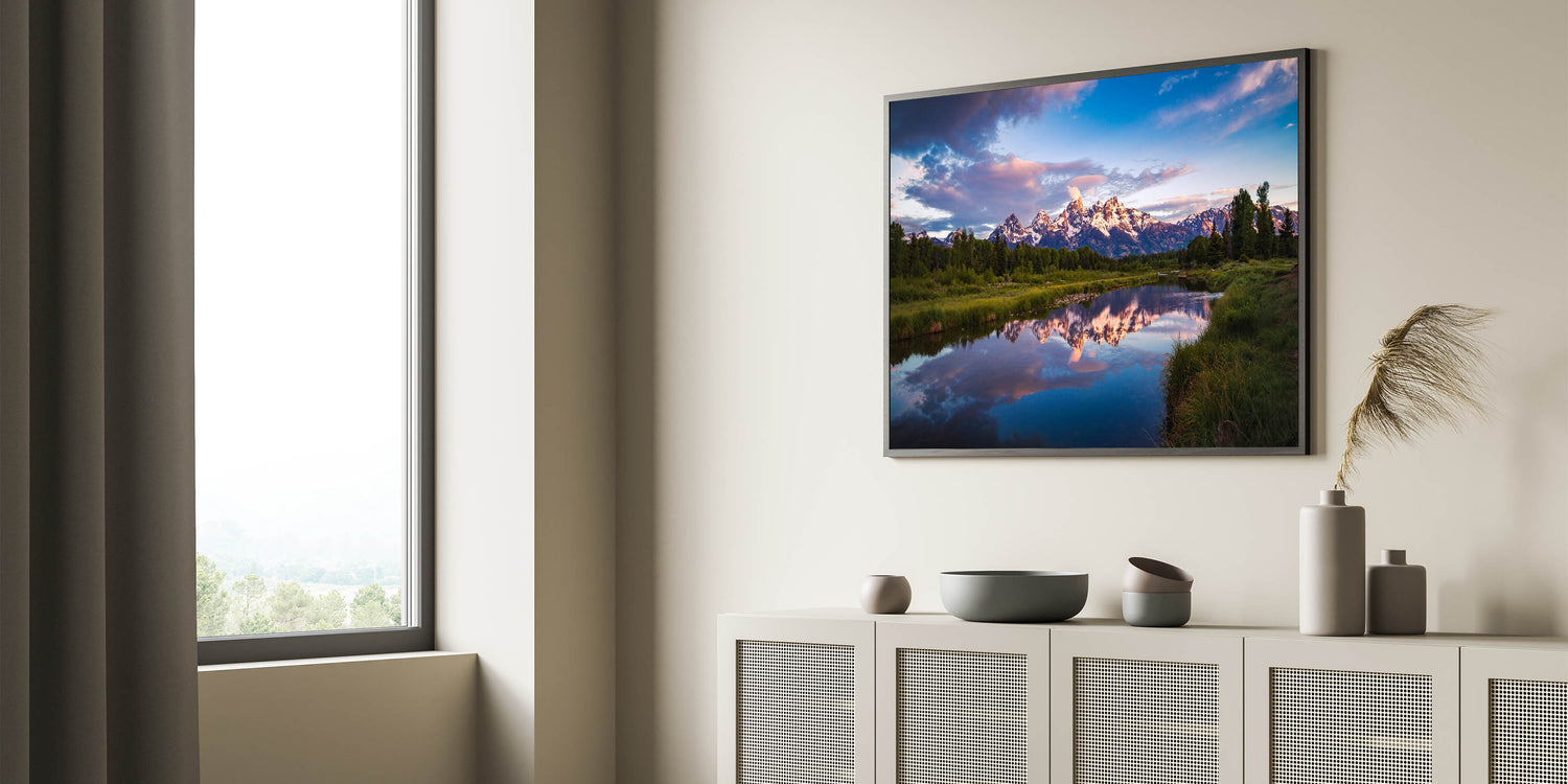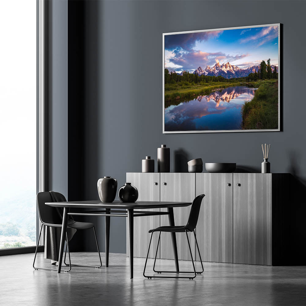This Grand Teton scenic print brings the peaceful beauty of mountain reflections and vibrant sunsets into your space, creating a calming and inviting atmosphere.