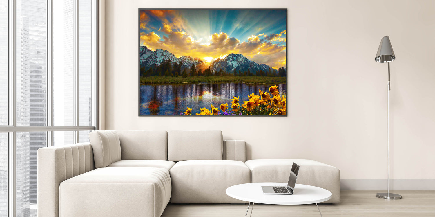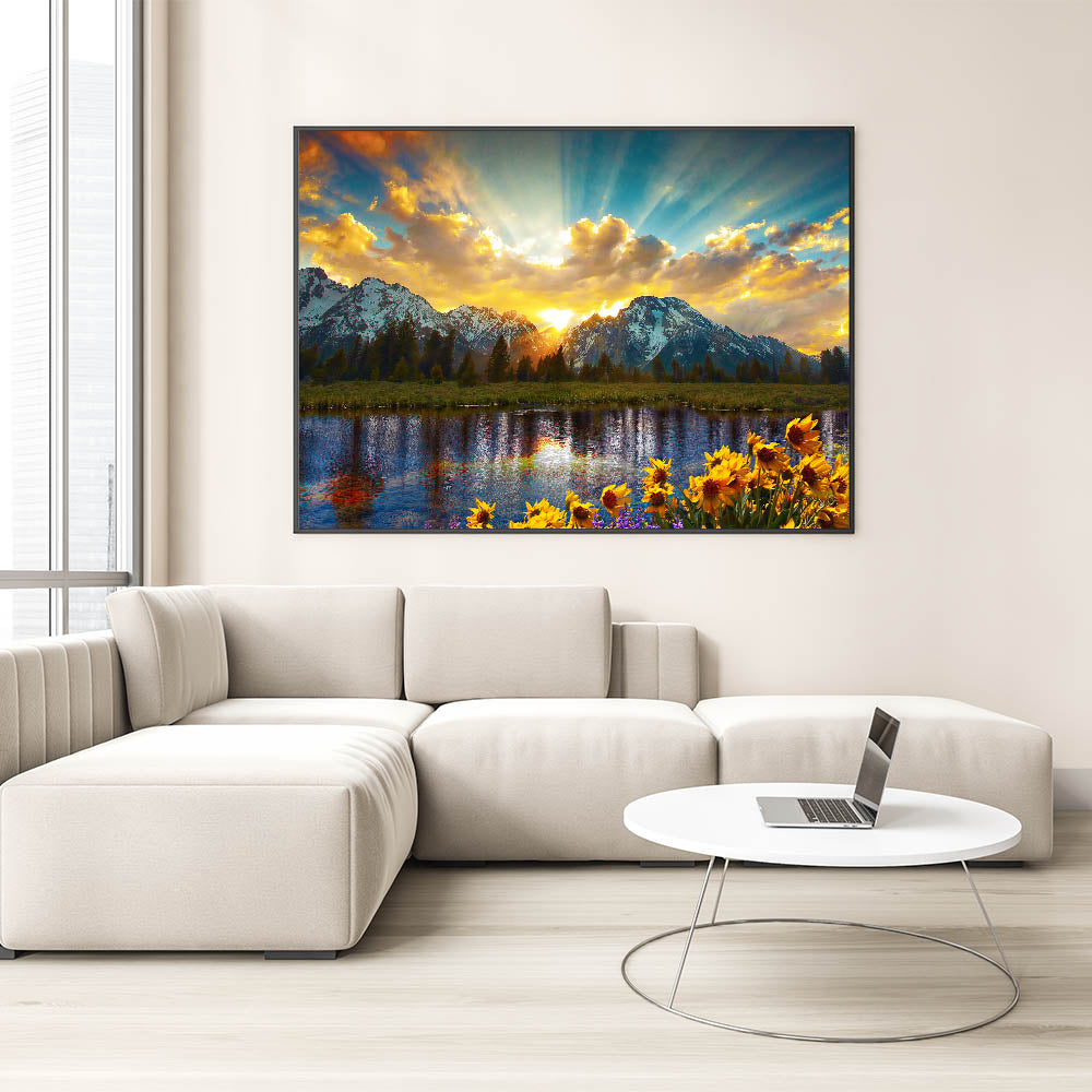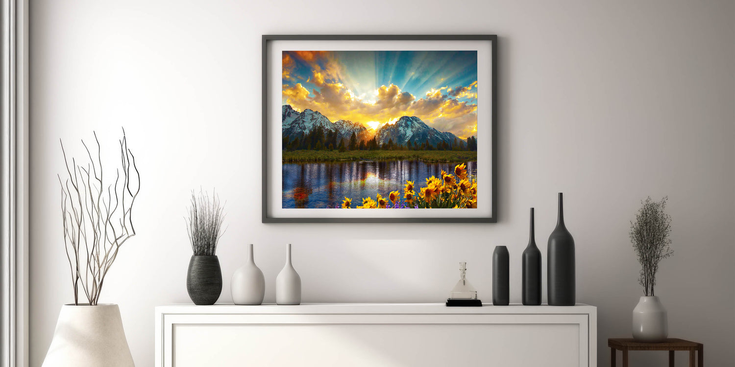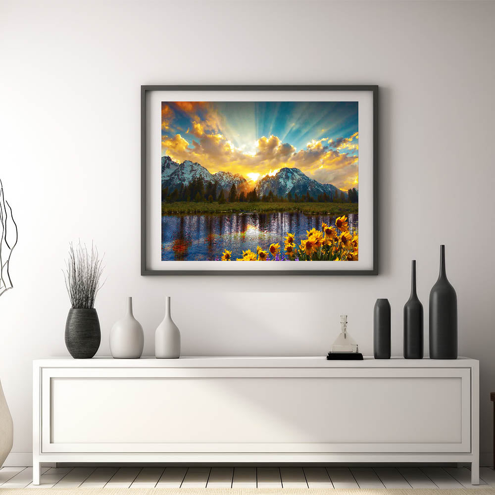 Bring the breathtaking beauty of Wyoming’s Grand Teton Range into your home with this vibrant scenic print. Featuring a radiant sunrise casting golden rays over snow-capped peaks and reflecting in a peaceful lake, this artwork is perfect for nature lovers. The foreground is adorned with vivid yellow wildflowers, adding warmth and contrast to the majestic mountain backdrop. This stunning print will enhance any space with its vibrant colors and serene landscape.
