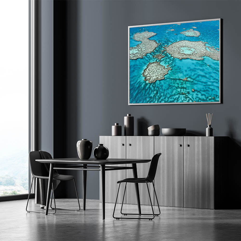 Dive into the breathtaking beauty of Australia's Great Barrier Reef with this captivating wall art. Showcasing vibrant coral formations and crystal-clear turquoise waters, this artwork captures the essence of one of the world's most iconic natural wonders. Perfect for ocean lovers, it brings an element of tropical tranquility to any room, providing a serene and awe-inspiring view of marine life.