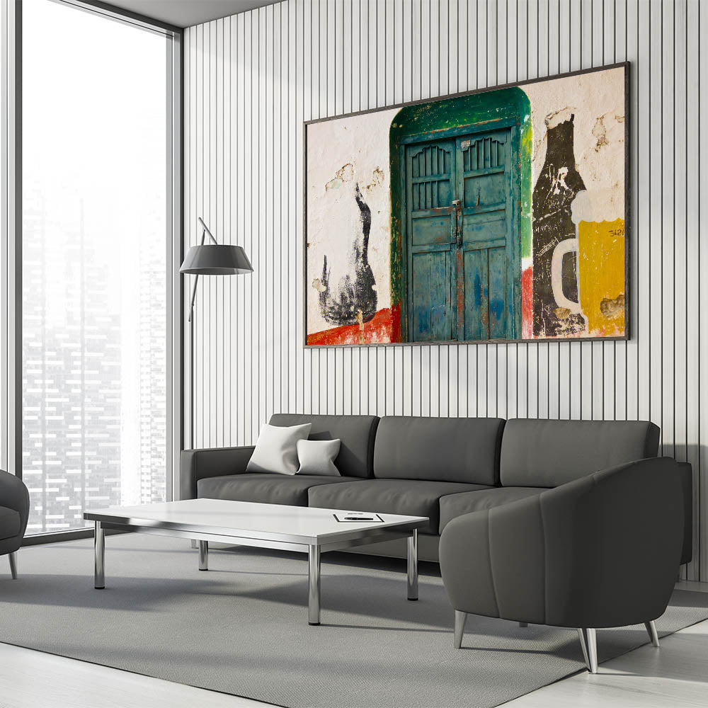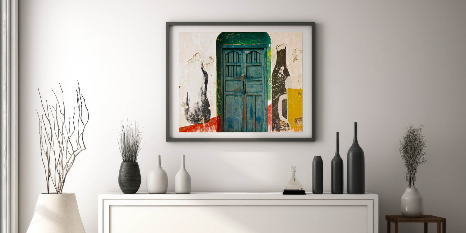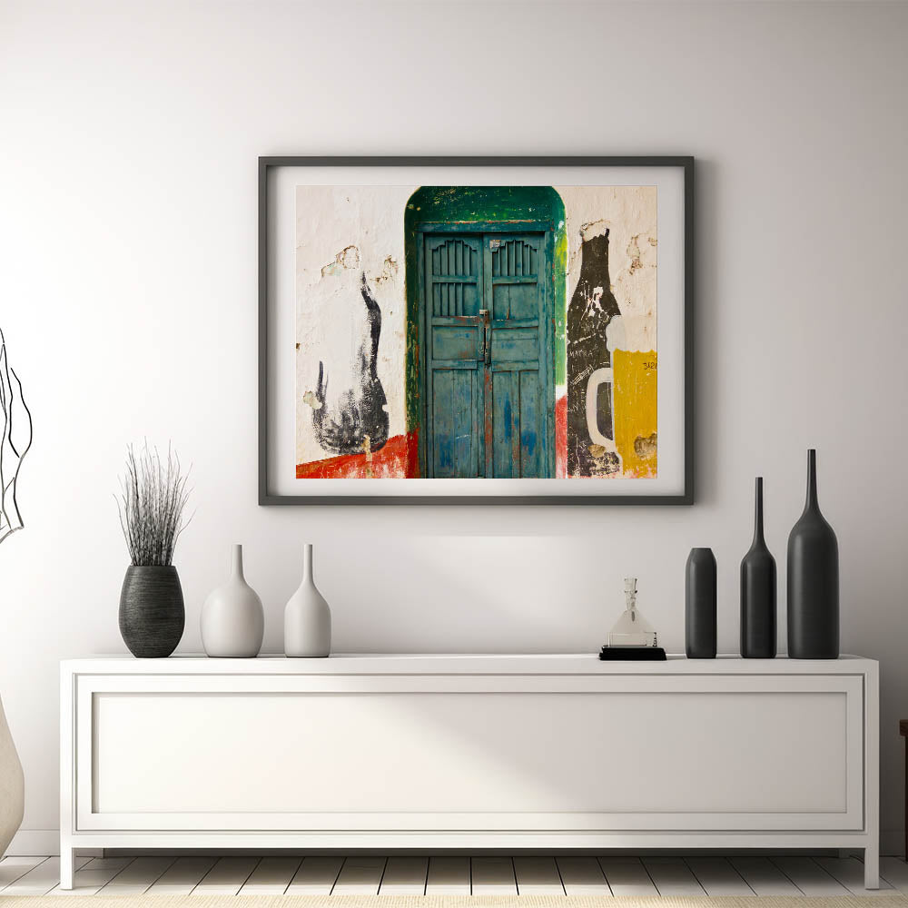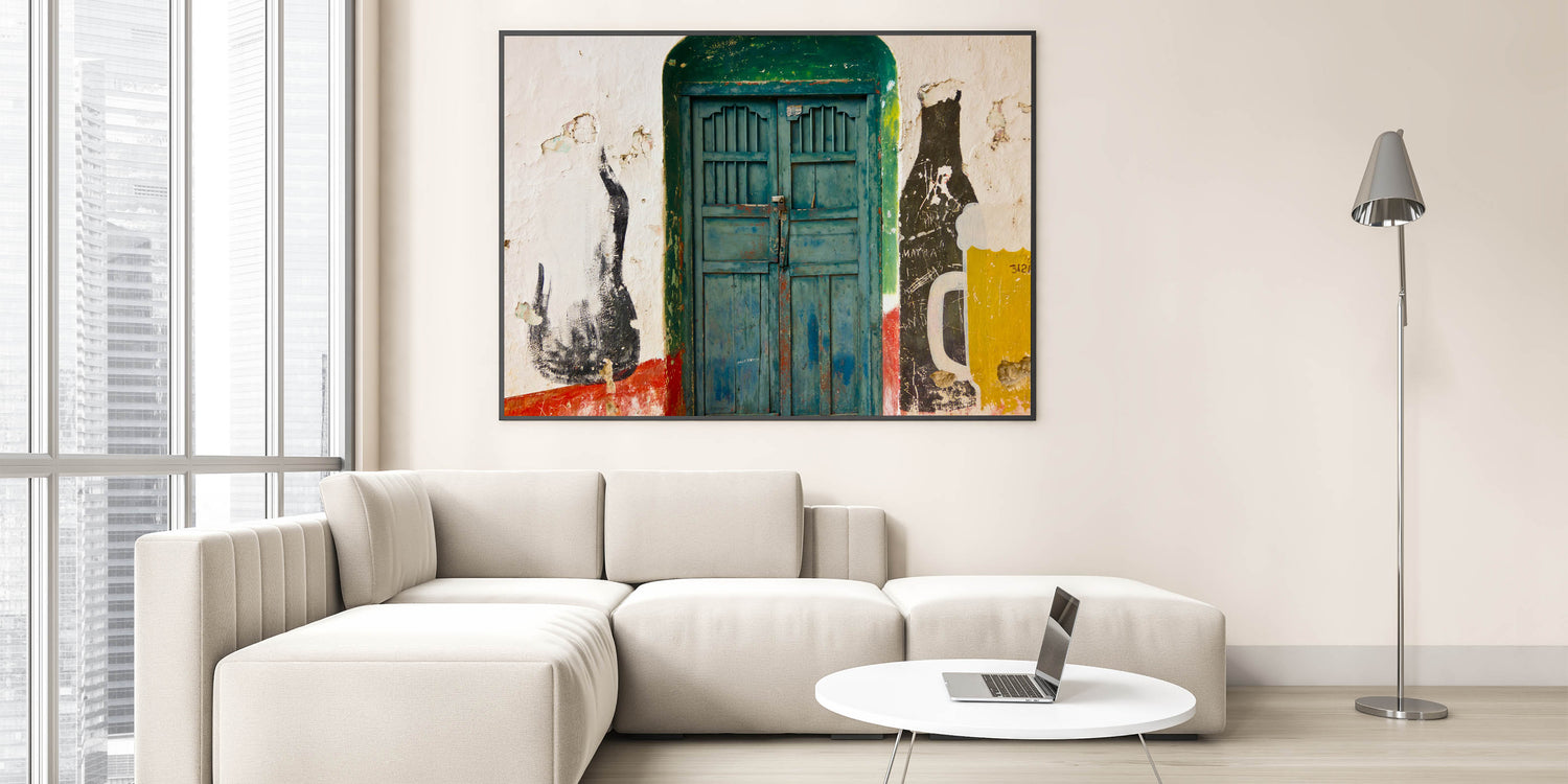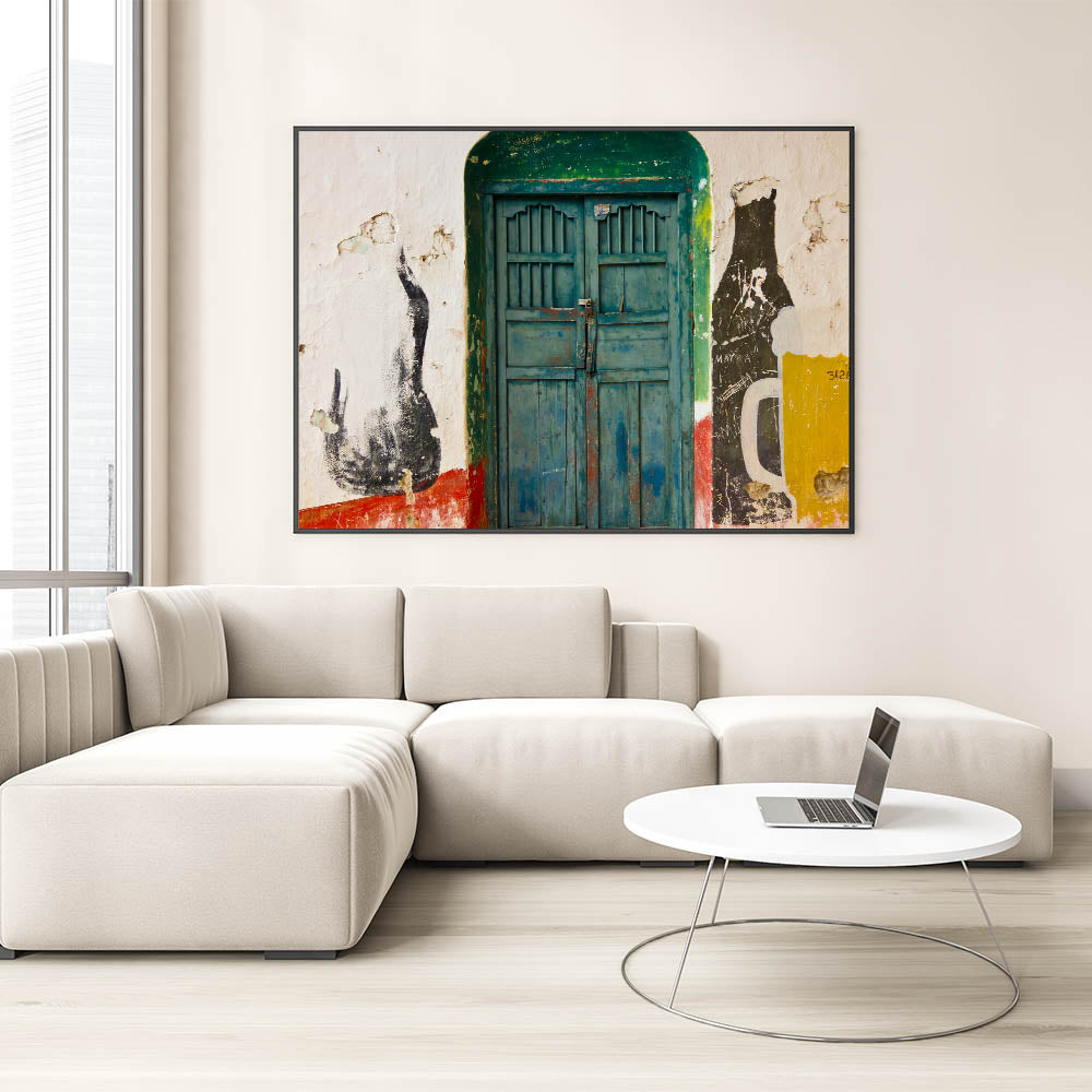 Explore the rustic charm of Antigua, Guatemala with our "Time-Worn Antigua Doorway" wall art. This evocative piece captures the essence of Guatemalan culture, showcasing a vintage door against a textured wall, adorned with striking street art.