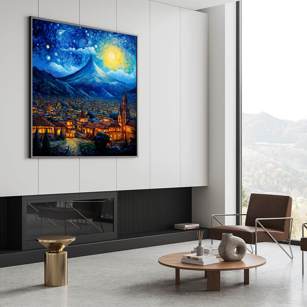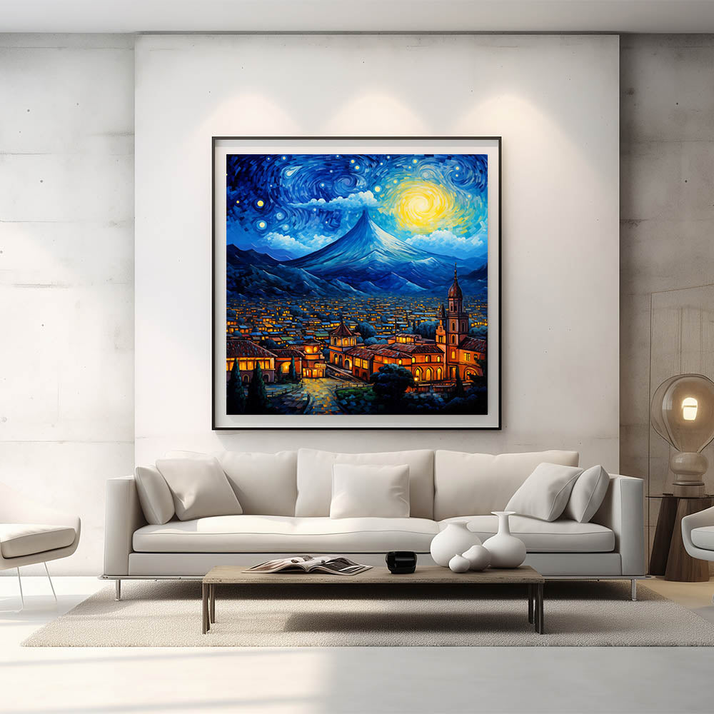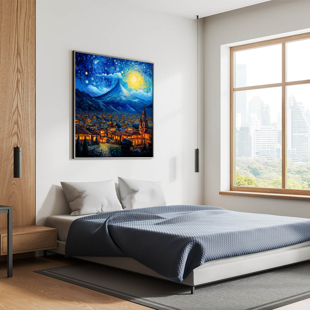 Starry Night over Antigua" is a mesmerizing addition to our Guatemalan Landscape Art collection. This painting captures the enchanting beauty of Antigua, Guatemala, under a vibrant, star-filled sky reminiscent of Van Gogh's style. The swirling stars and dynamic colors bring a magical atmosphere to the traditional architecture and peaceful mountain backdrop.