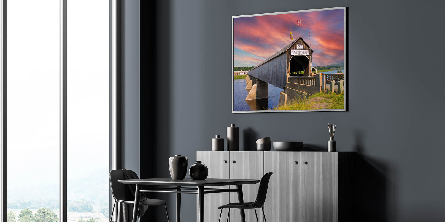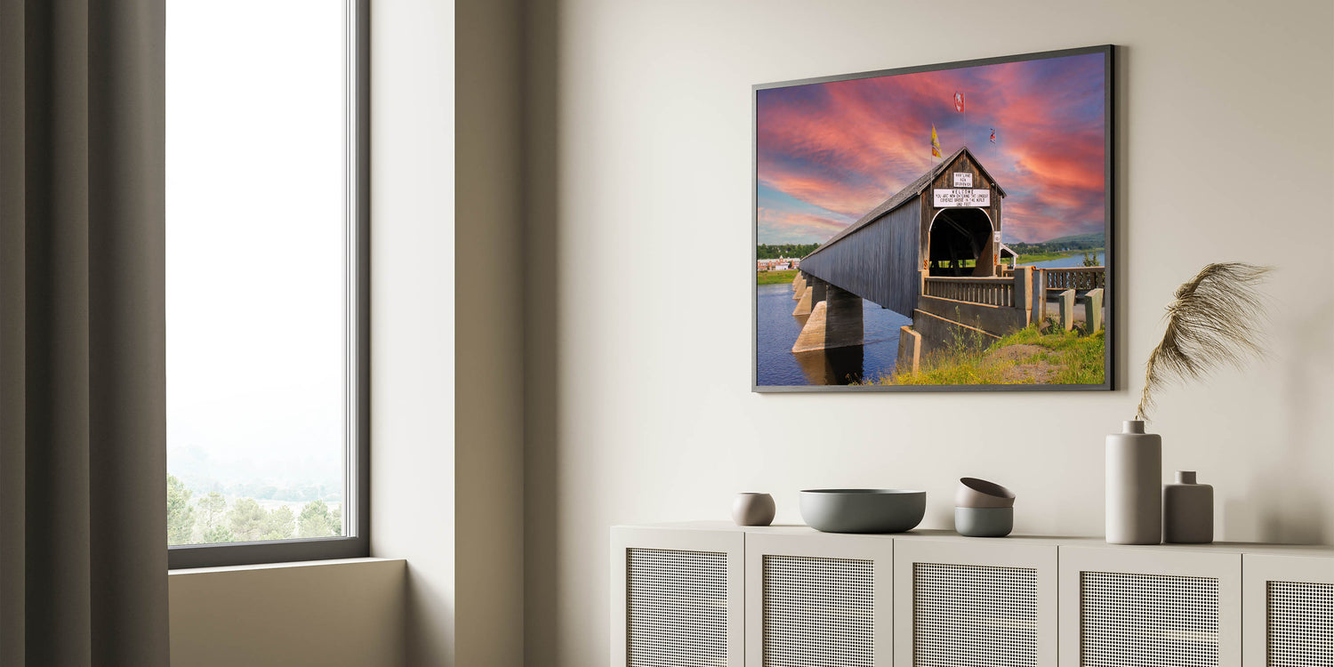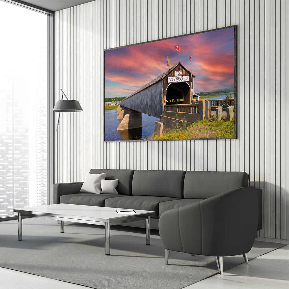 Capture the essence of history and architectural grandeur with this breathtaking wall art featuring the world’s longest covered bridge in Hartland, New Brunswick. As the sun sets behind the iconic bridge, the vibrant hues of the sky contrast beautifully with the rustic structure, creating a scene of peaceful reflection. This artwork is perfect for lovers of historical landmarks, architecture, and scenic landscapes, making it an ideal addition to any room seeking a blend of history and natural beauty.
