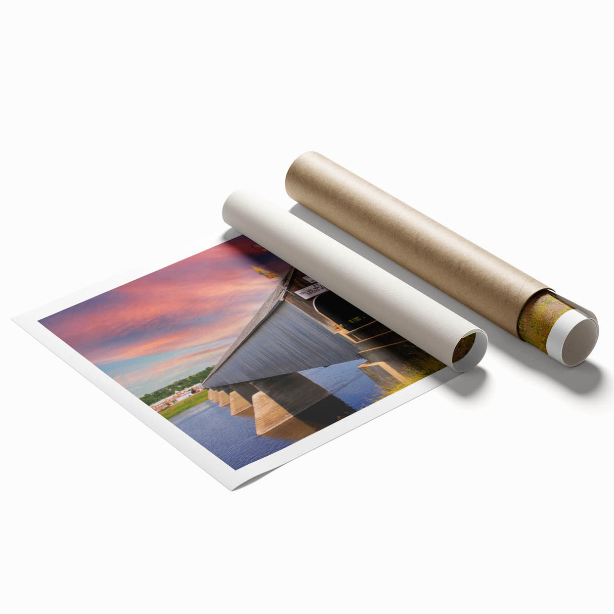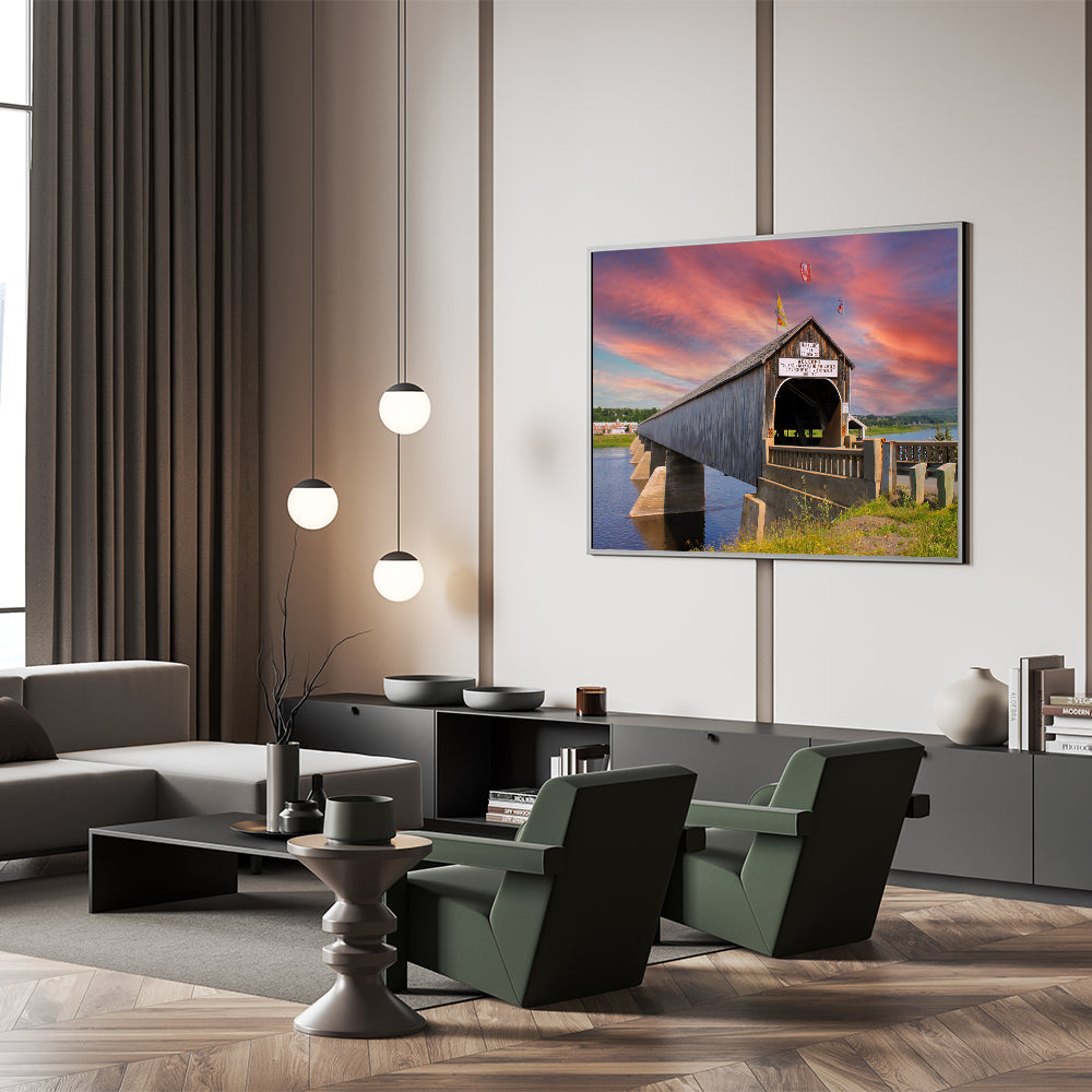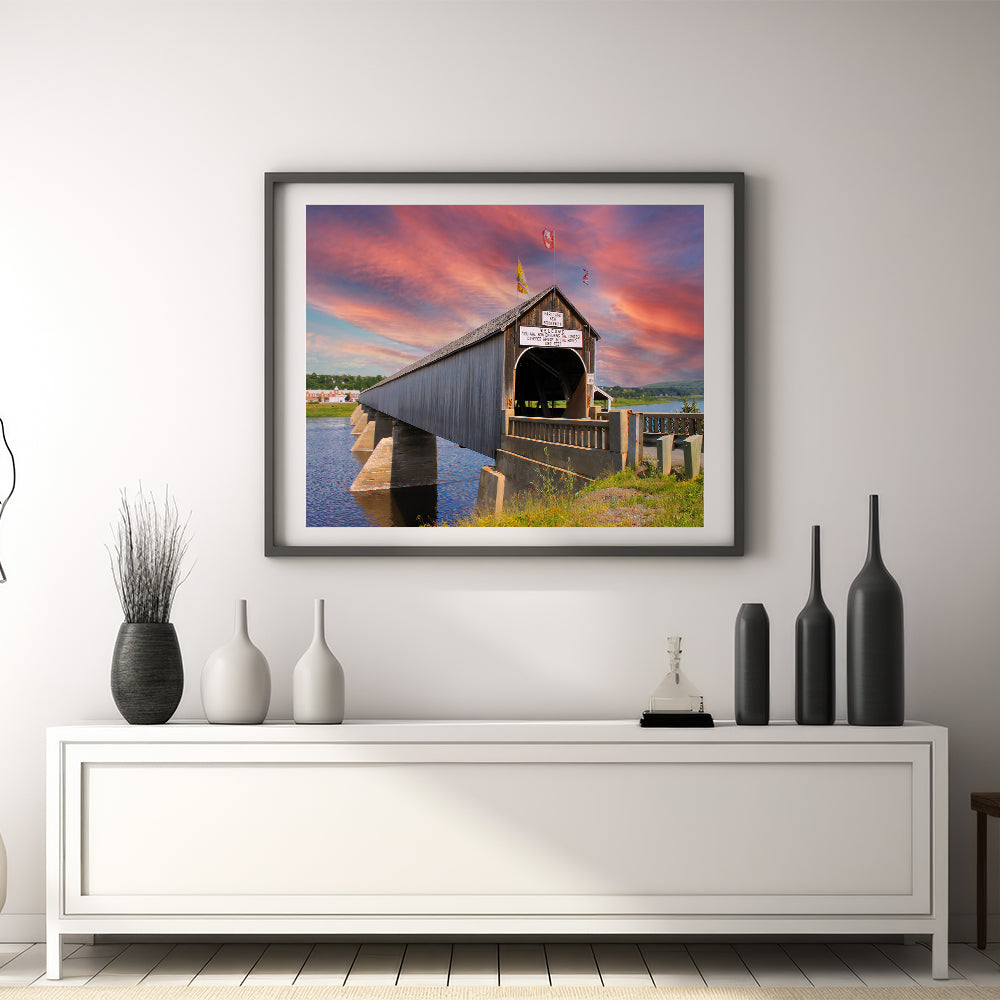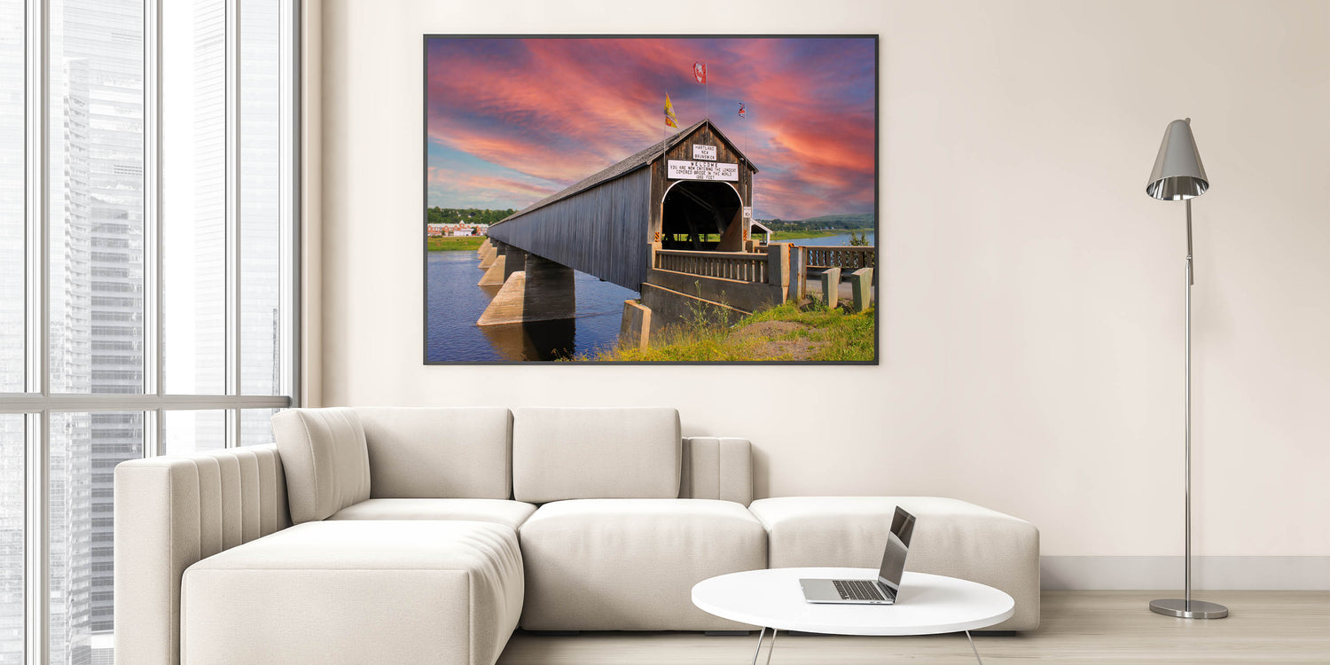 Capture the essence of history and architectural grandeur with this breathtaking wall art featuring the world’s longest covered bridge in Hartland, New Brunswick. As the sun sets behind the iconic bridge, the vibrant hues of the sky contrast beautifully with the rustic structure, creating a scene of peaceful reflection. This artwork is perfect for lovers of historical landmarks, architecture, and scenic landscapes, making it an ideal addition to any room seeking a blend of history and natural beauty.