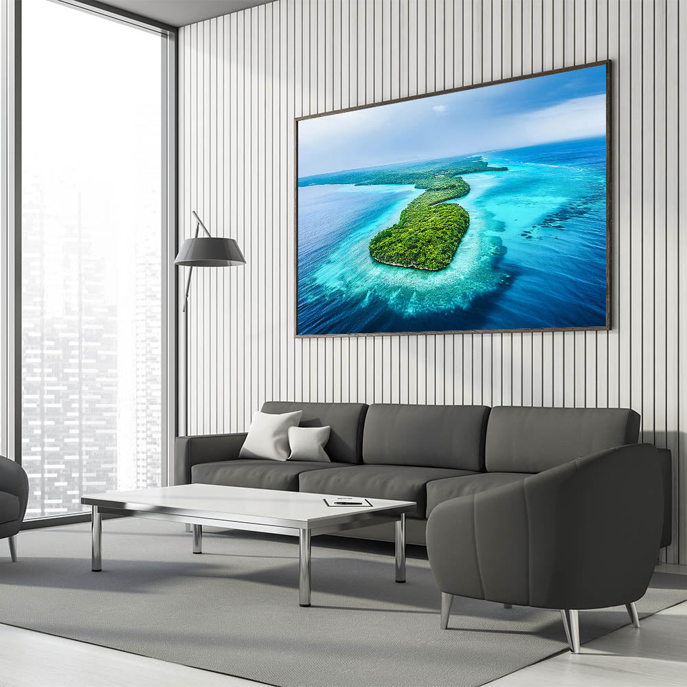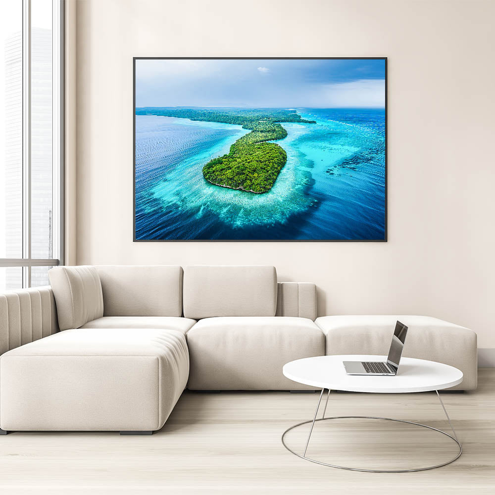 Capture the unique charm of Micronesia with our "Heart-Shaped Island Art Print" from the Pacific Ocean Art collection. This exceptional print offers a breathtaking aerial view of a naturally heart-shaped island, surrounded by the stunning turquoise waters of the Pacific.