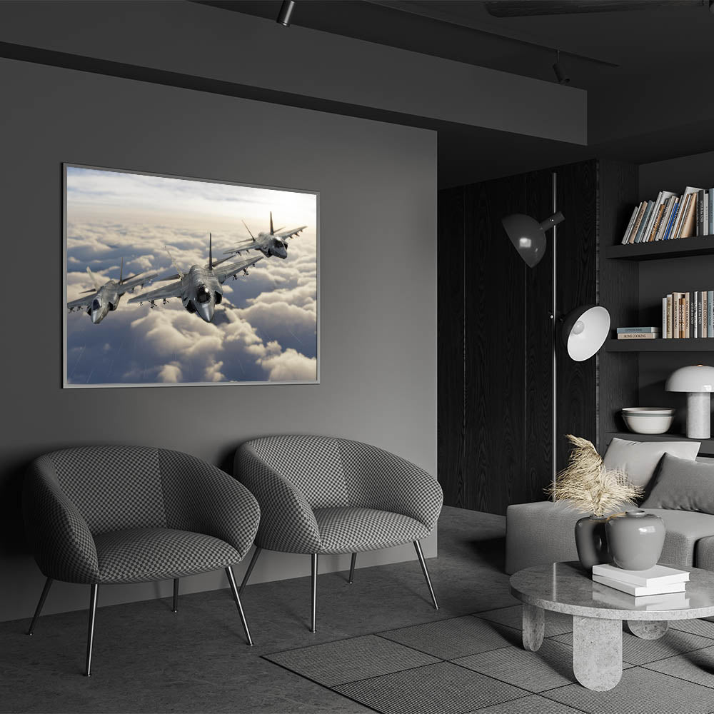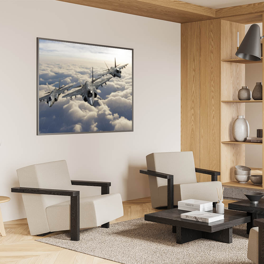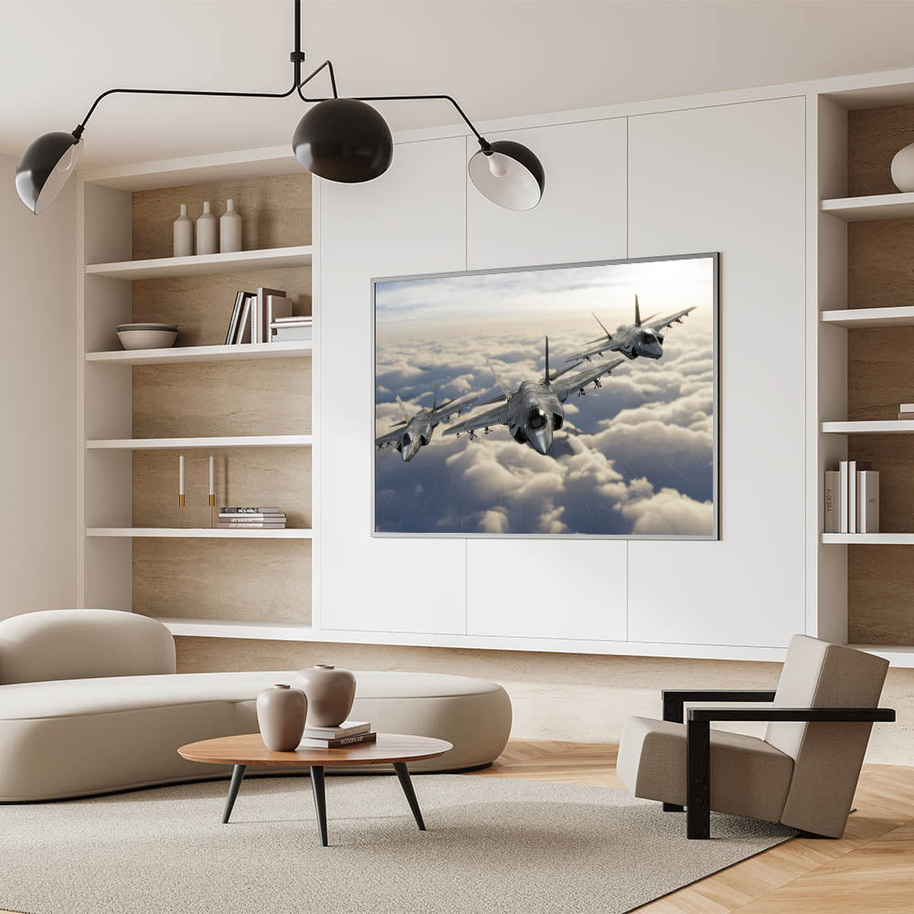 Elevate your home decor with this stunning piece of aviation art, featuring a powerful trio of jet planes soaring through the clouds. This breathtaking image captures the essence of modern aviation, making it an ideal addition to any space for aviation enthusiasts and those with a love for high-flying art. The detailed rendering of the aircraft against a soft cloud-filled sky creates a striking contrast that draws the eye and adds a dynamic sense of movement to your wall.