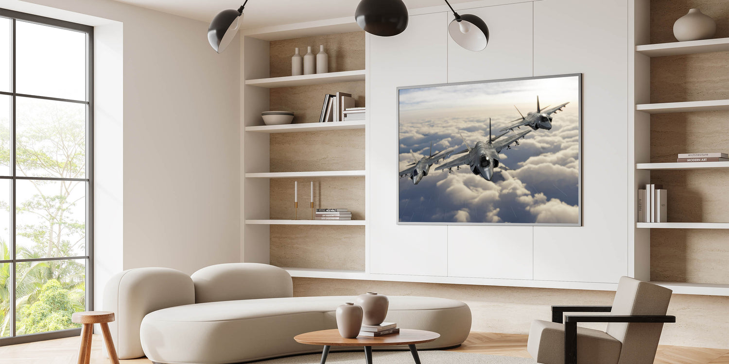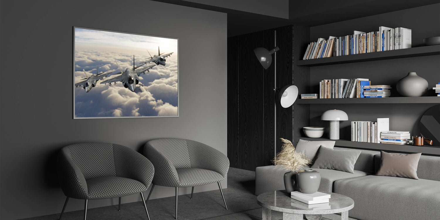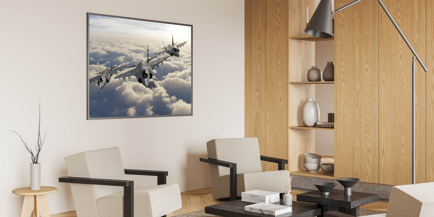 Elevate your home decor with this stunning piece of aviation art, featuring a powerful trio of jet planes soaring through the clouds. This breathtaking image captures the essence of modern aviation, making it an ideal addition to any space for aviation enthusiasts and those with a love for high-flying art. The detailed rendering of the aircraft against a soft cloud-filled sky creates a striking contrast that draws the eye and adds a dynamic sense of movement to your wall.
