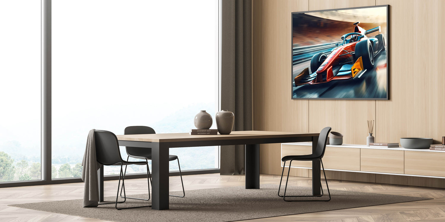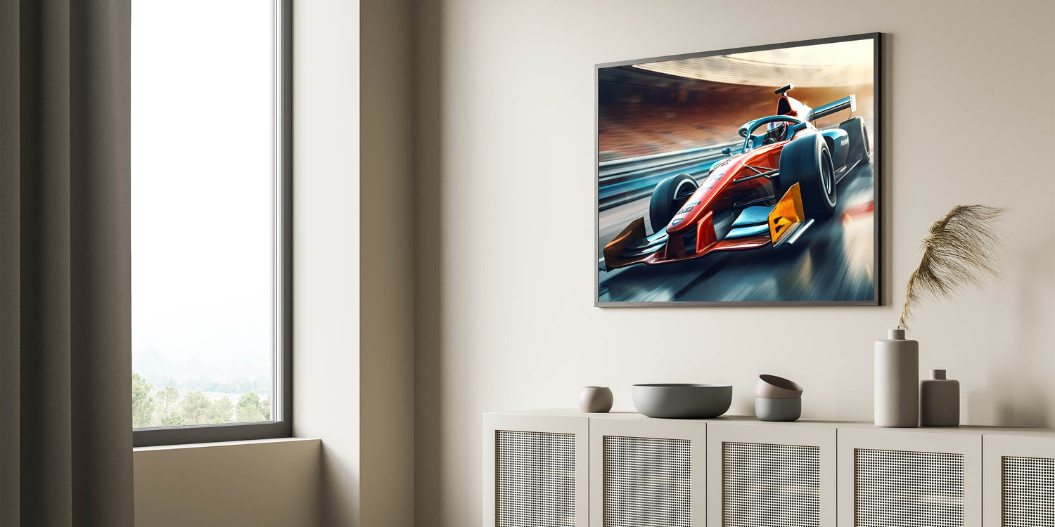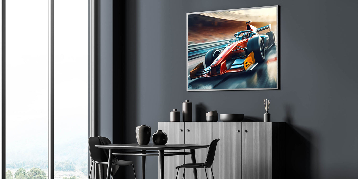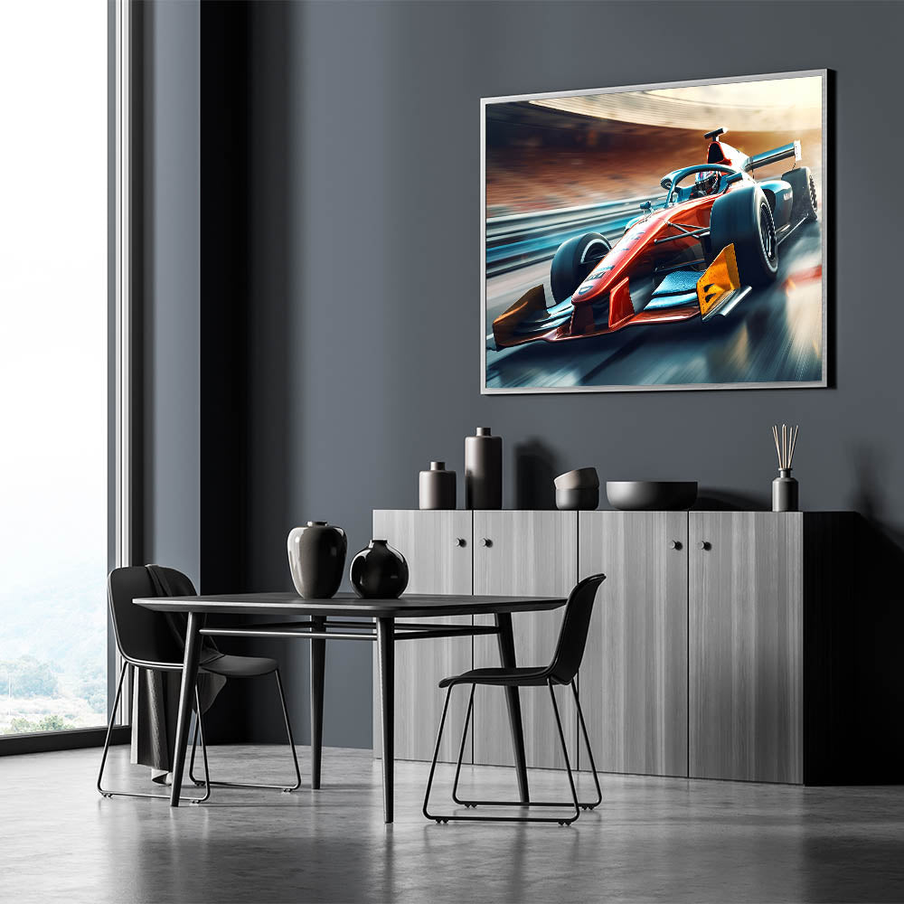 Rev up your decor with this powerful and visually striking Formula 1 art piece. Its dynamic lines and vibrant colors will energize any space and make a bold statement.