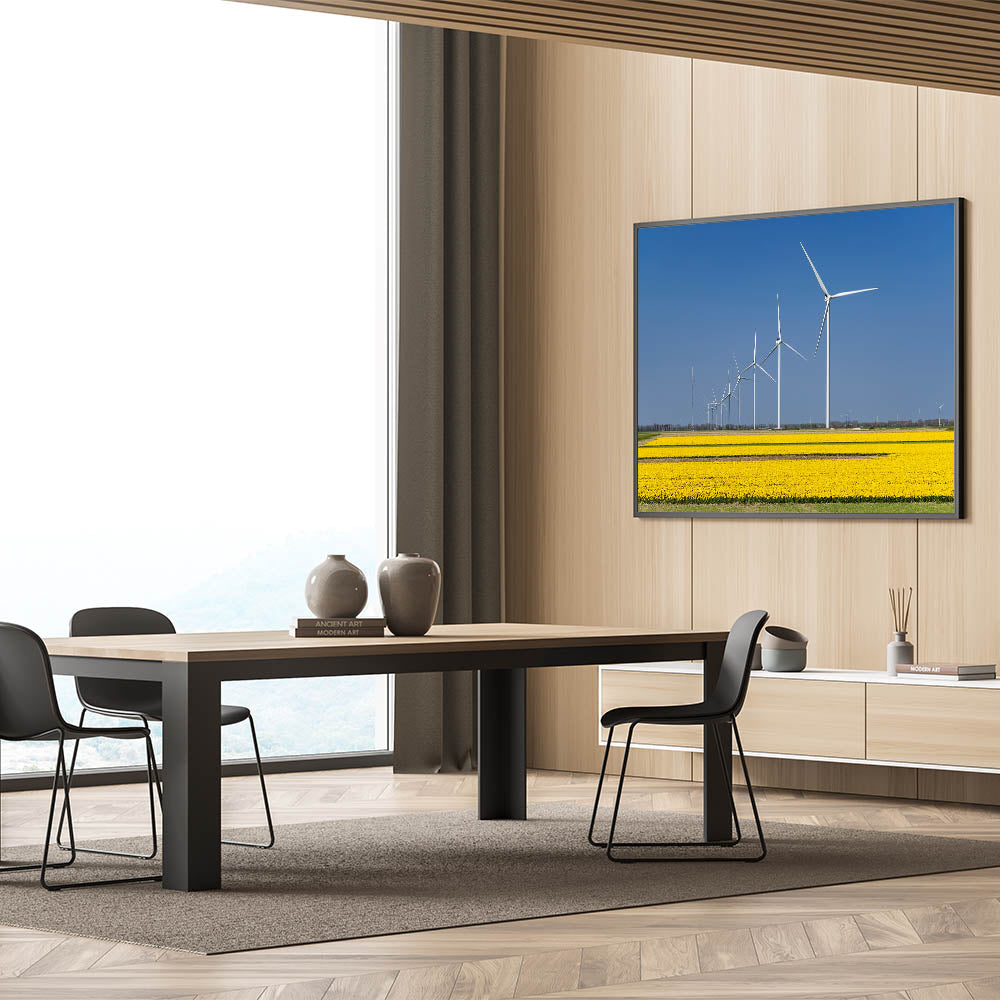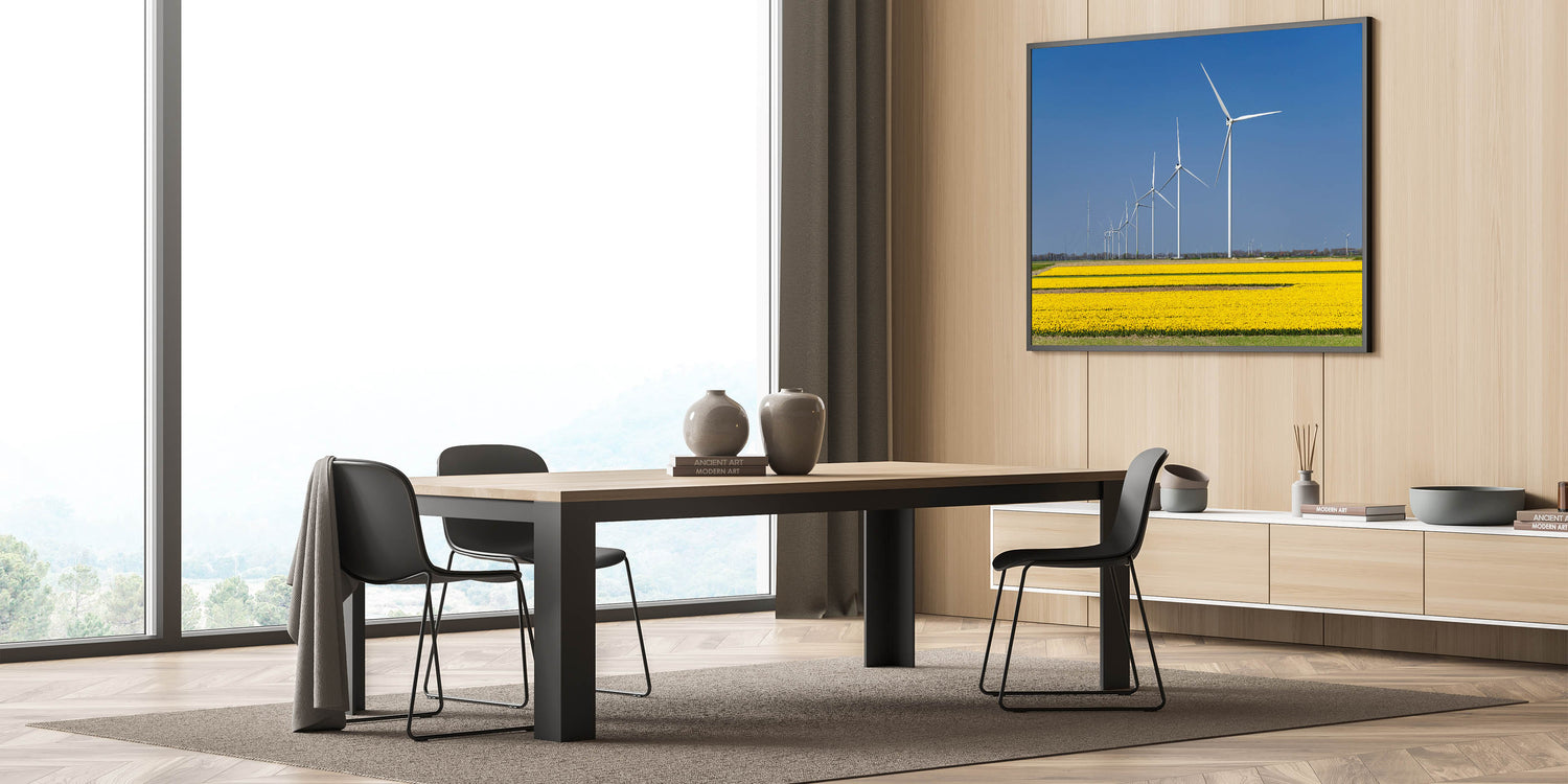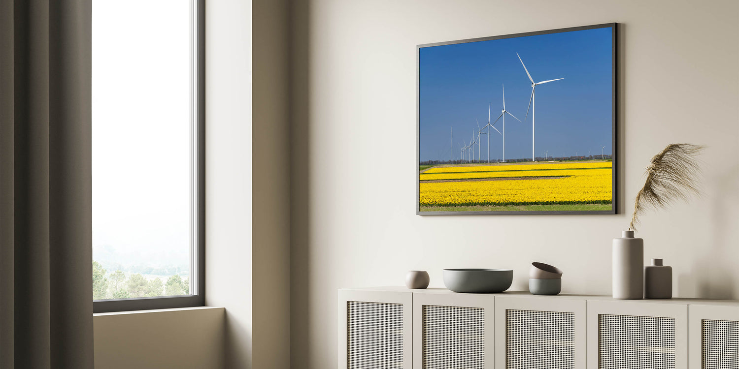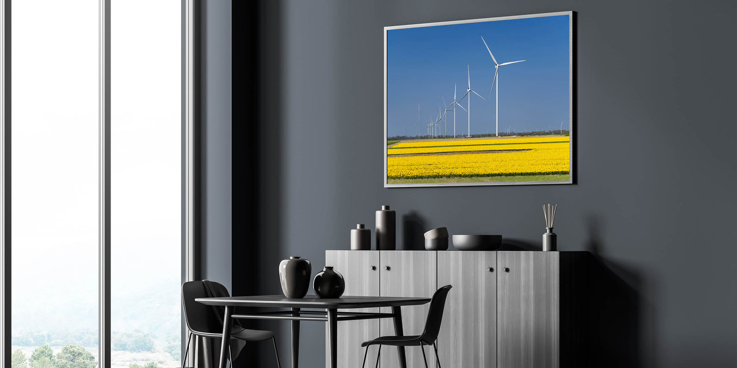 This Holland landscape print highlights the perfect blend of nature and technology, making it a great addition to any room with a modern or nature-inspired theme. Bring the beauty of the Netherlands into your home with this captivating piece.