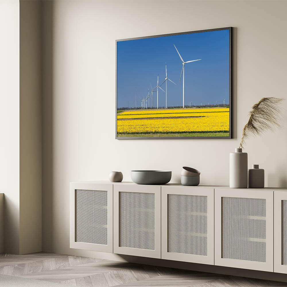 Embrace the balance of nature and modern innovation with this striking wall art showcasing Holland’s iconic yellow tulip fields and wind turbines. This artwork captures the harmony between the natural beauty of blooming tulips and the sleek, modern design of wind turbines against a clear blue sky. Ideal for nature lovers and those who appreciate eco-friendly landscapes, this piece adds a fresh, modern touch to any space.