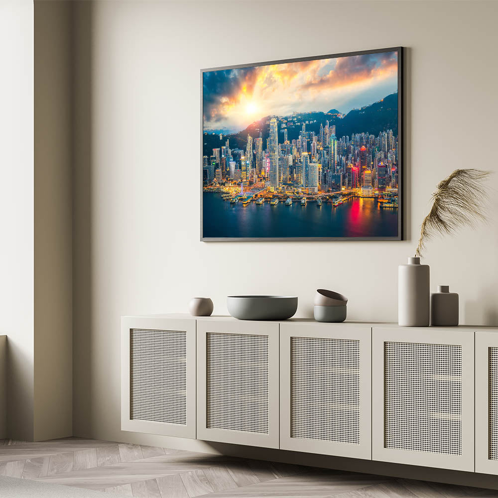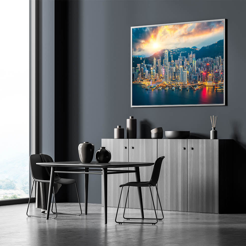 Experience the dazzling beauty of Hong Kong’s skyline with this breathtaking wall art featuring Victoria Harbour illuminated by the glow of a brilliant sunset. The rich colors of the city’s towering skyscrapers reflect across the harbor, creating a striking visual contrast between modern architecture and natural beauty. This artwork is the perfect way to bring a dynamic and captivating cityscape into your living room, office, or modern décor setting.