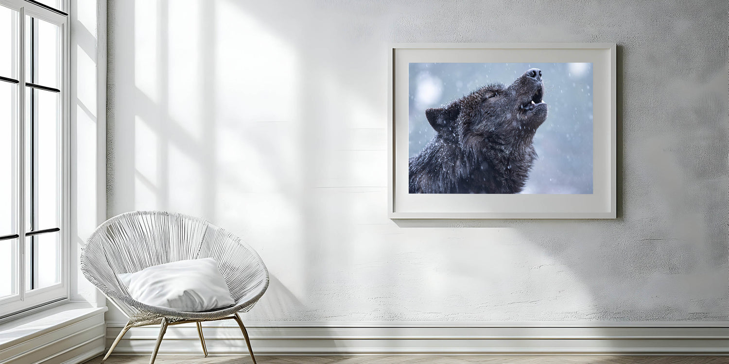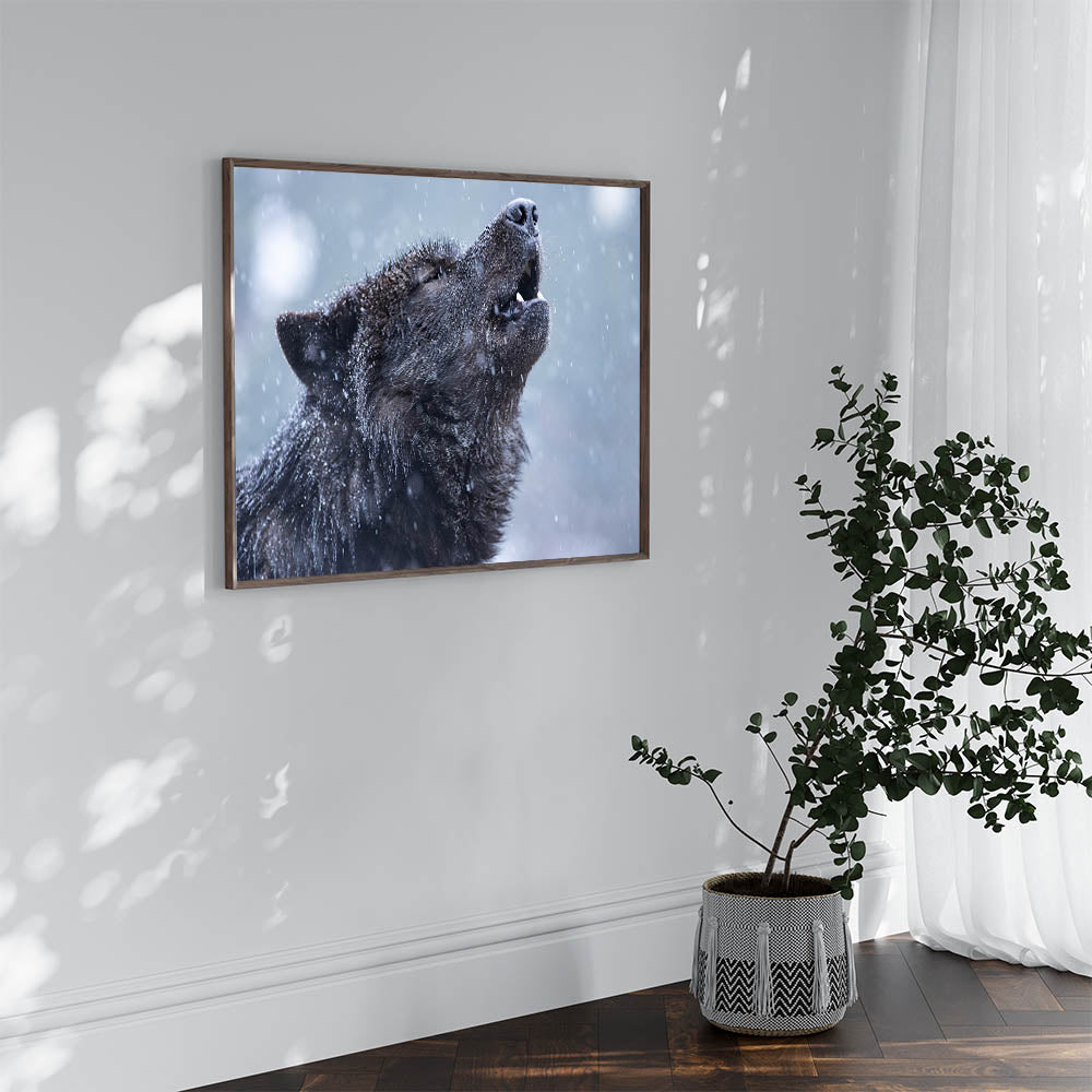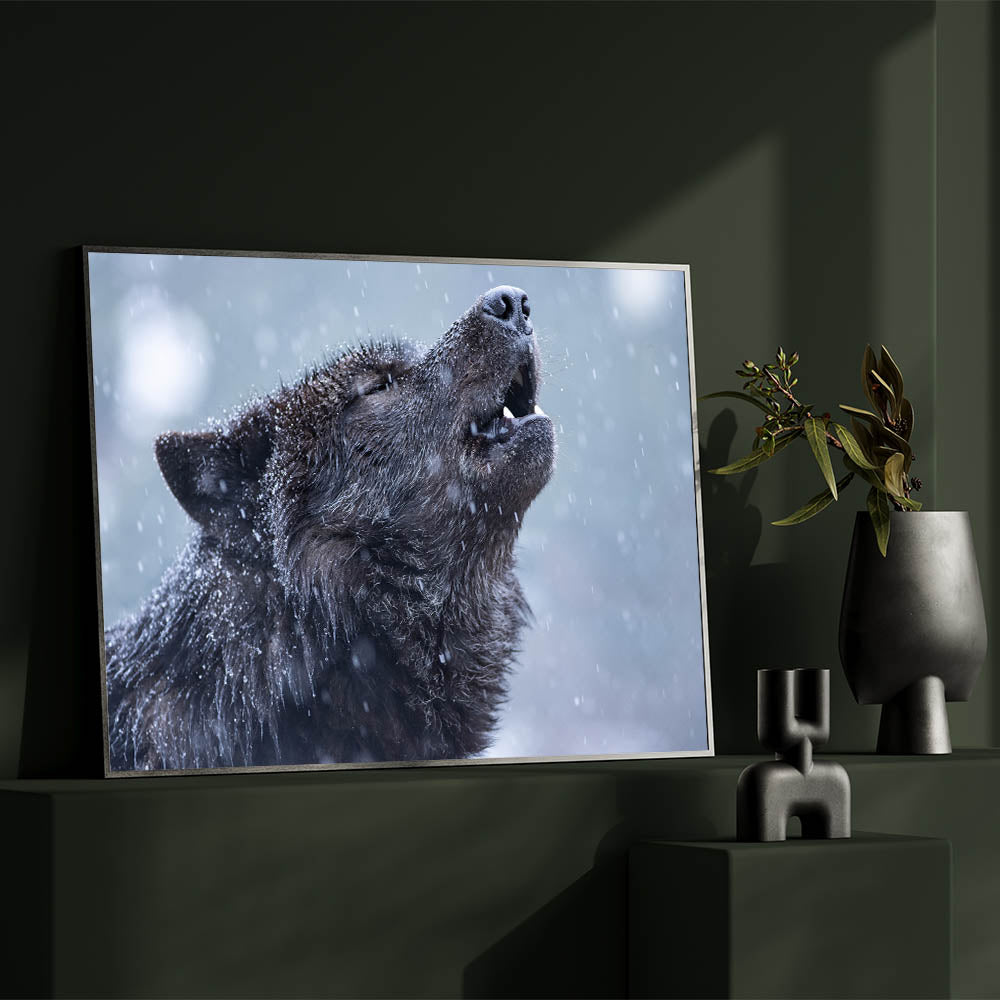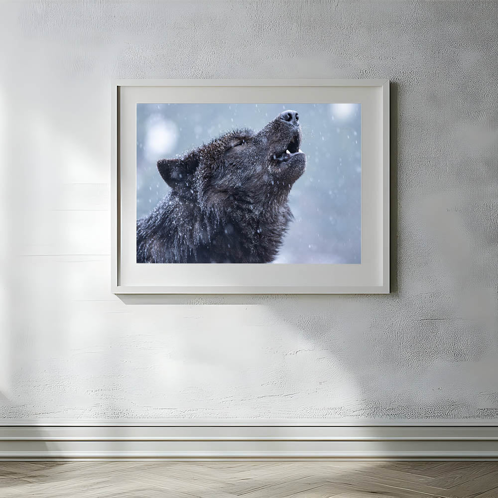 Embrace the raw beauty of the wilderness with this captivating howling wolf in snow art. The detailed depiction of the wolf, caught in a moment of powerful expression amidst a gentle snowfall, evokes a sense of strength and solitude. The contrast of the dark wolf against the soft, snowy background adds a dramatic and serene atmosphere, making this artwork a perfect addition to any nature-themed or rustic decor.