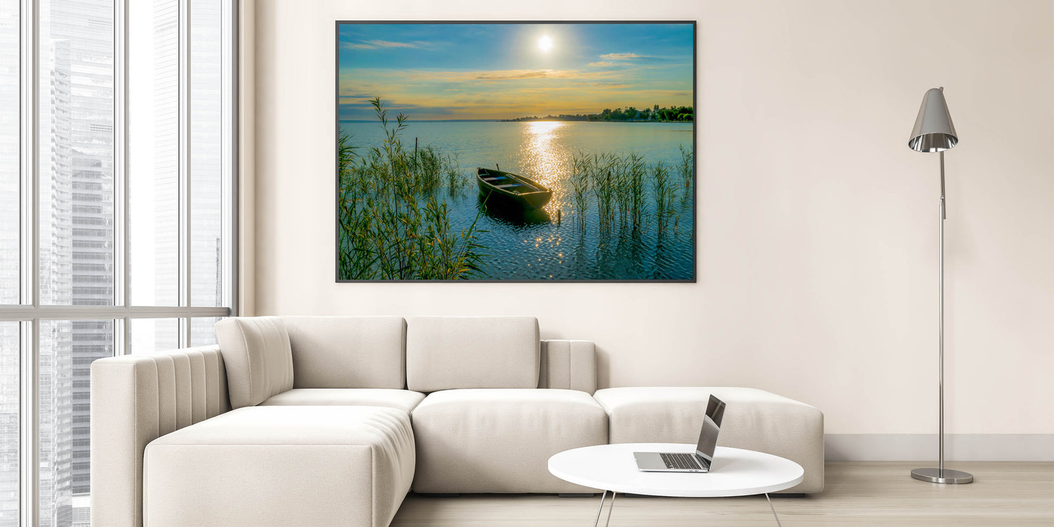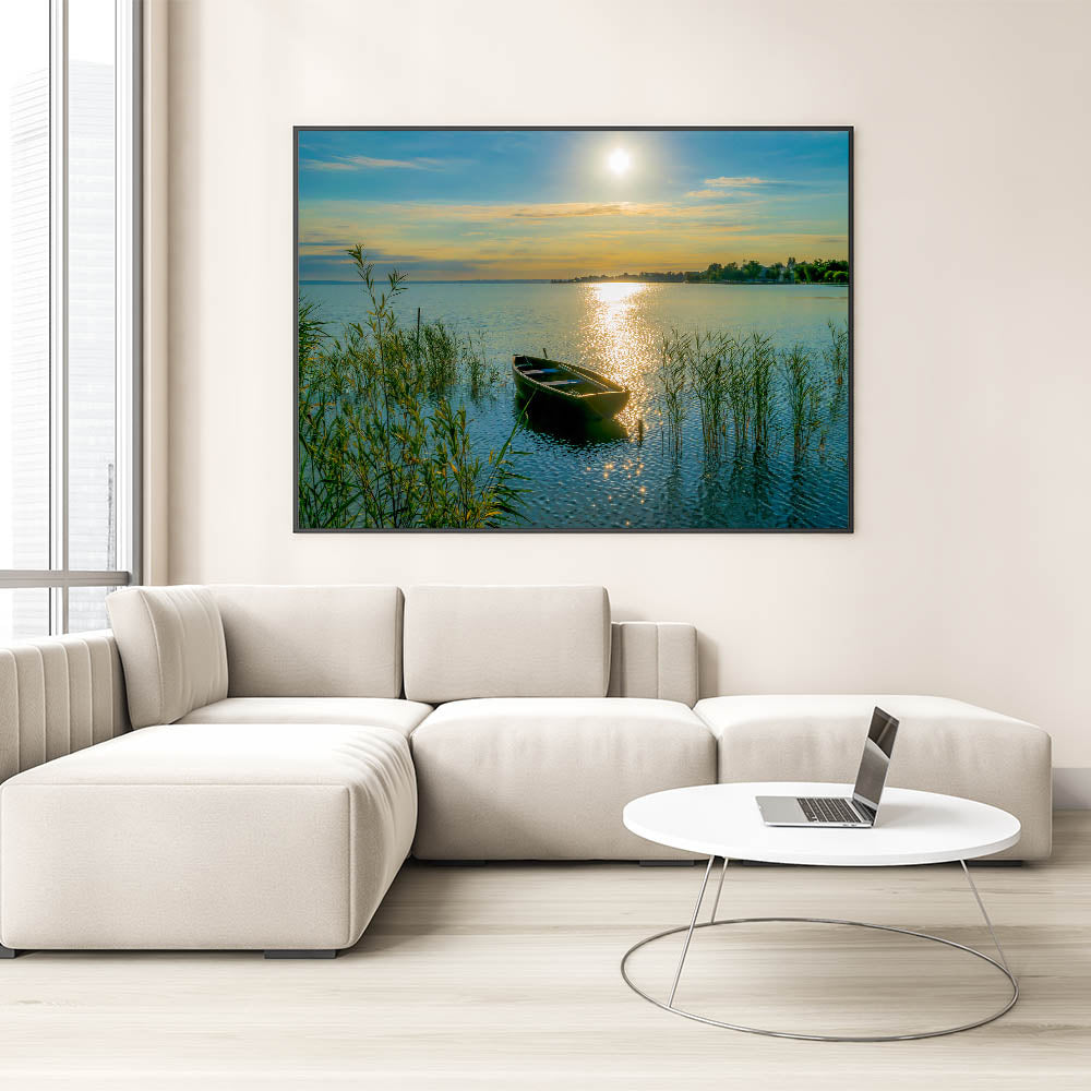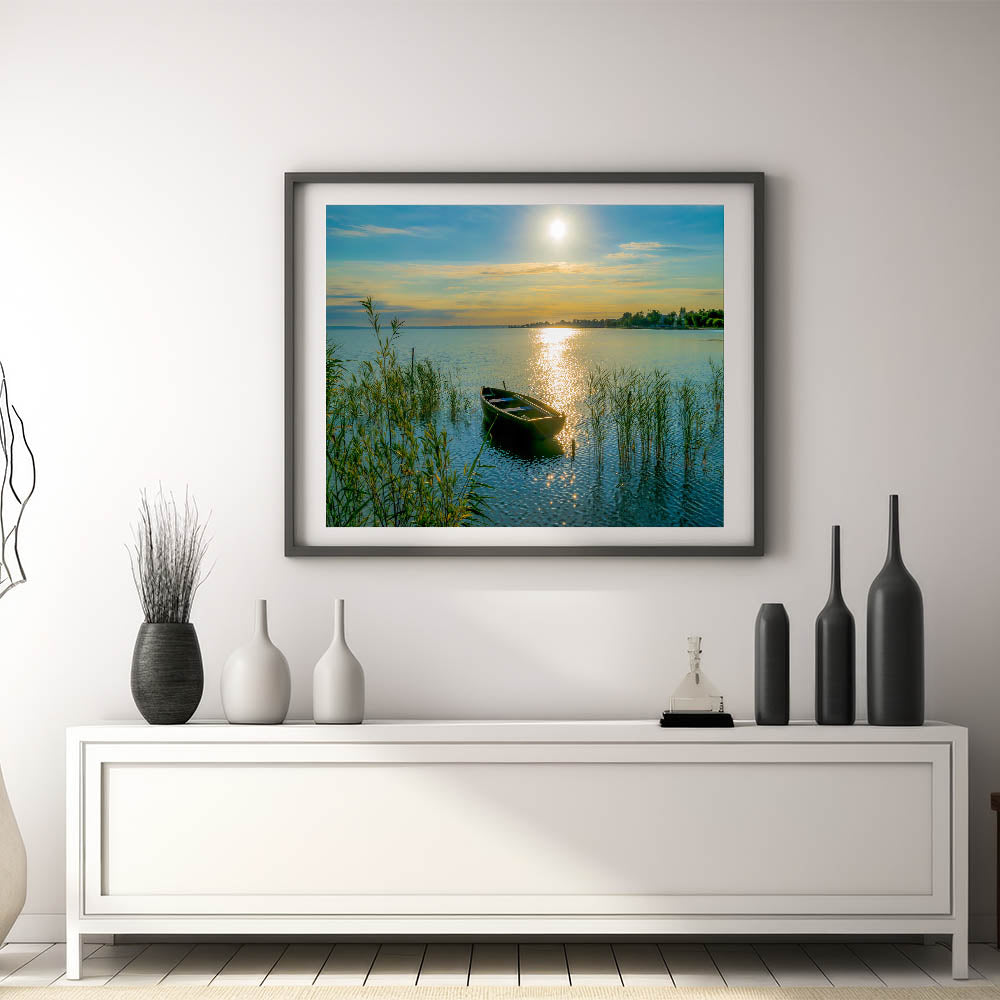 Complete your home decor with this serene lakeside sunrise print, perfect for creating a calming and beautiful focal point in any room.
